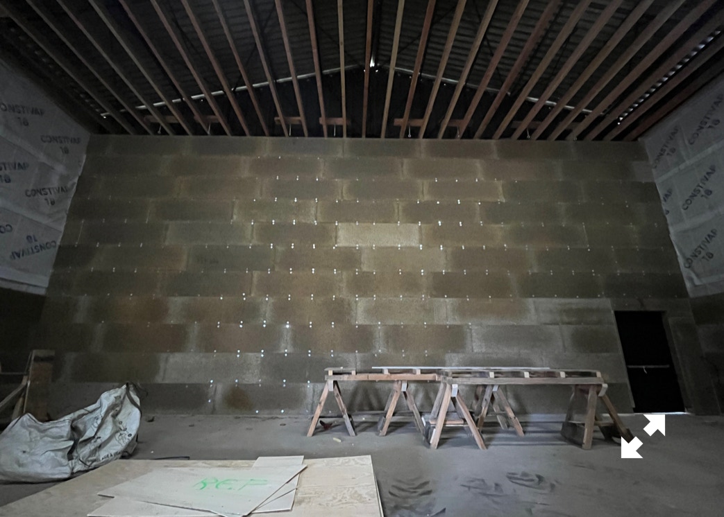 Traitement acoustique absorbant sur le mur vers l’est, terminé. Vue générale grand angle. 18 octobre 2024