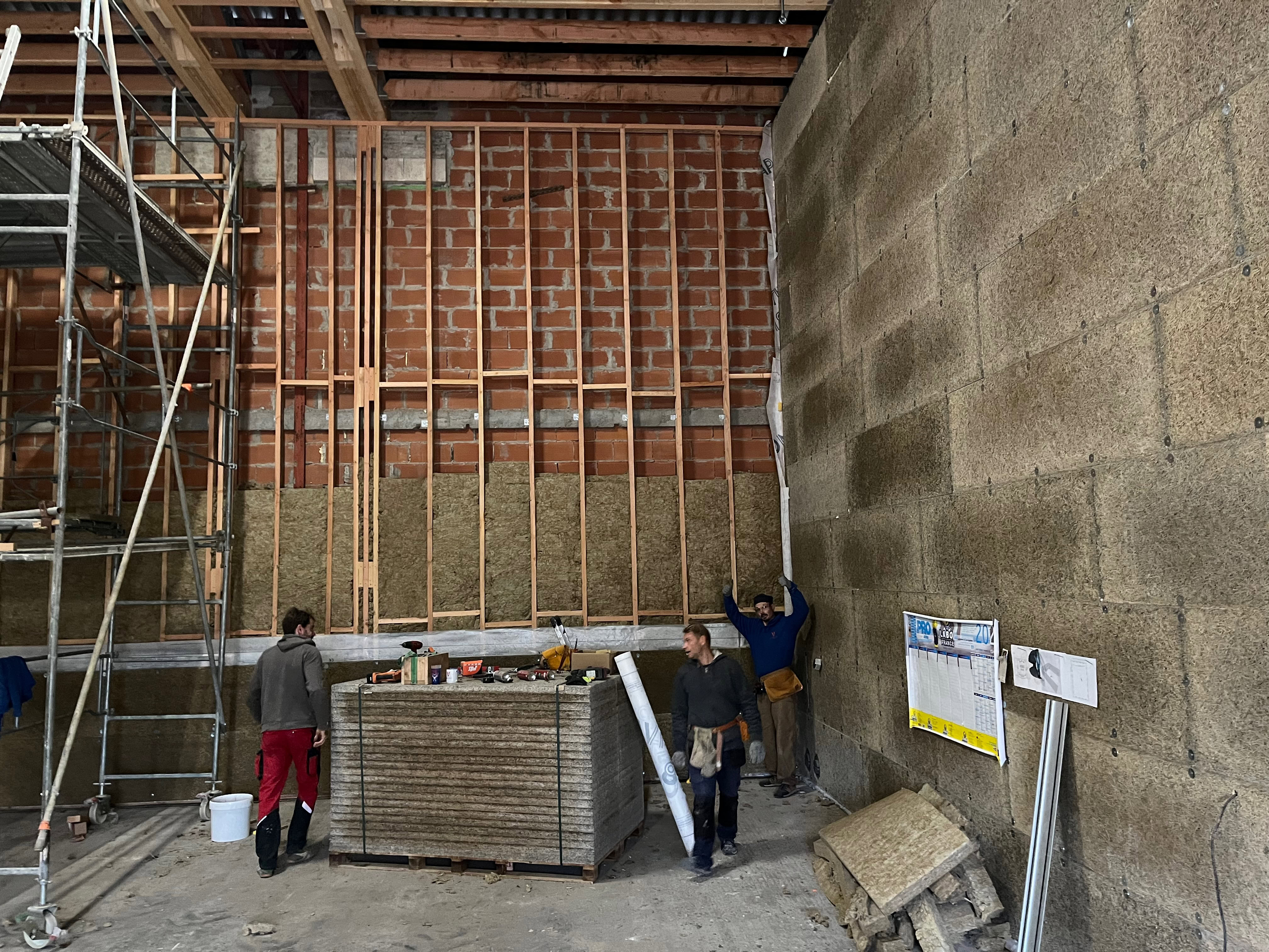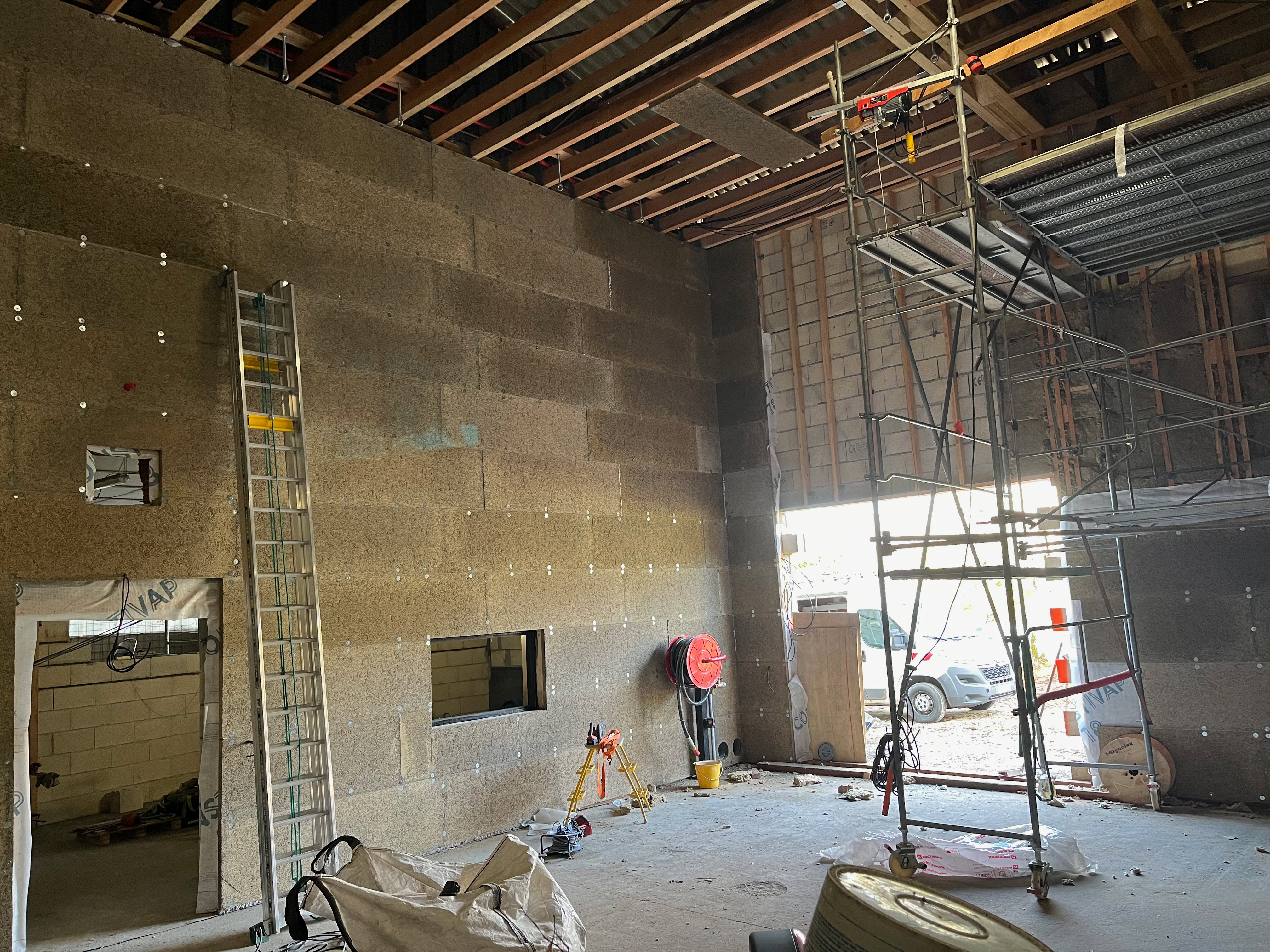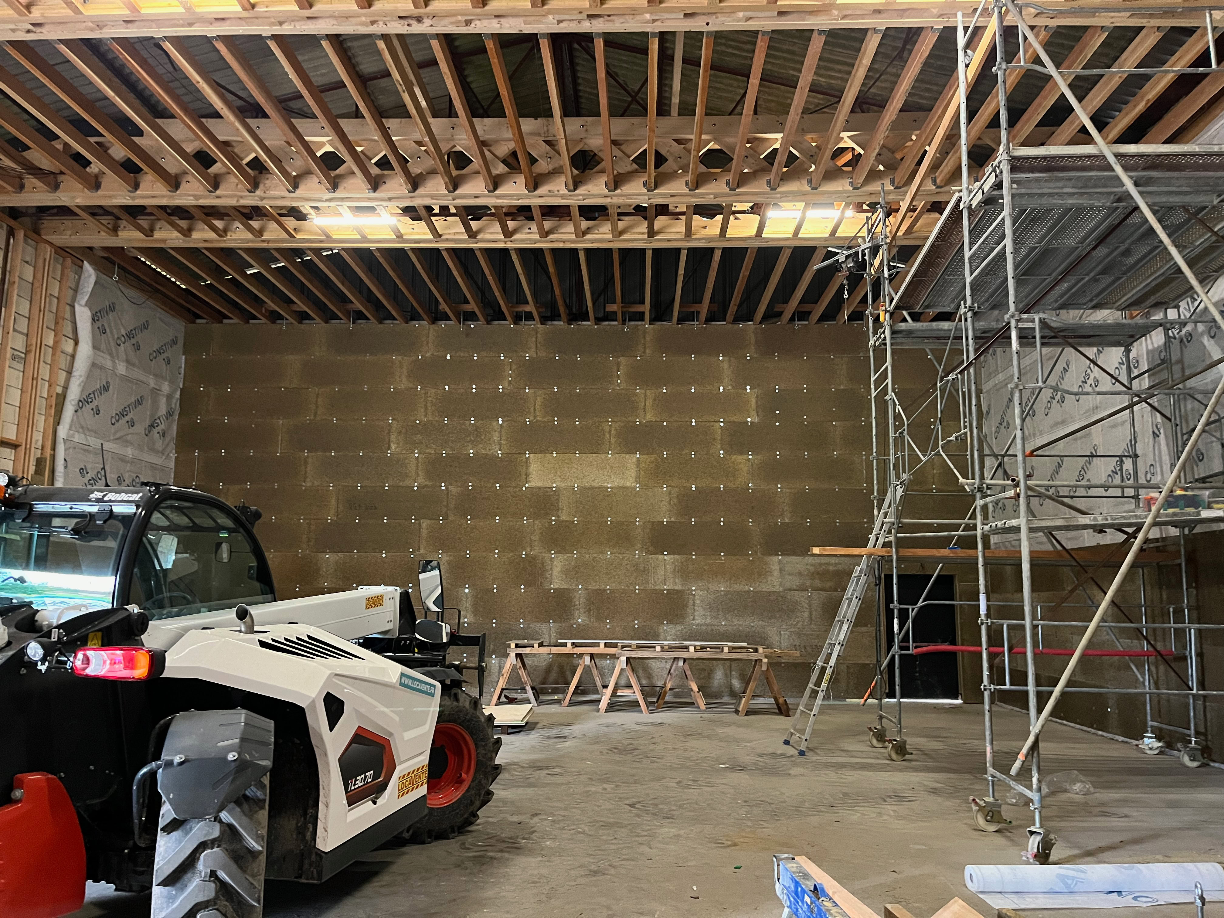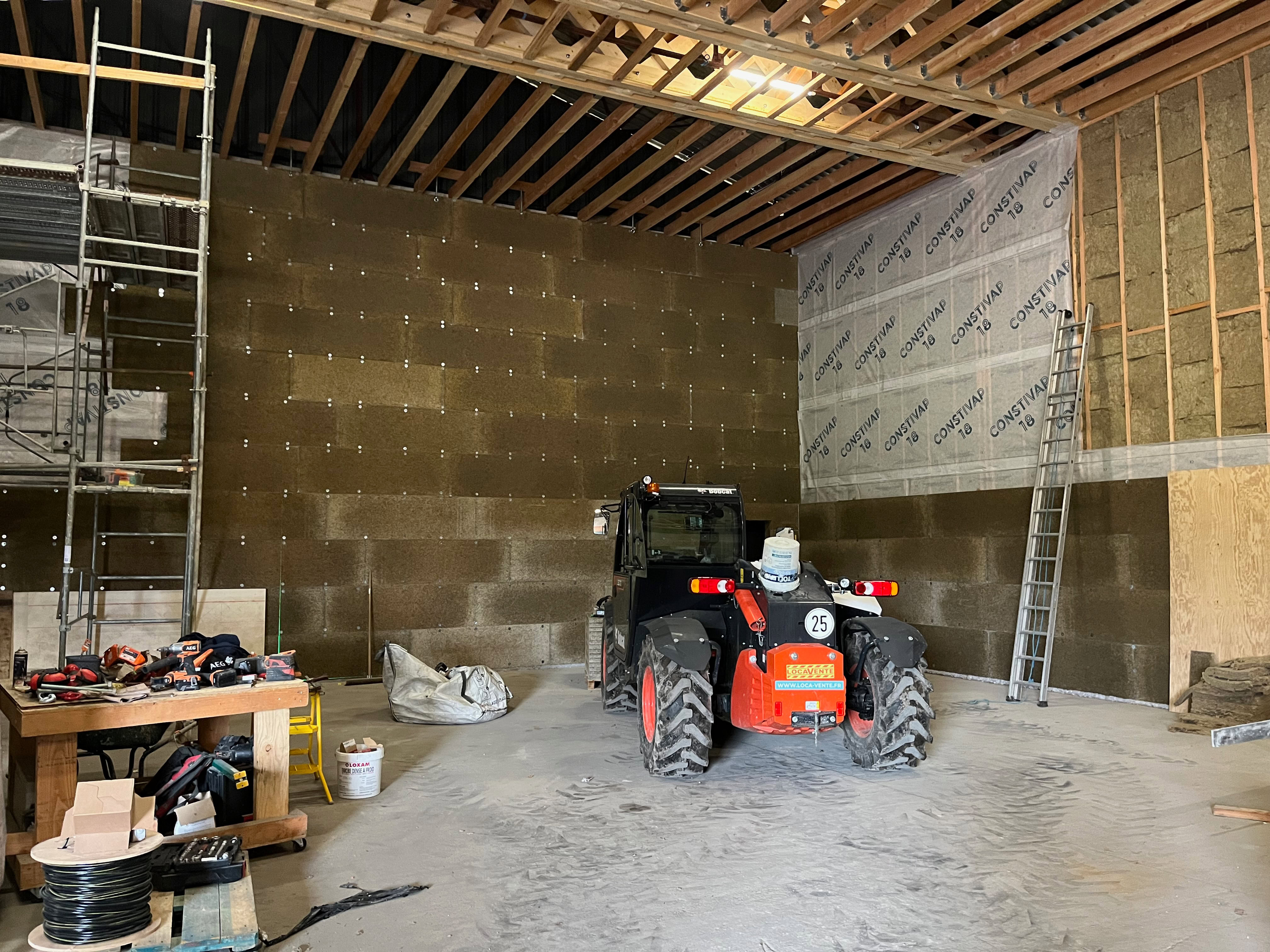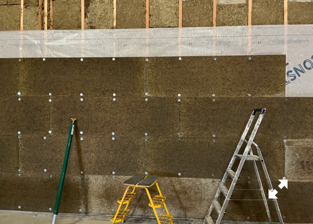 Pose terminée du Fibralith à l’angle nord-ouest. On observe à droite de l’angle l’emplacement de la porte principale (180 x 220 cm), à gauche de l’angle la lance de sécurité incendie. 22 novembre 2024