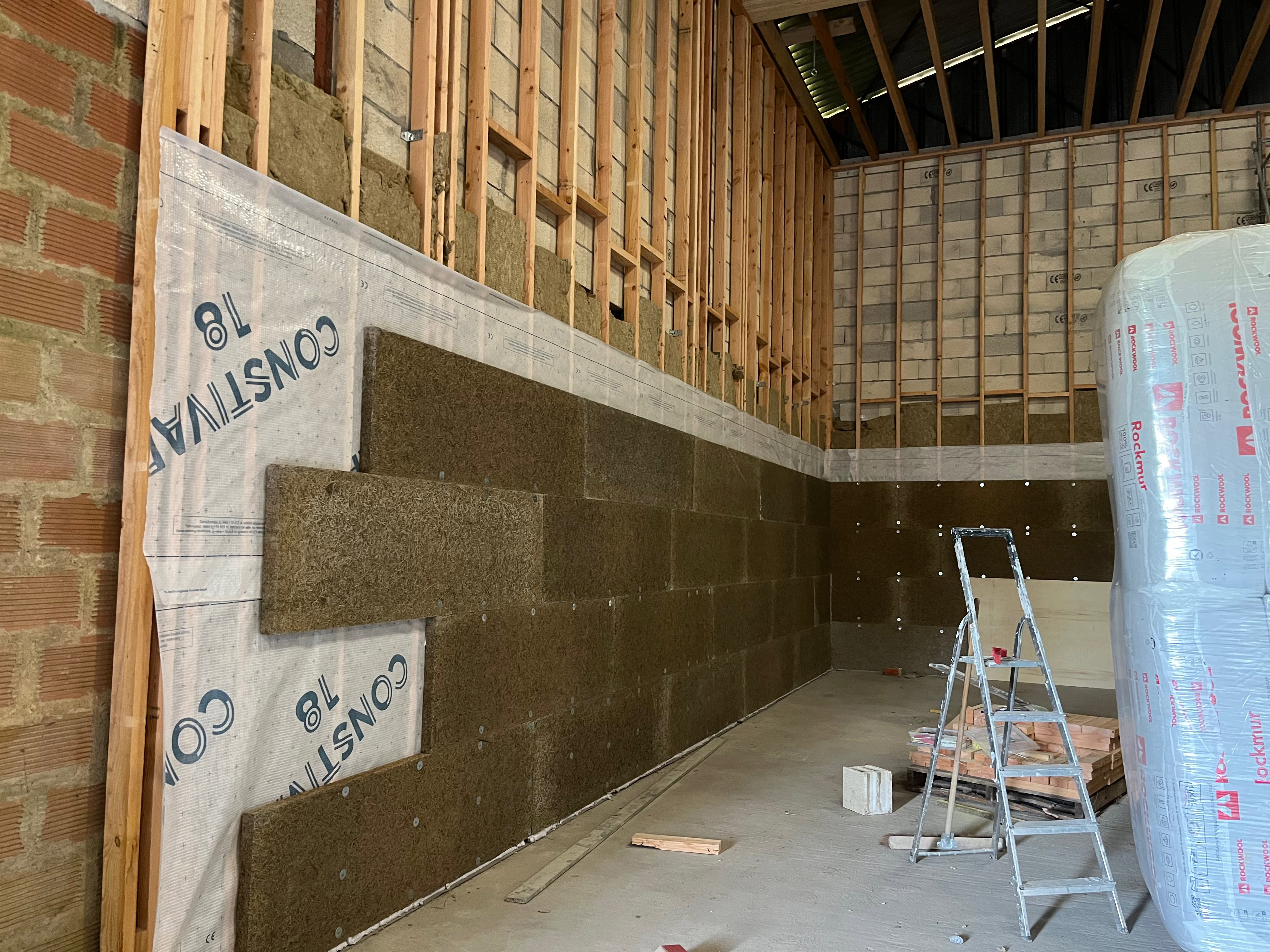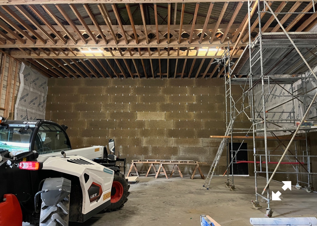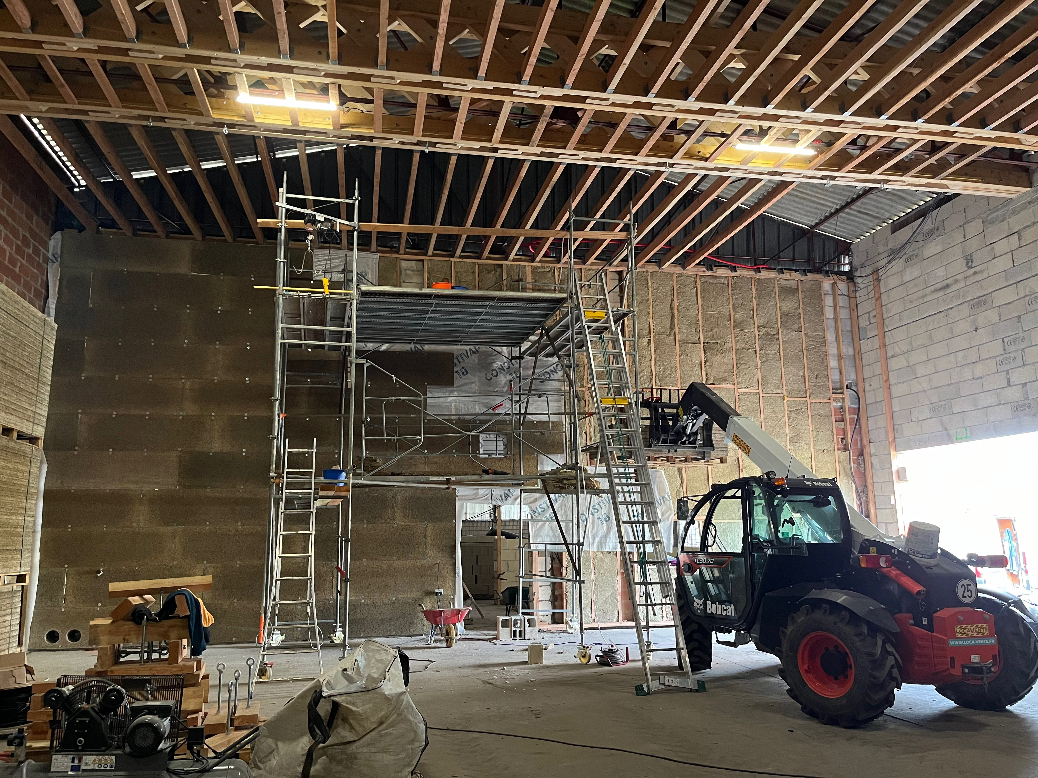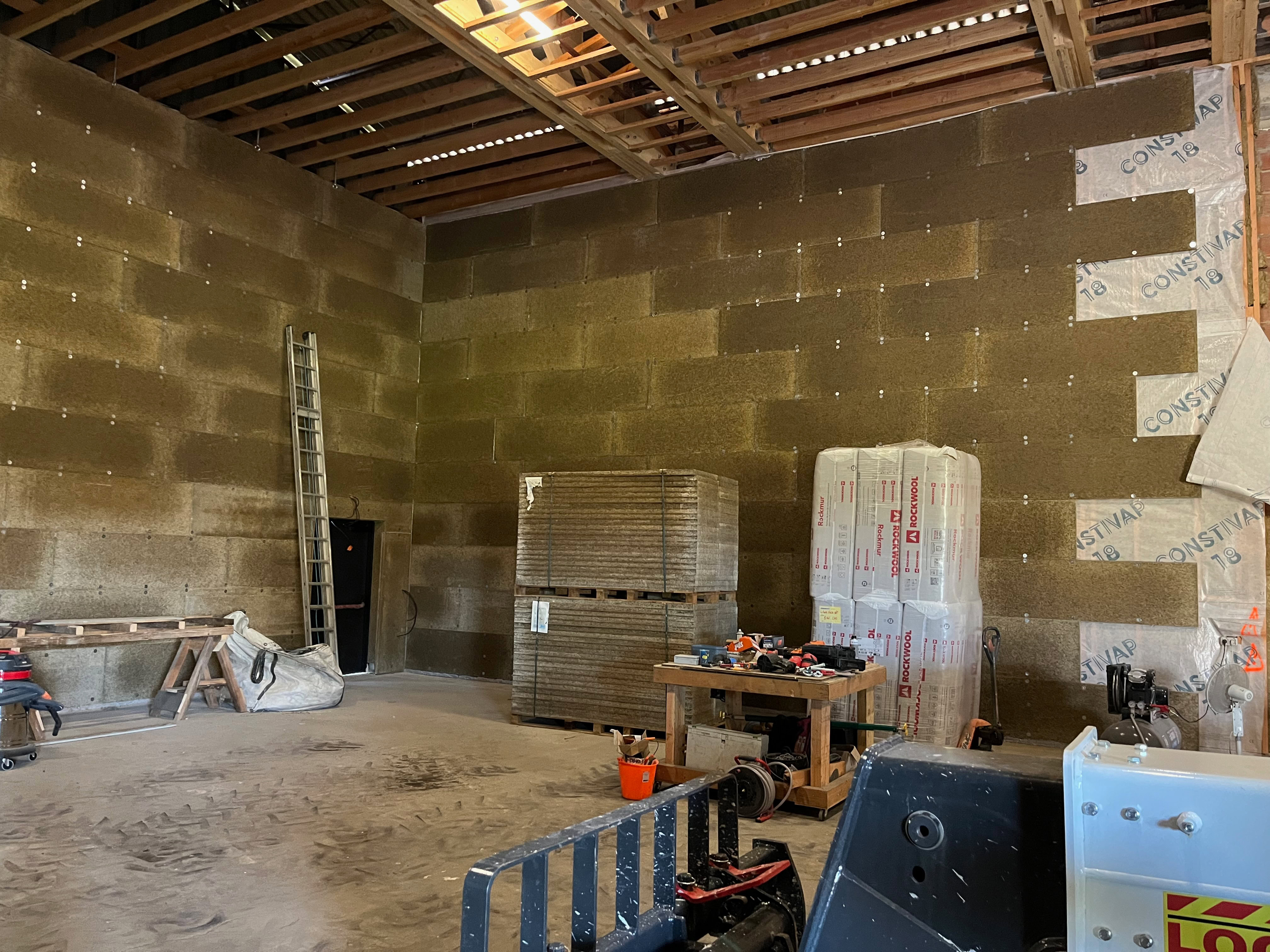 Pose terminée du Fibralith à l’angle nord-ouest. On observe à droite de l’angle l’emplacement de la porte principale (180 x 220 cm), à gauche de l’angle la lance de sécurité incendie. 22 novembre 2024