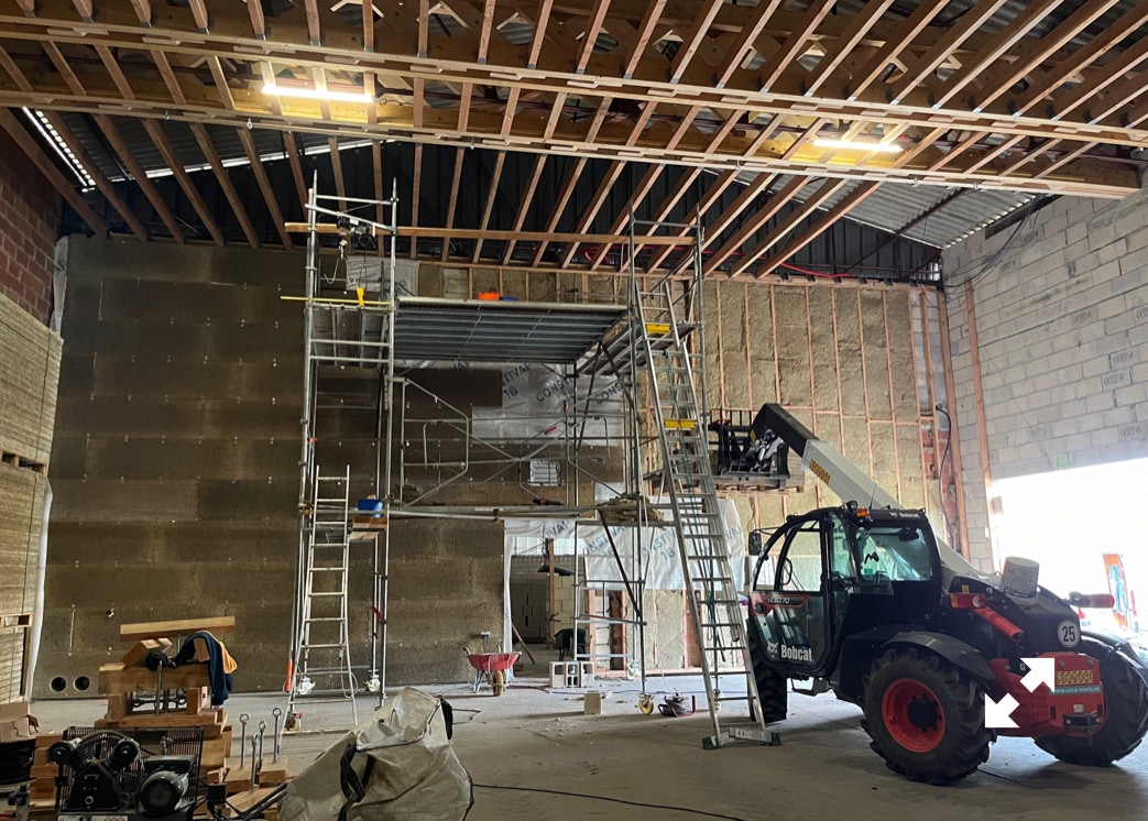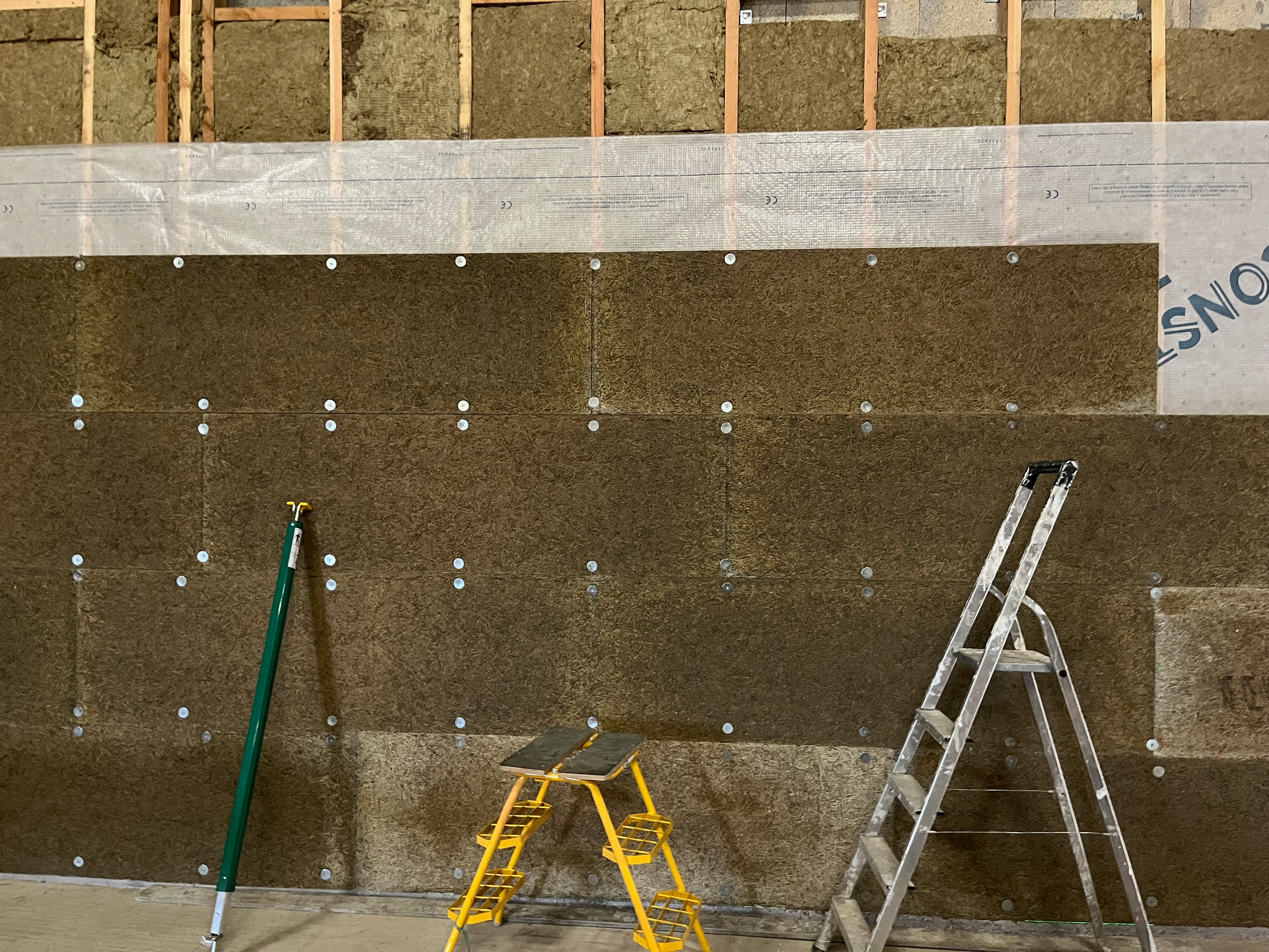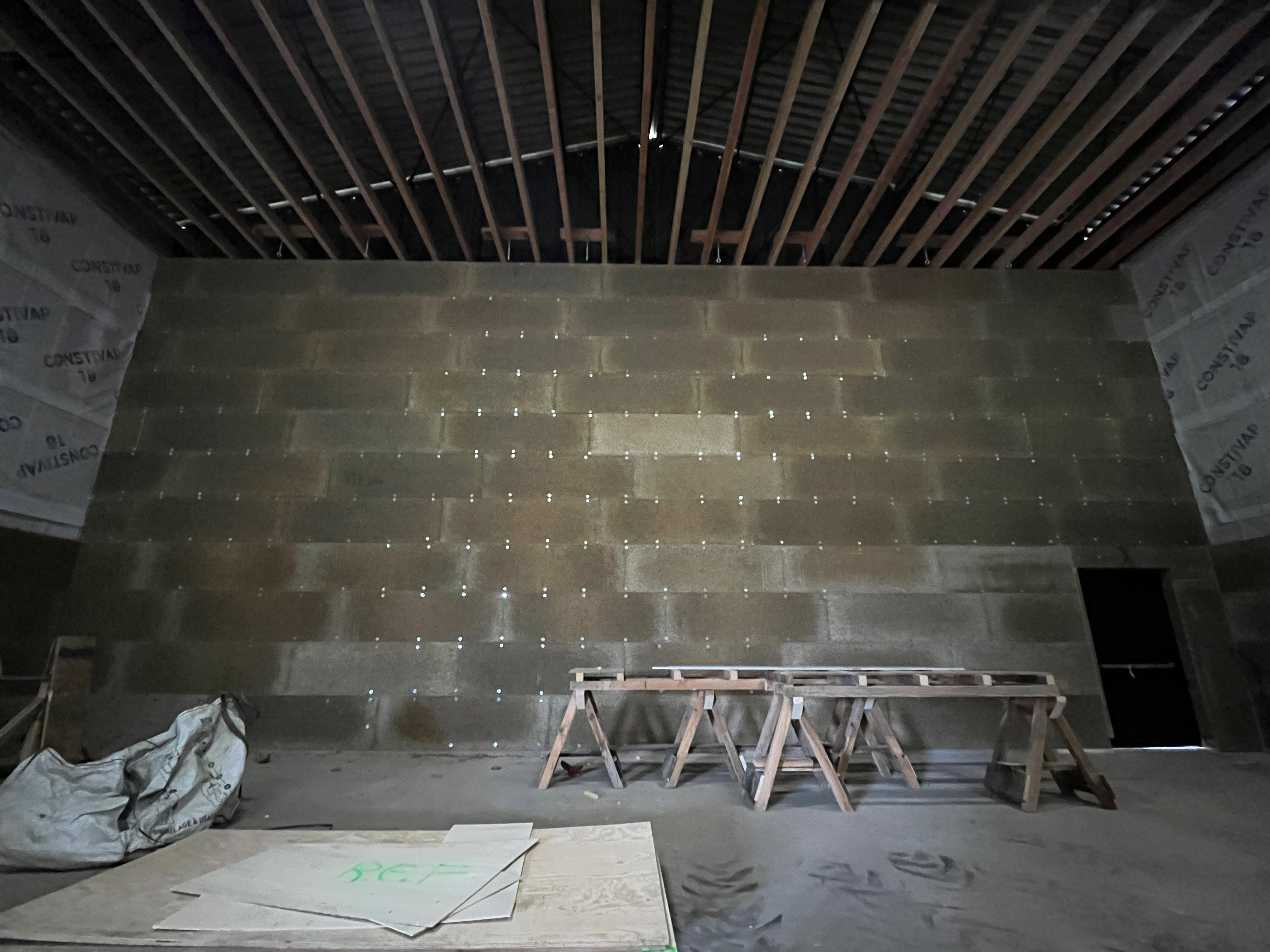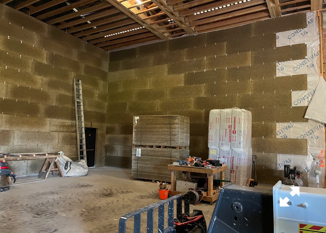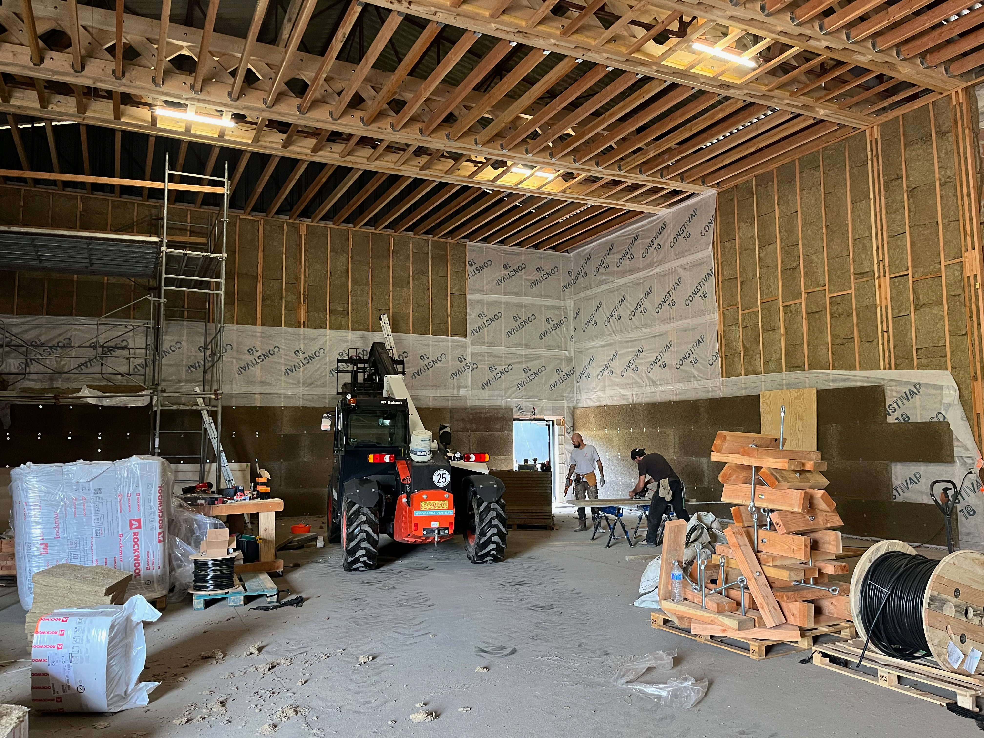 Pose terminée du Fibralith à l’angle nord-ouest. On observe à droite de l’angle l’emplacement de la porte principale (180 x 220 cm), à gauche de l’angle la lance de sécurité incendie. 22 novembre 2024