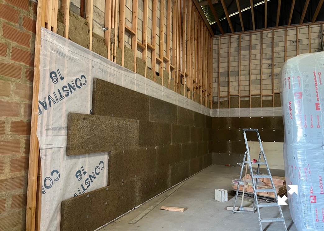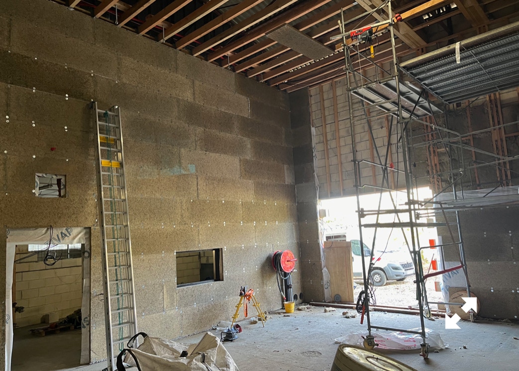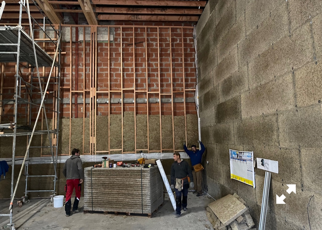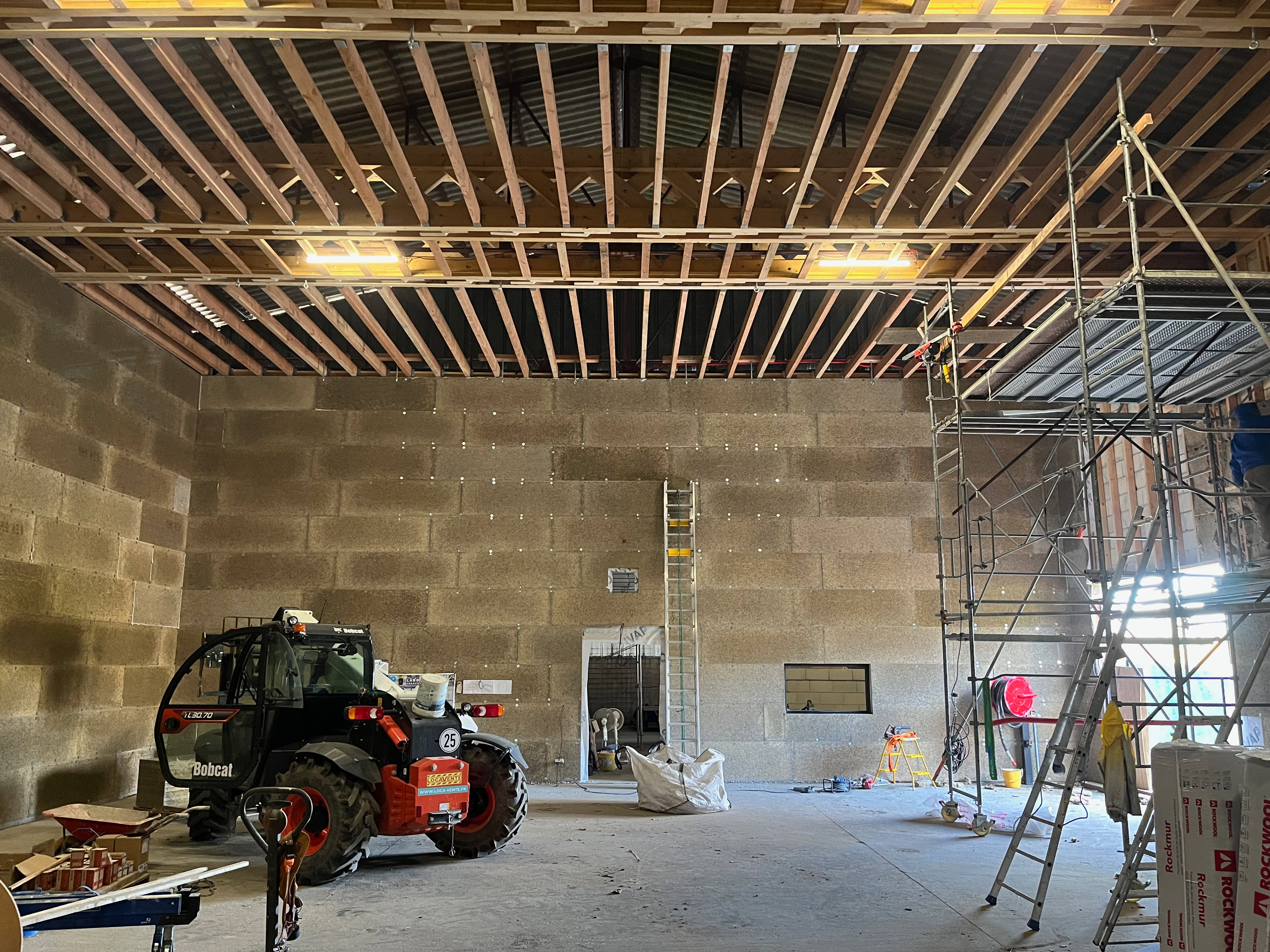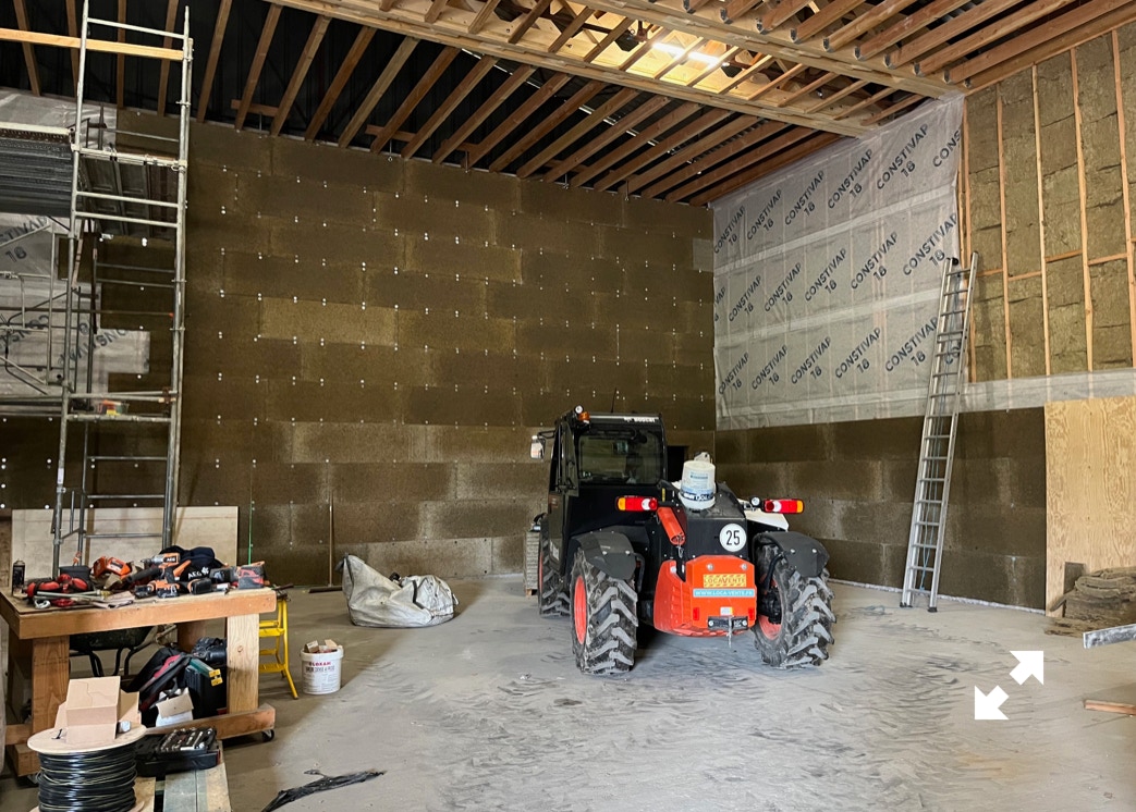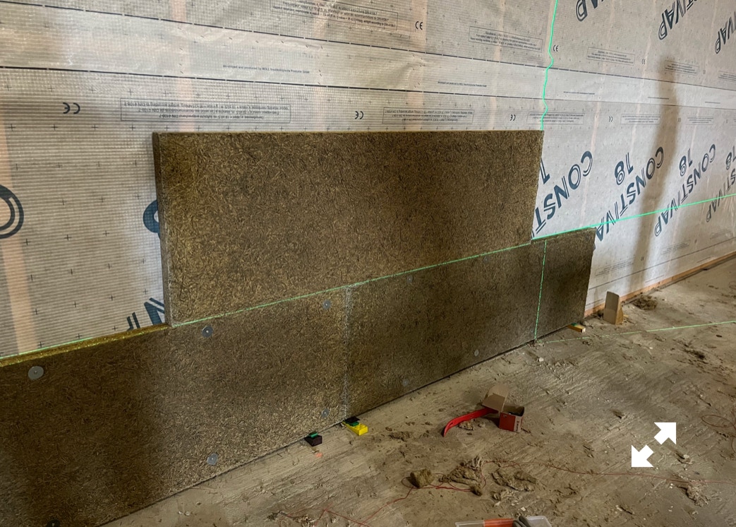 Pose terminée du Fibralith à l’angle nord-ouest. On observe à droite de l’angle l’emplacement de la porte principale (180 x 220 cm), à gauche de l’angle la lance de sécurité incendie. 22 novembre 2024