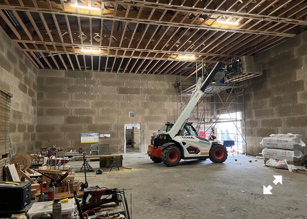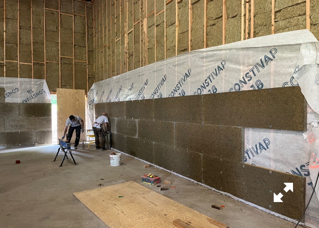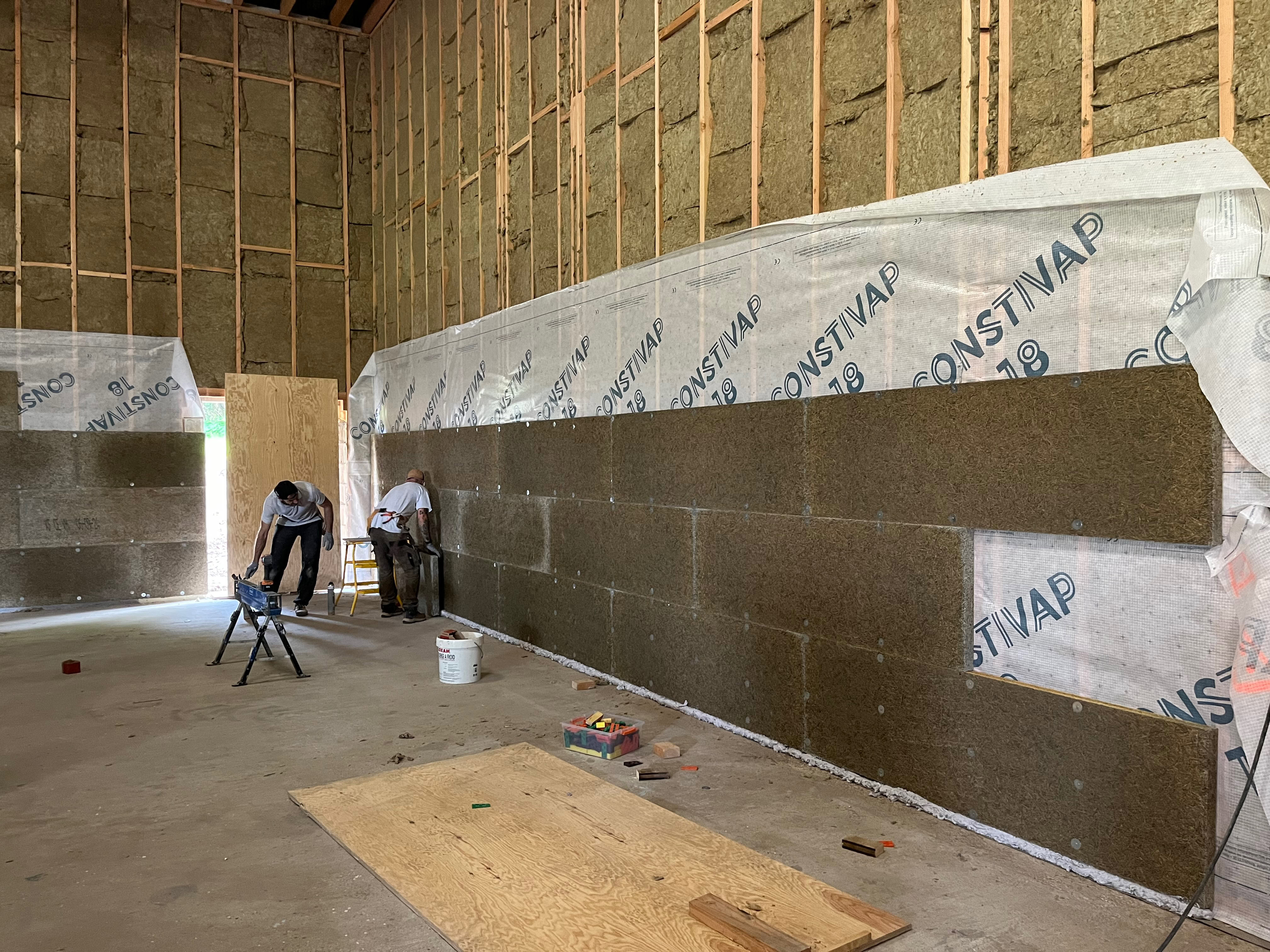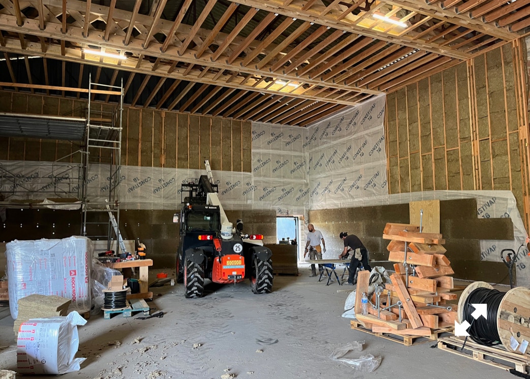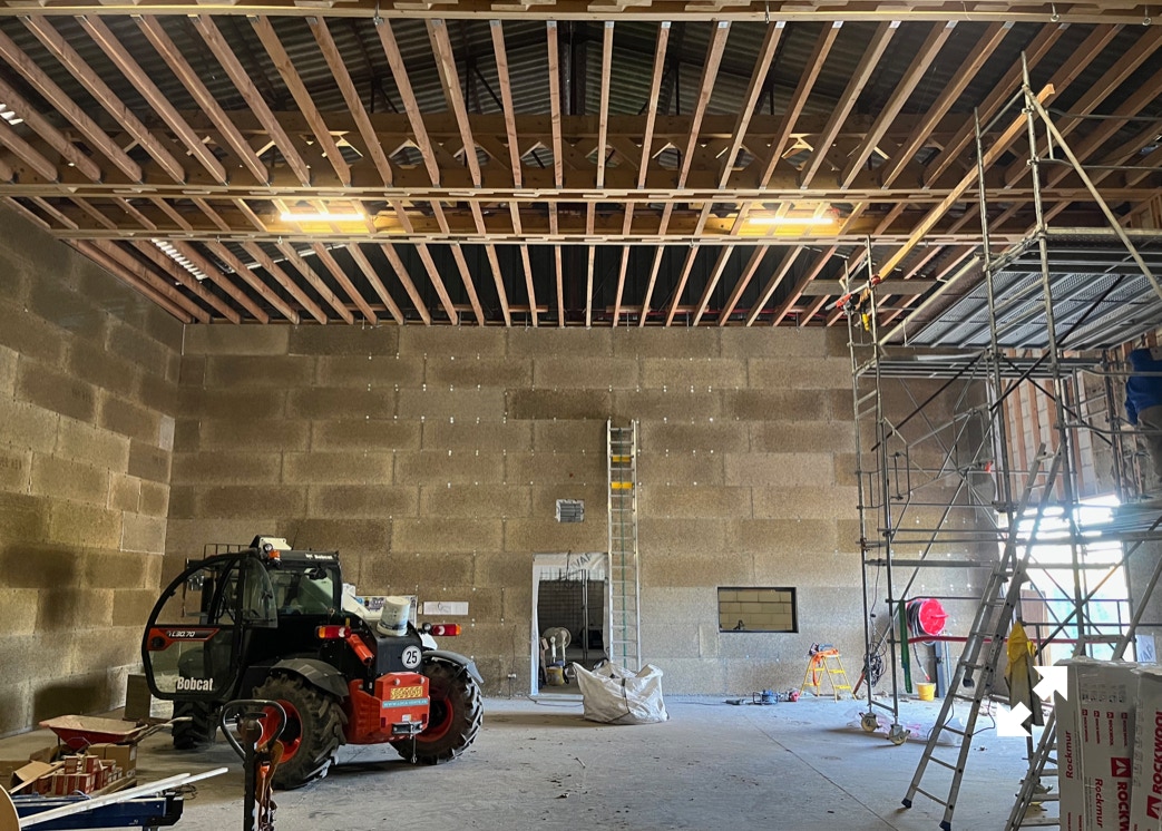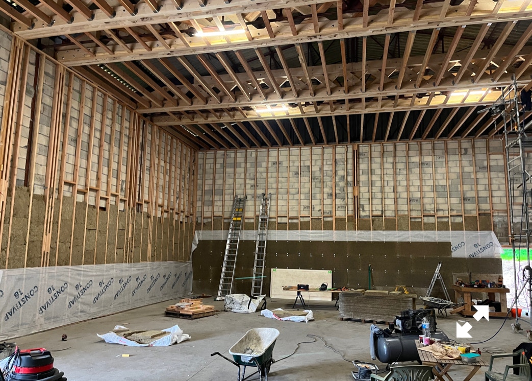 Pose terminée du Fibralith à l’angle nord-ouest. On observe à droite de l’angle l’emplacement de la porte principale (180 x 220 cm), à gauche de l’angle la lance de sécurité incendie. 22 novembre 2024
