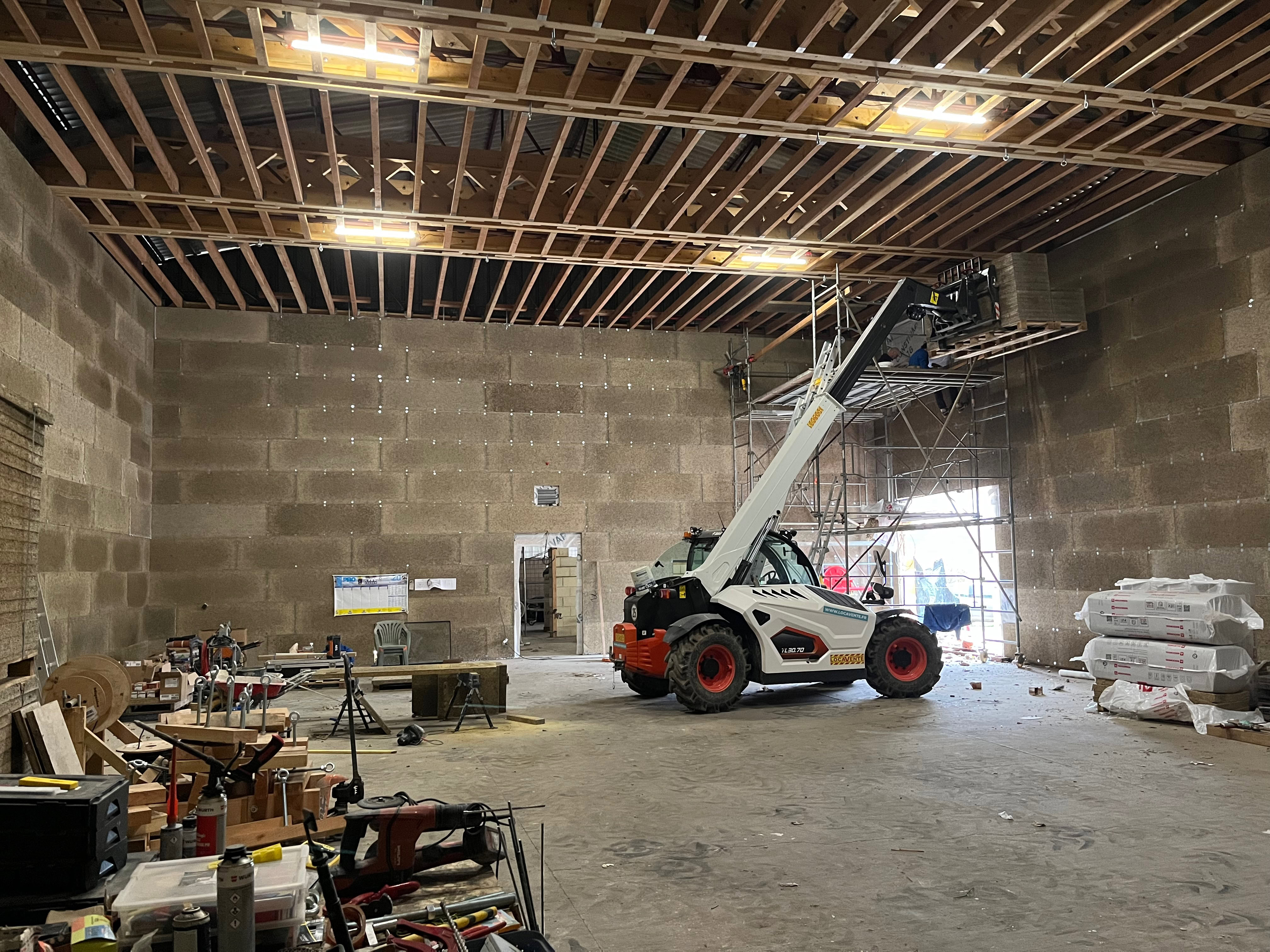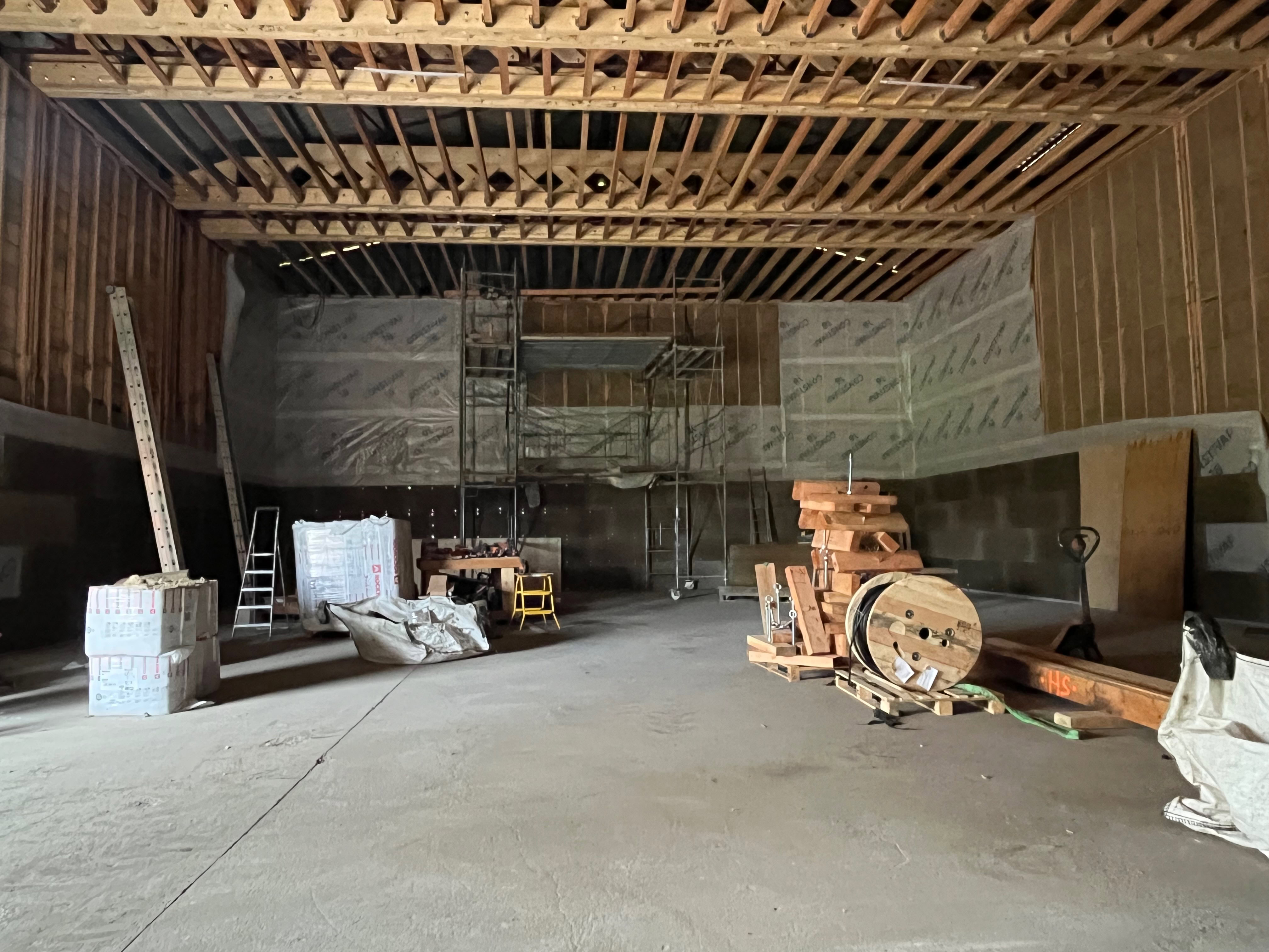 Isolation et traitement acoustique presque terminés sur le mur ouest. Mis en place de la lance de sécurité incendie, à droite, non loin de la porte d’entrée principale. 12 novembre 2024