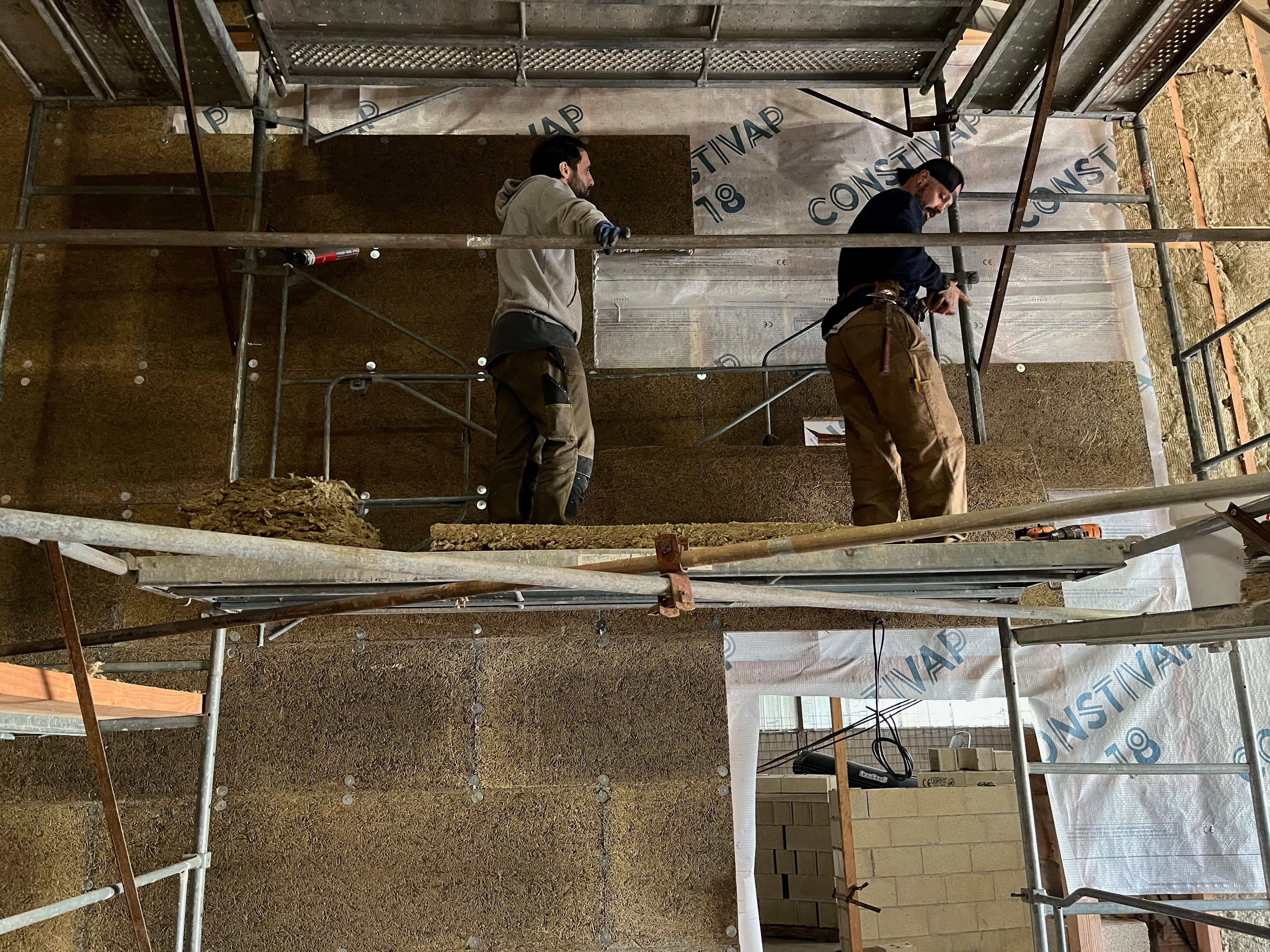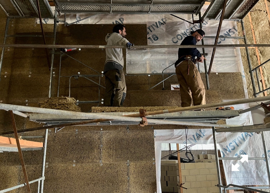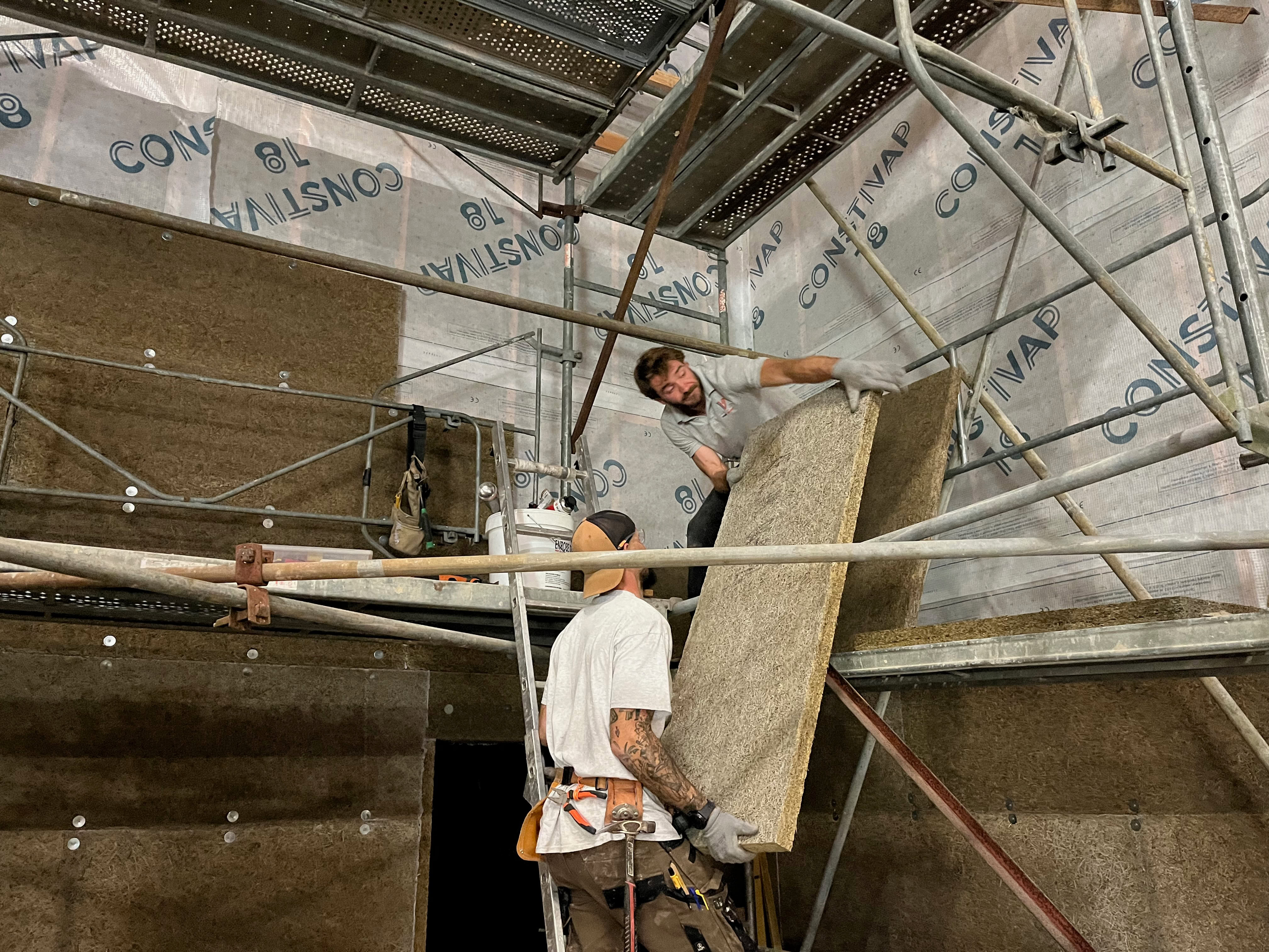 Hissage des lourds panneaux de Fibralith en hauteur grâce à un échafaudage adaptable sur roue. 17 octobre 2024