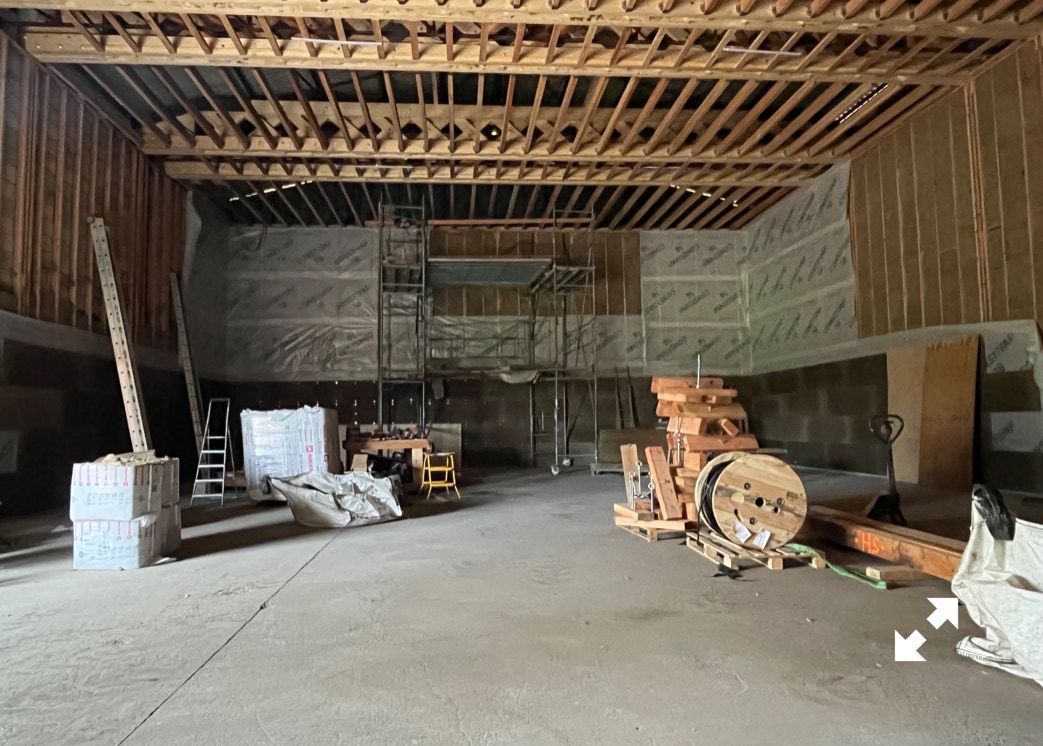 Avancement de l’isolation et du traitement acoustique absorbant des angles nord-est et sud-est. A droite, le stock de crochets qui seront utilisés pour suspendre les panneaux acoustiques réfléchissants. 16 octobre 2024