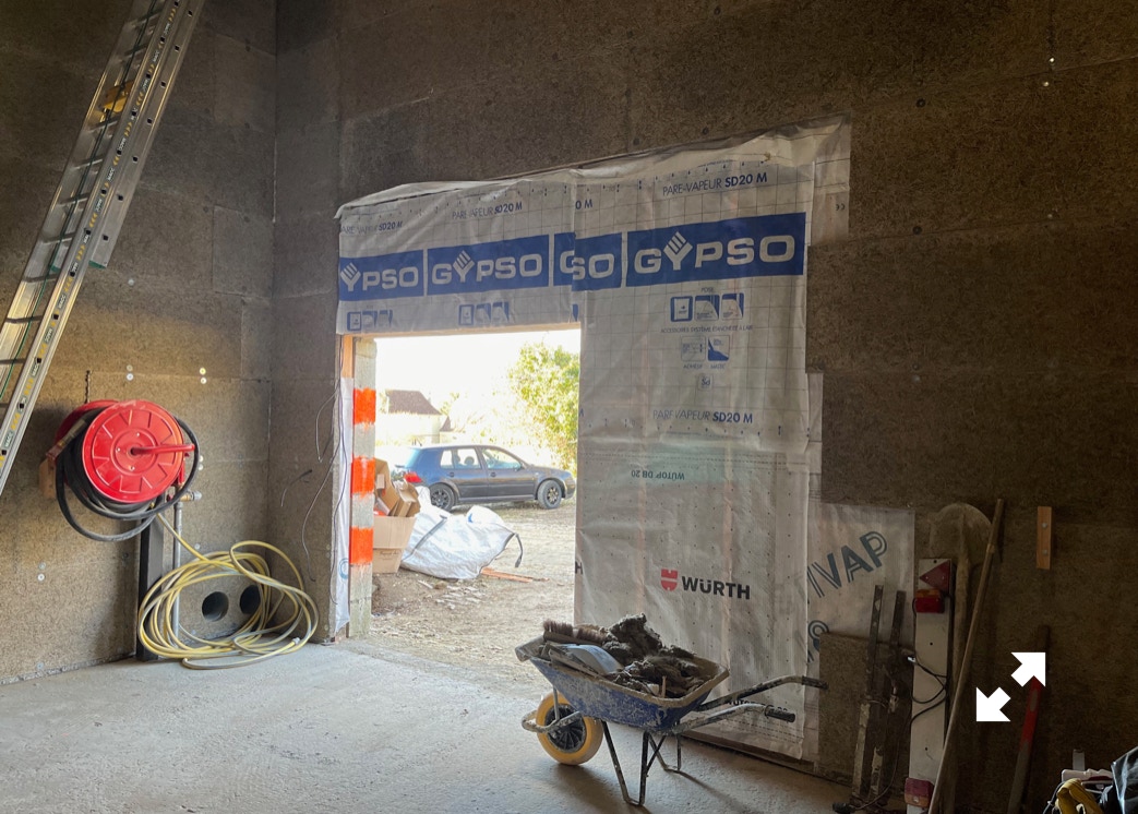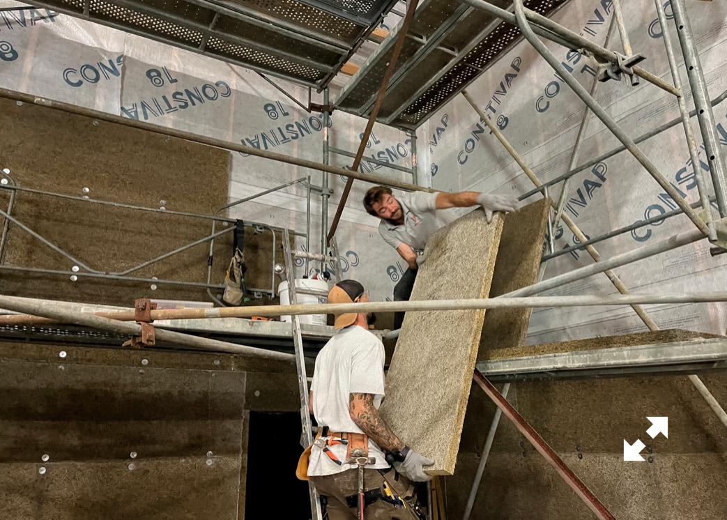 Angle sud-est, mise en place de la laine de roche et du pare-vapeur (« CONSTIVAP 18 PLUS » toile blanche constituant une membrane d'étanchéité à l'air en polypropylène, pour murs, plafonds et sols, sous tous matériaux isolants fibreux, conforme aux normes DIN 4108-7, SIA 180 et RE 2020). 16 octobre 2024