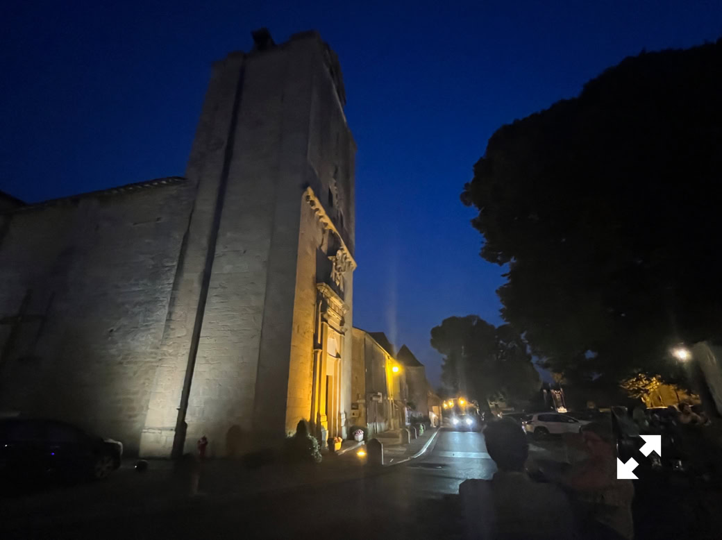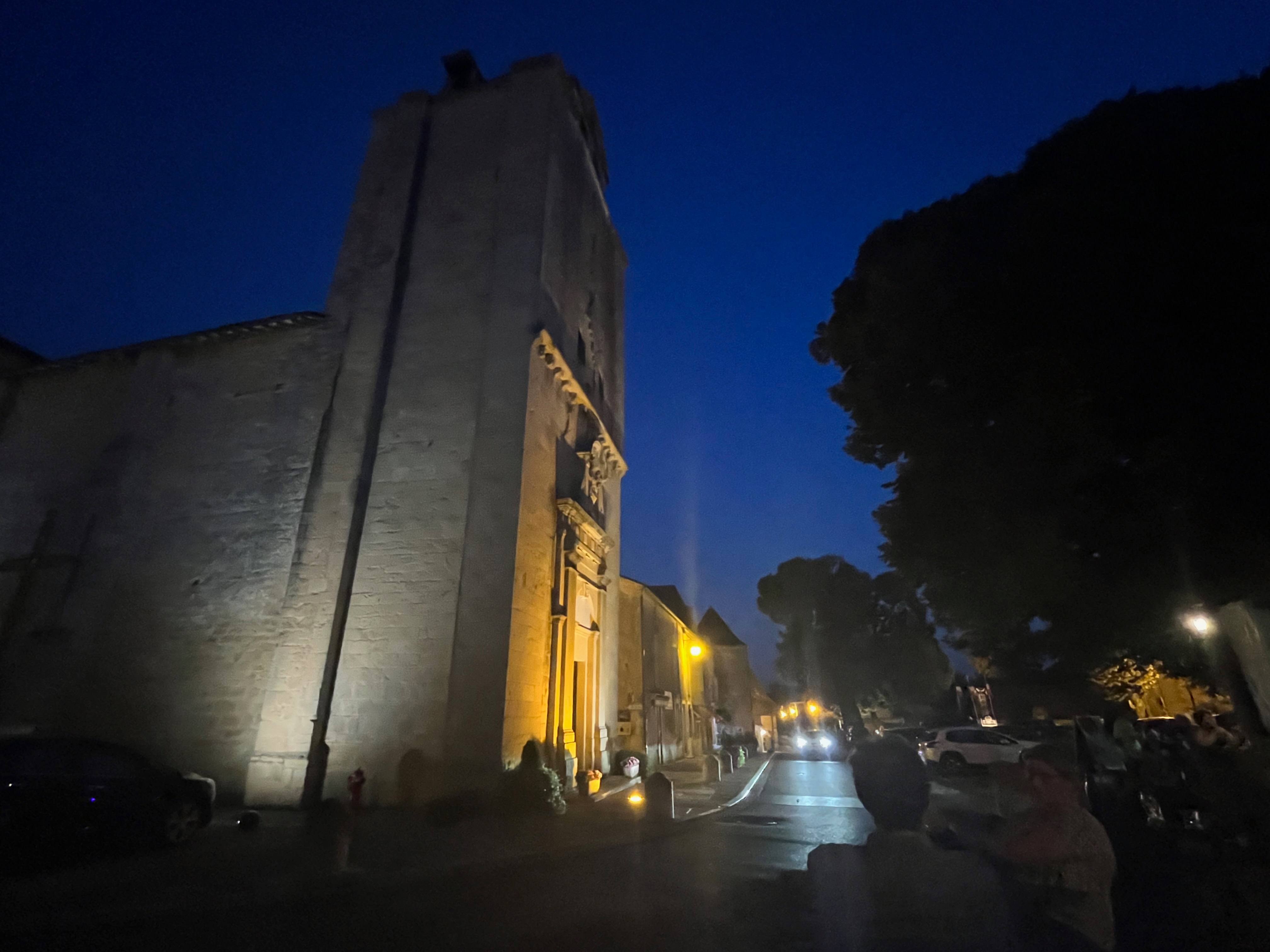 Vue nocturne de la rue principale du village de Trémolat. En 2023