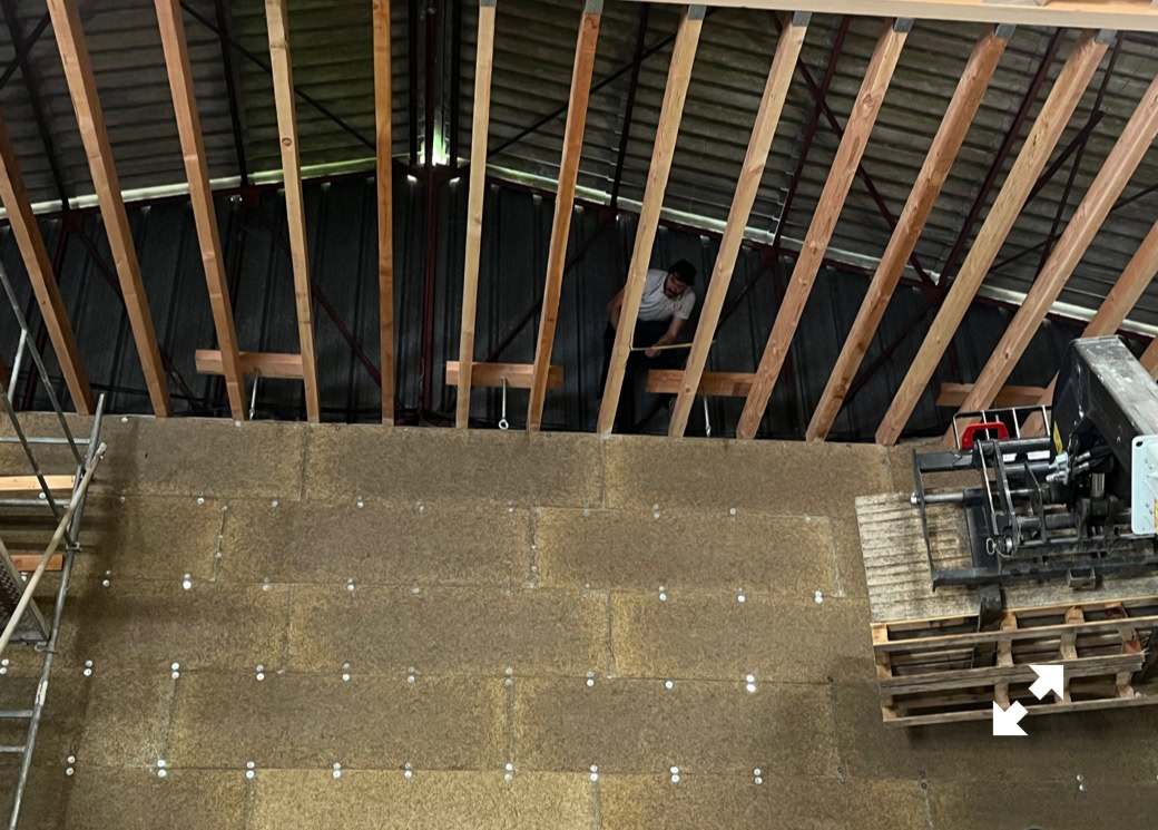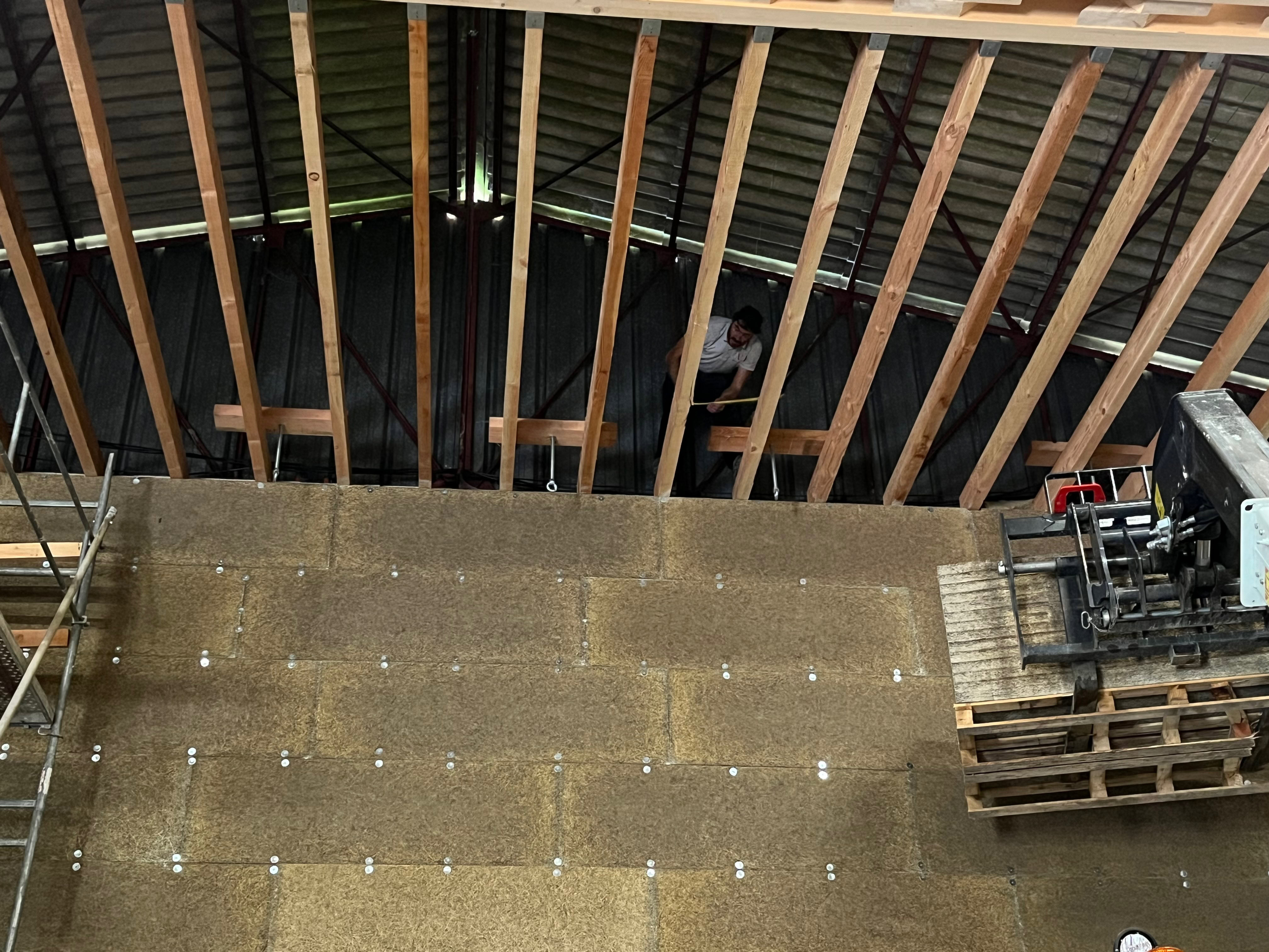40 crochets, positionnés le long des 4 murs, serviront à suspendre les 20 panneaux acoustiques réfléchissants et diffusants (en épicéa 3 plis de taille 1250 x 2500 x 32 mm) et 30 autres crochets centraux seront utilisés pour suspendre le gril de projecteurs mouvementé par 6 treuils électriques. Chaque crochet peut soulever 500 kg.