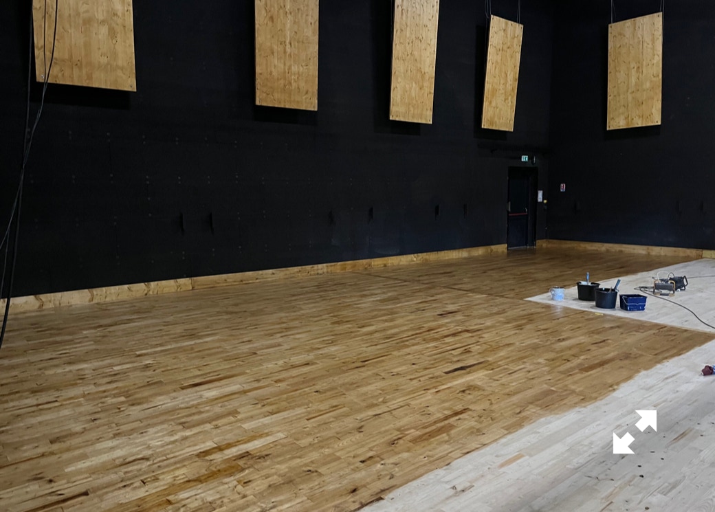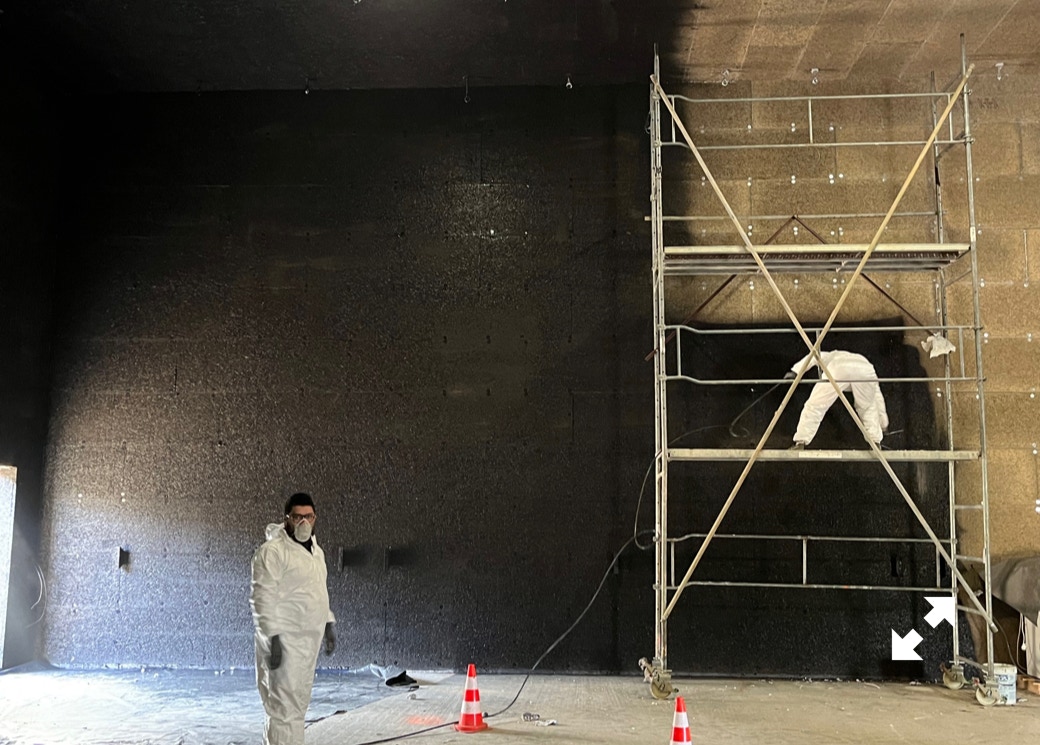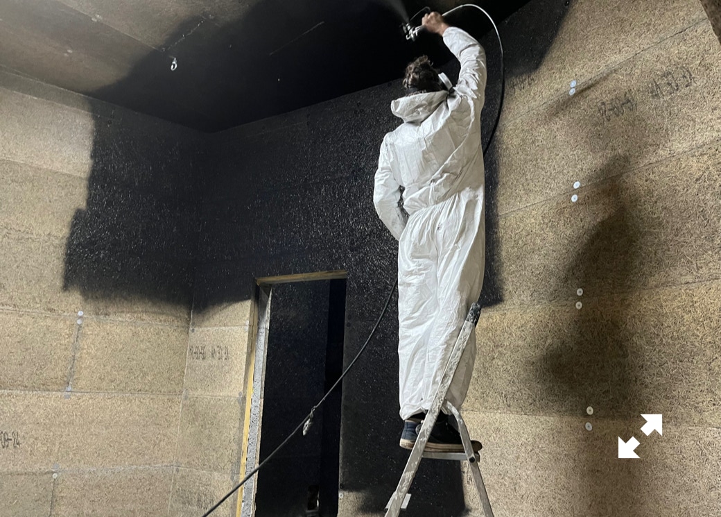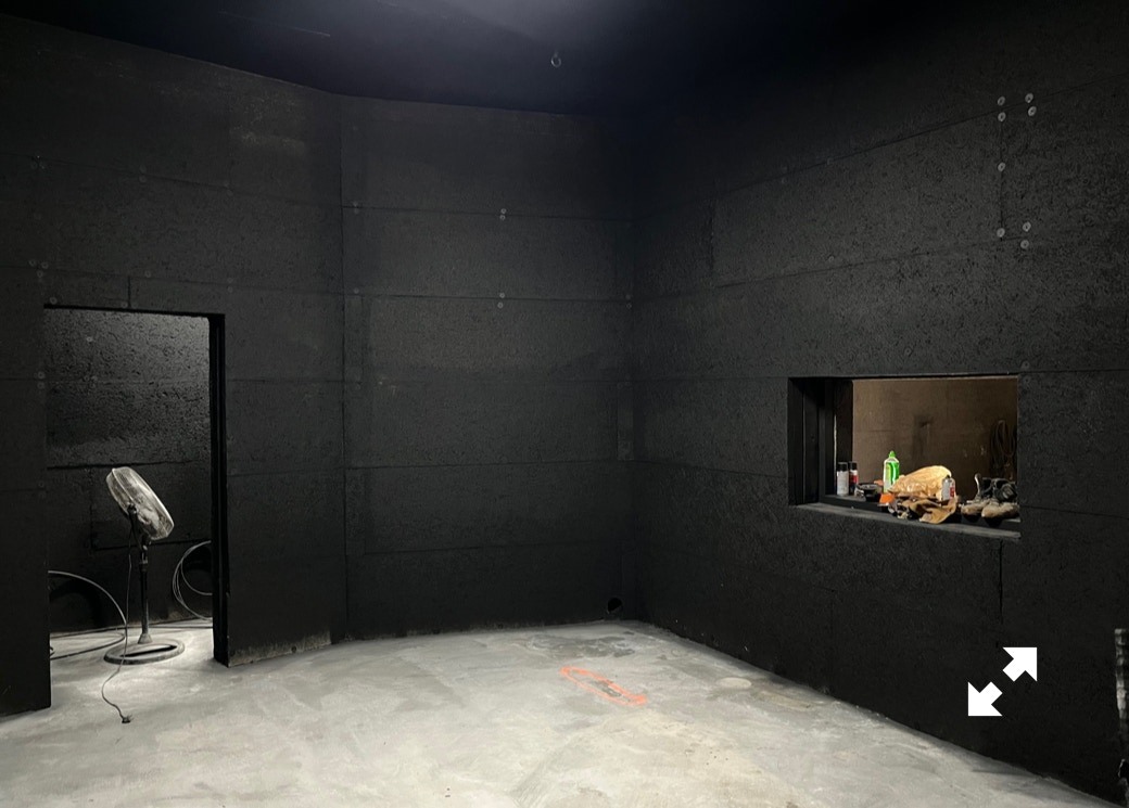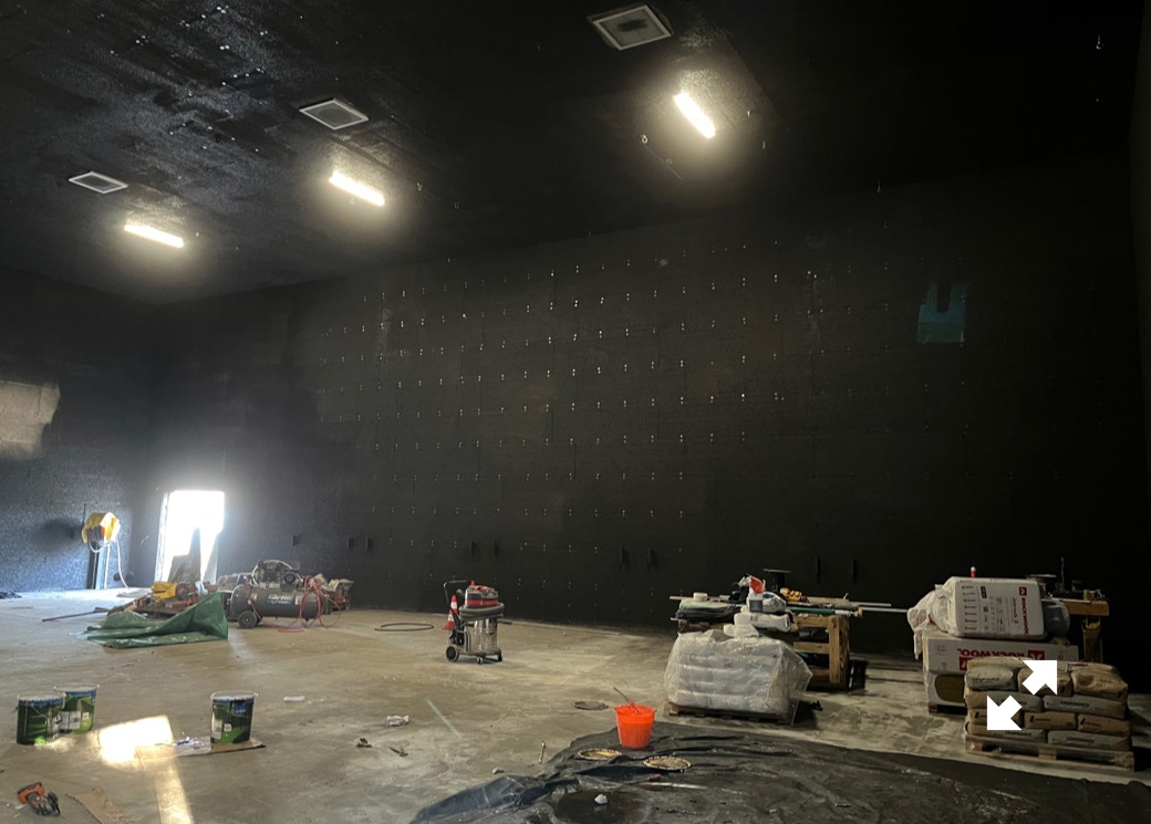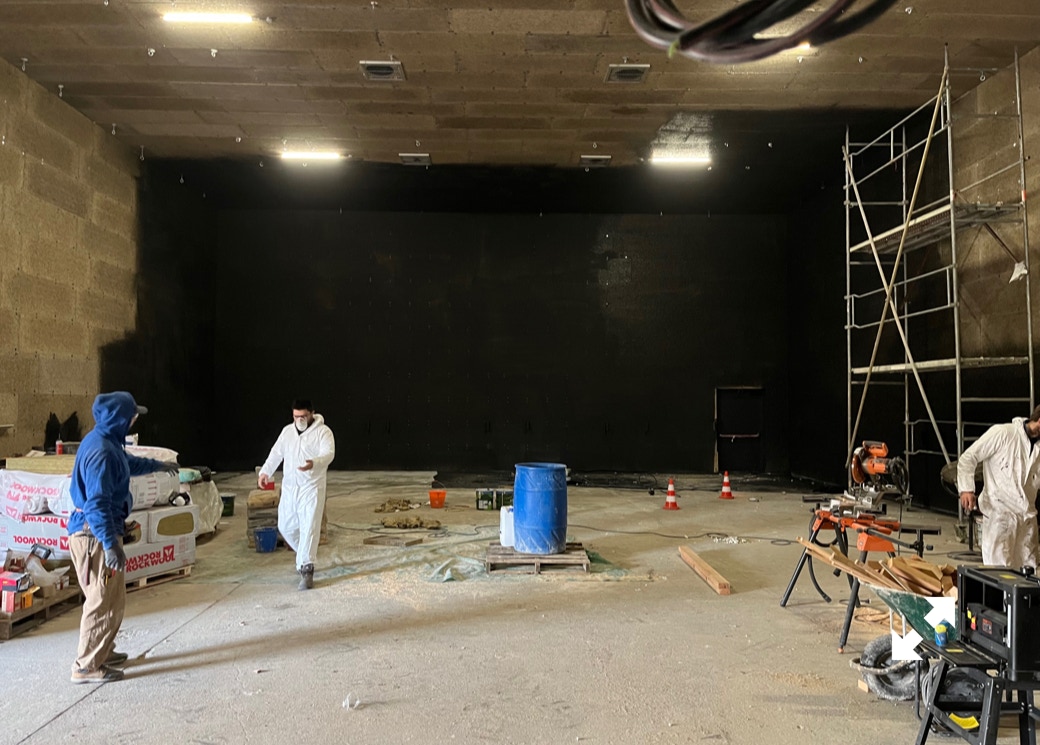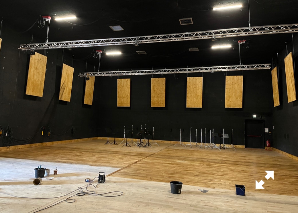 Une peinture de couleur « noir mat » est répartie sur les quatre murs (470 m2) et le plafond (300 m2). Cette peinture est pulvérisée au pistolet en couche très fine de manière à ne pas compromettre l’effet acoustique absorbant du traitement, notamment du Fibralith. La régie sera également peinte avec cette même peinture avant d’être décorée. Cette couleur a été choisi pour que la salle puisse servir le cas échéant de plateau de TV ou de cinéma.