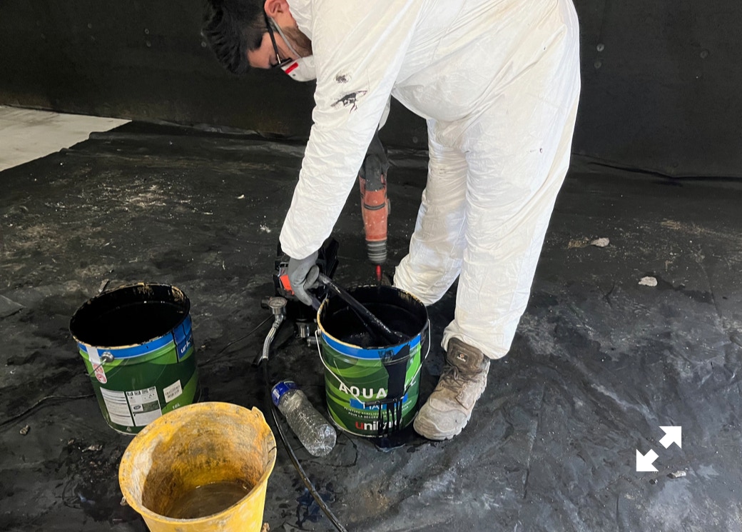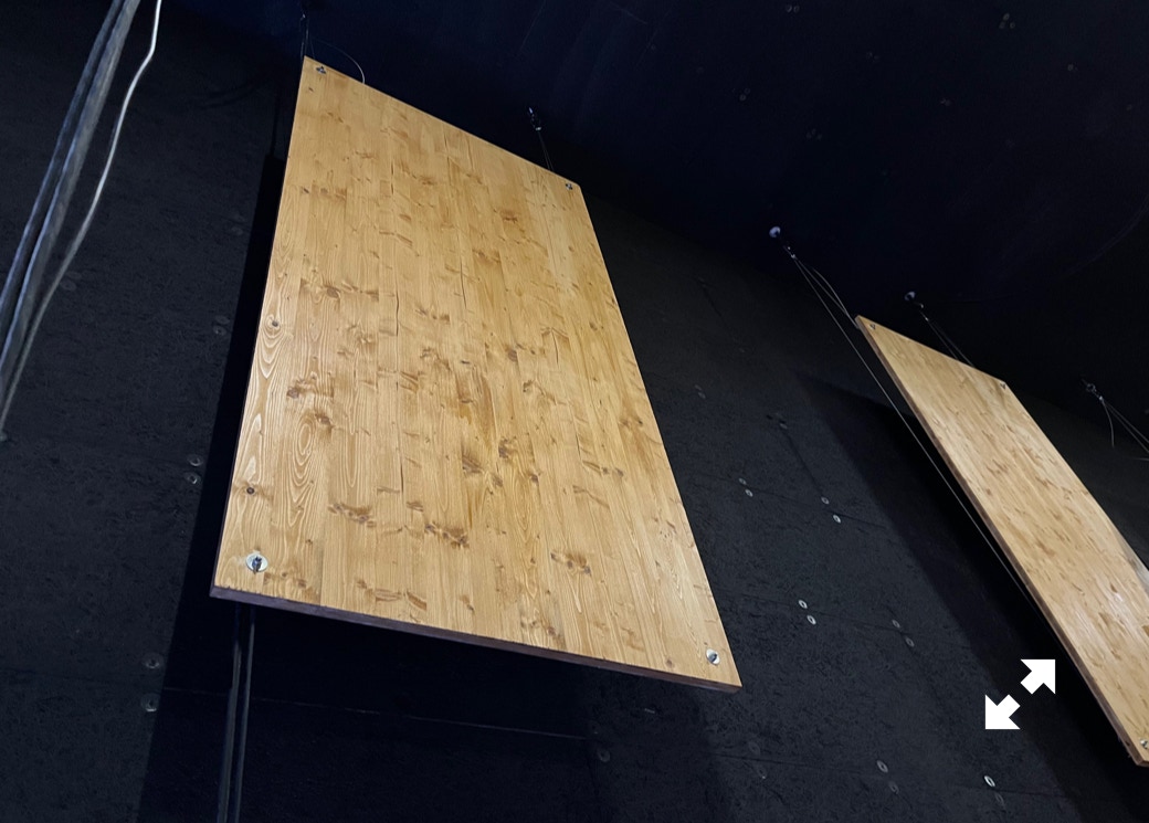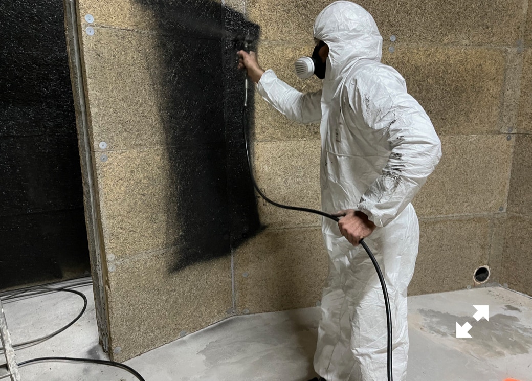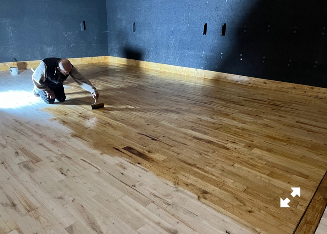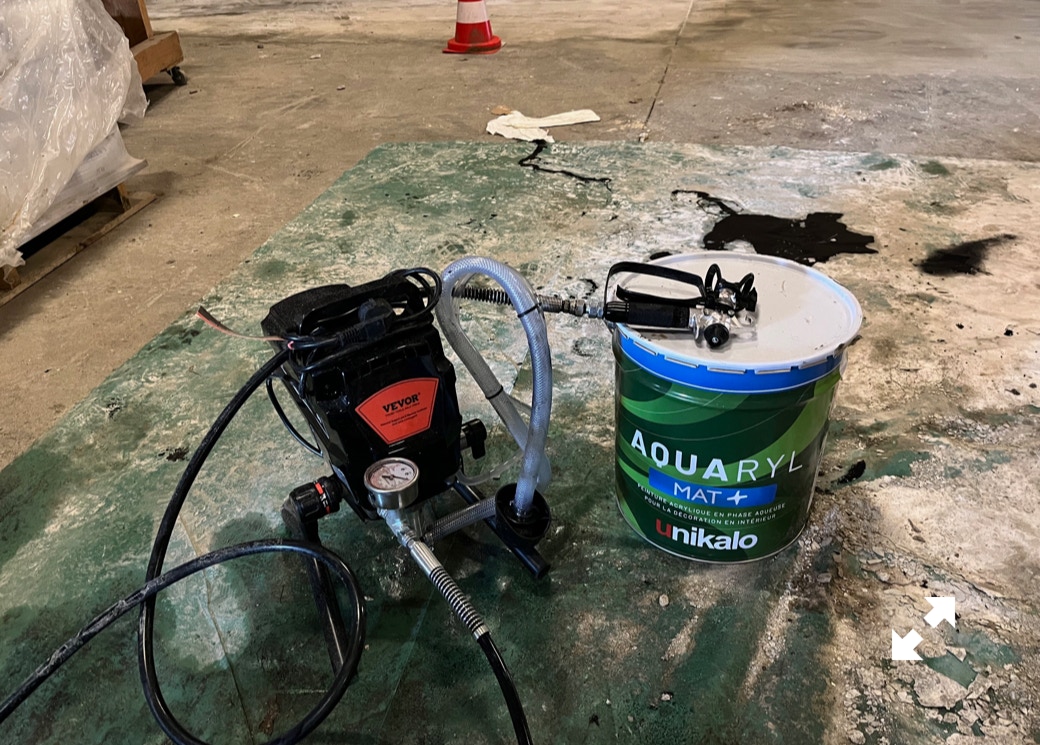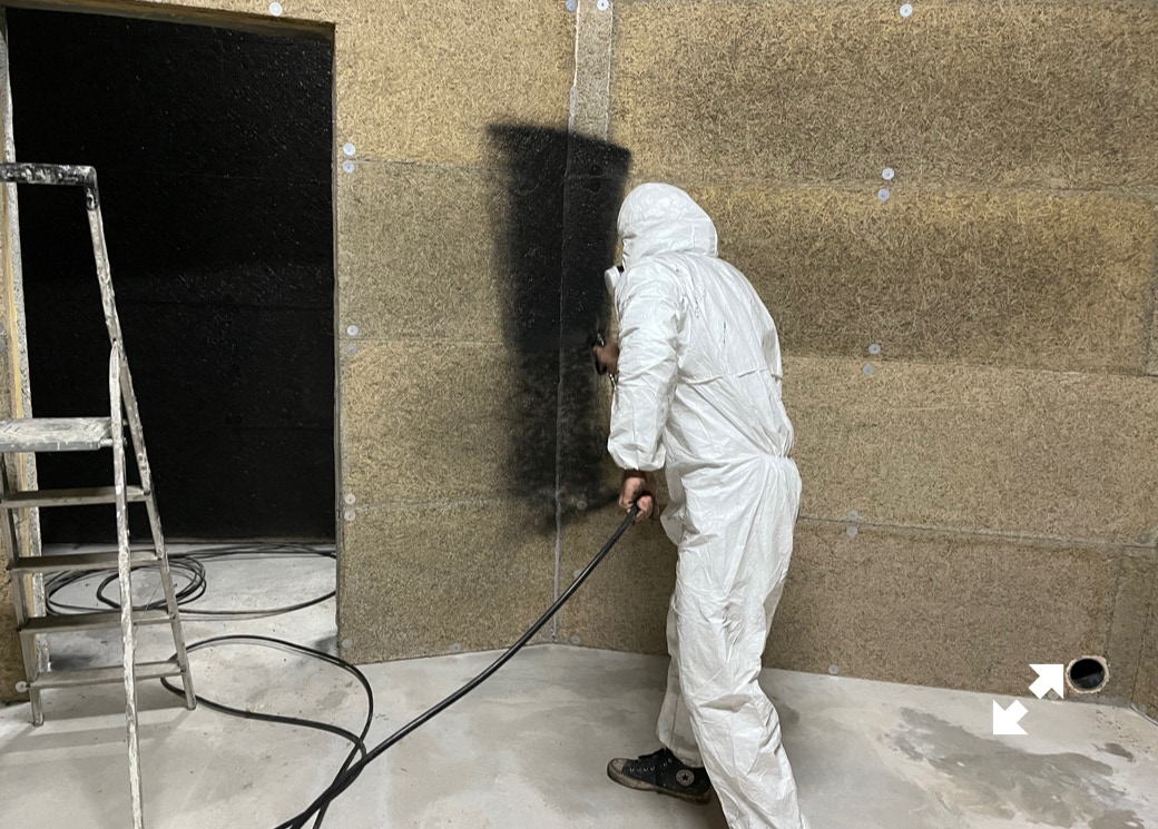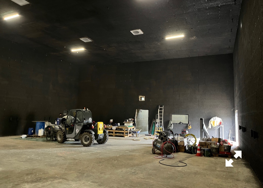 Une peinture de couleur « noir mat » est répartie sur les quatre murs (470 m2) et le plafond (300 m2). Cette peinture est pulvérisée au pistolet en couche très fine de manière à ne pas compromettre l’effet acoustique absorbant du traitement, notamment du Fibralith. La régie sera également peinte avec cette même peinture avant d’être décorée. Cette couleur a été choisi pour que la salle puisse servir le cas échéant de plateau de TV ou de cinéma.