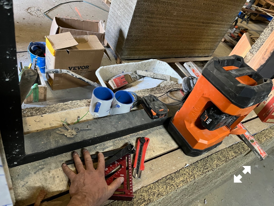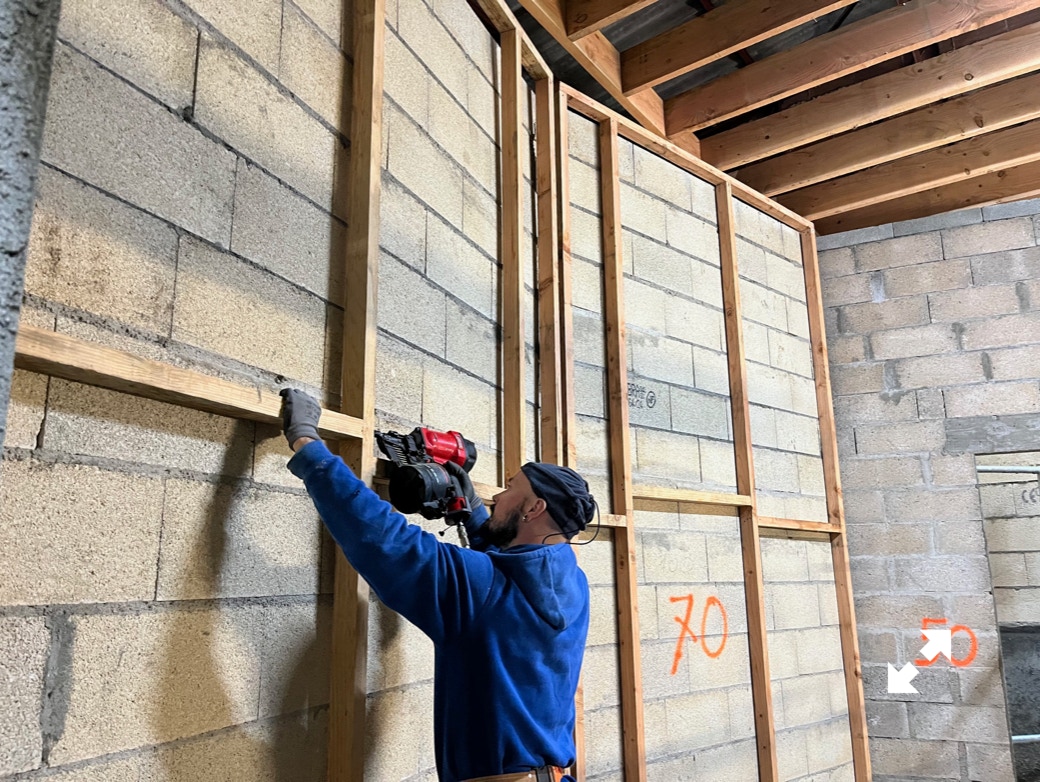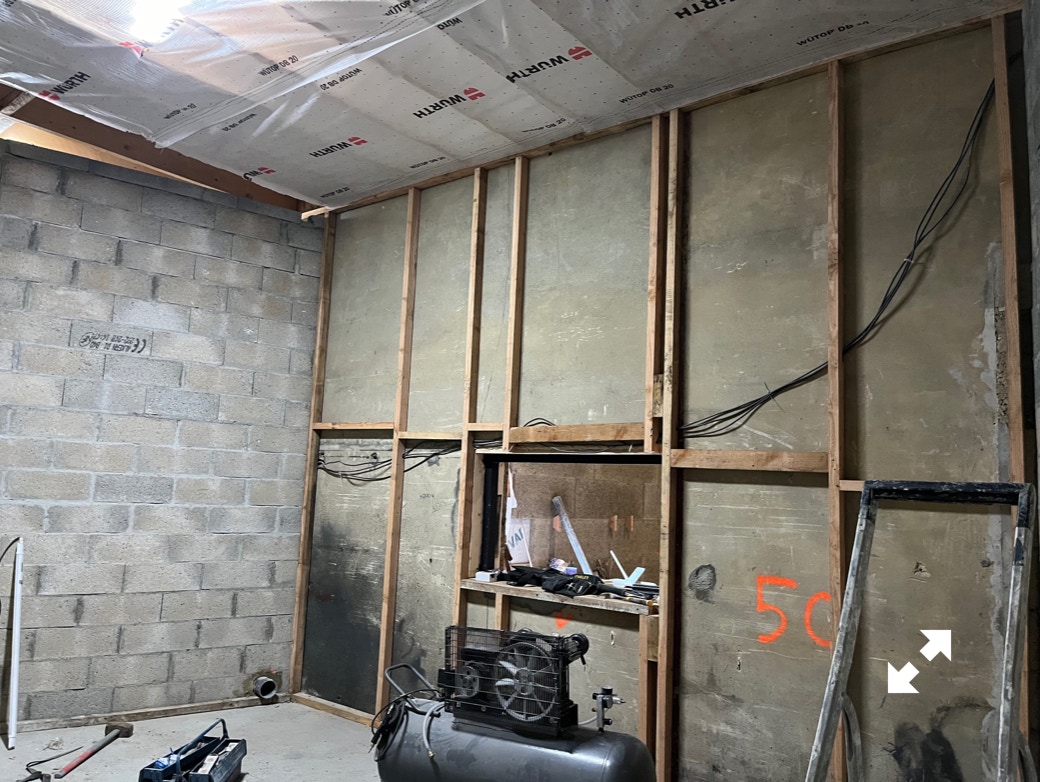 Mise en place de l’ossature de bois, de l’isolation et du traitement acoustique sur les cloisons faciale et latérales de la Control Room. 11 février 2025