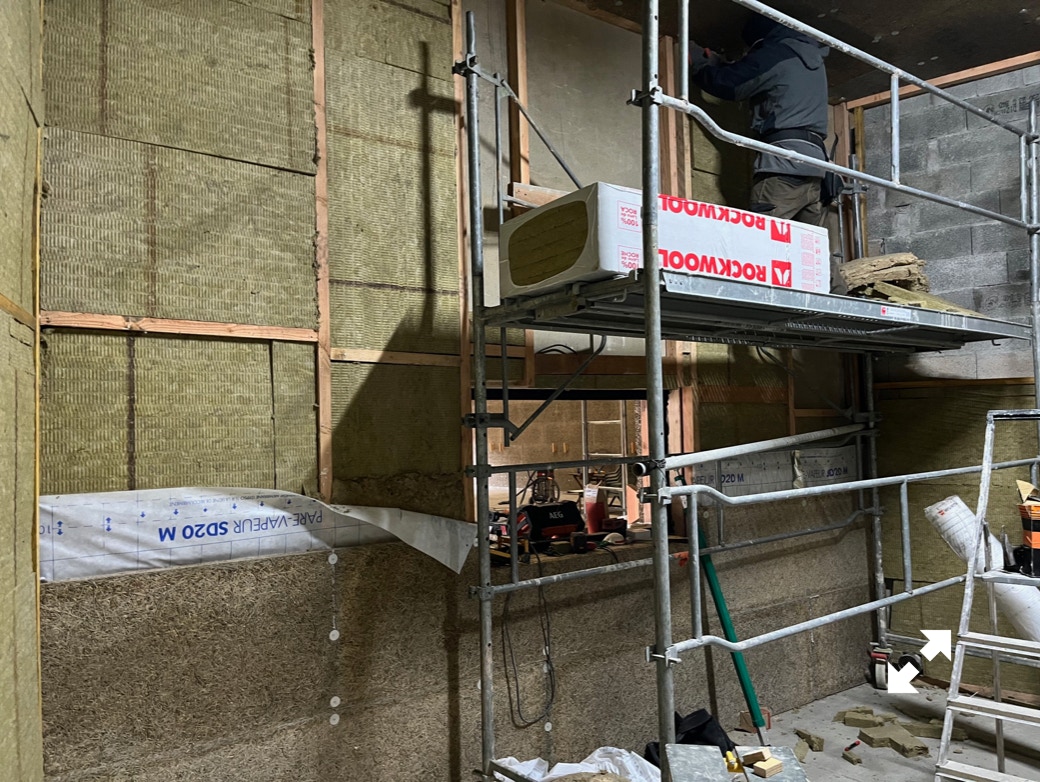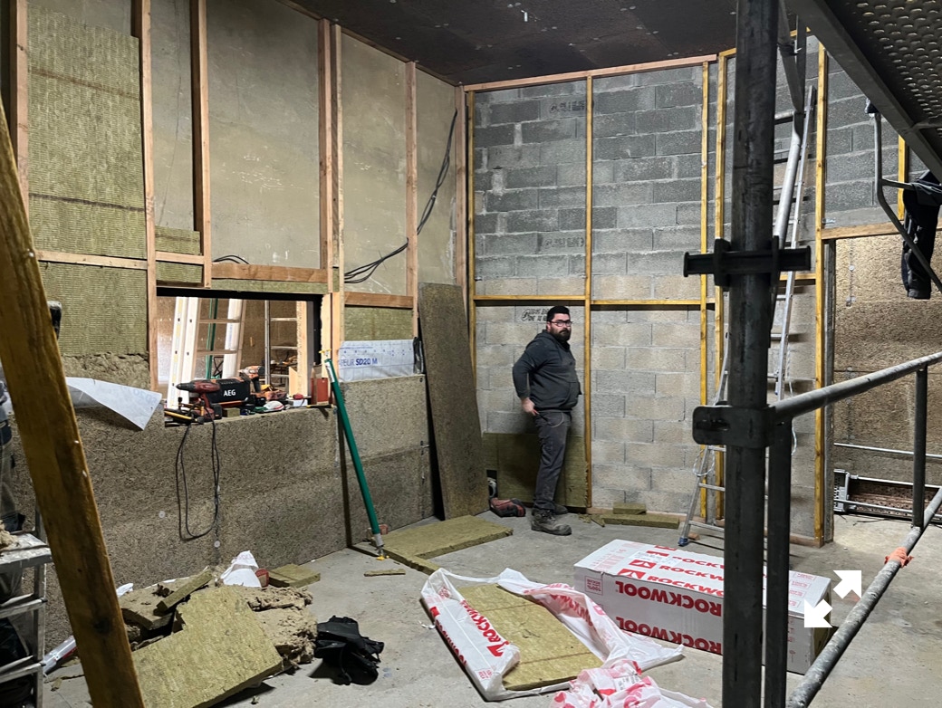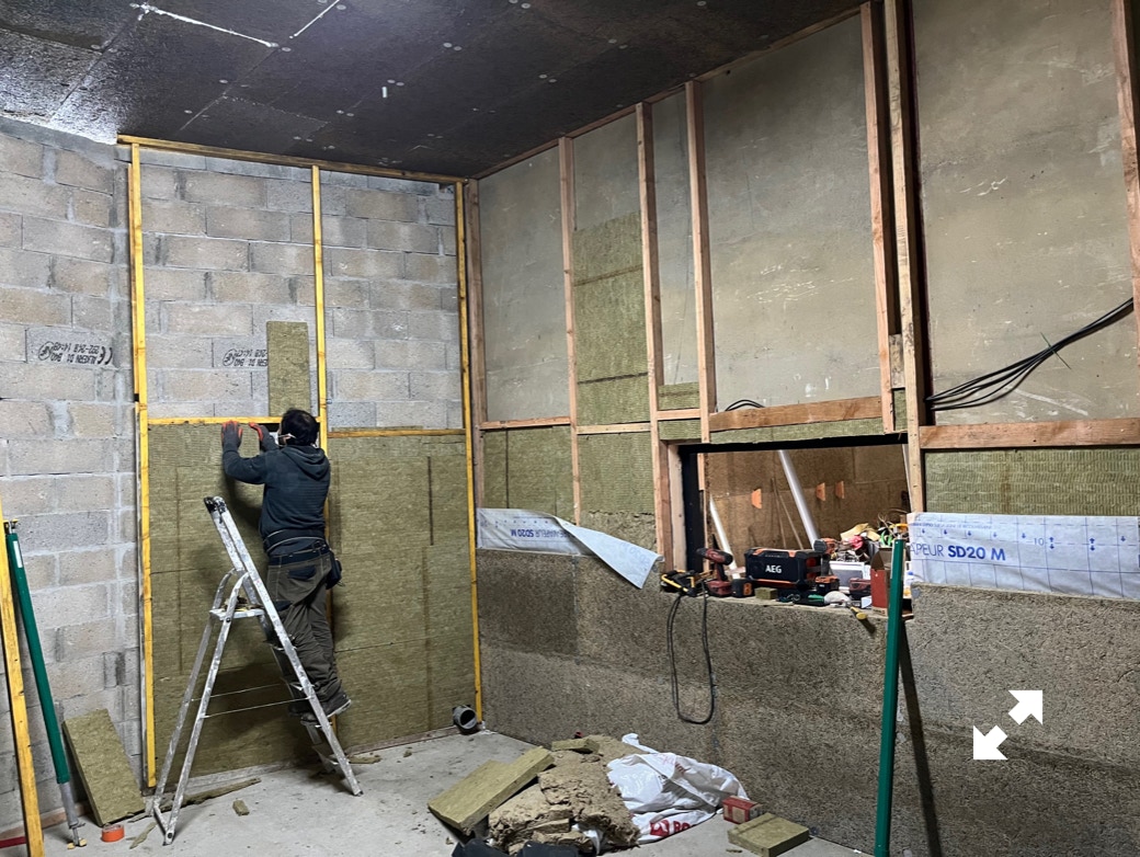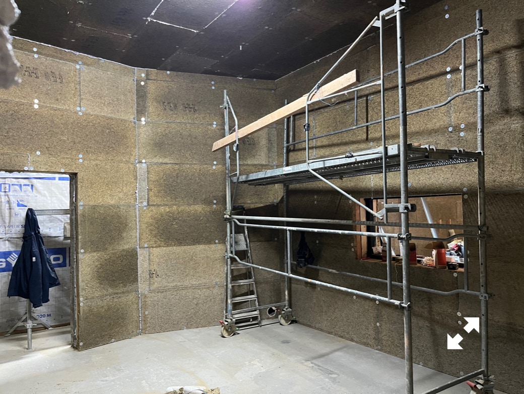 Mise en place de l’isolation en façade de la Control Room (ossature en bois, laine de roche de 10-12 cm d’épaisseur, pare-vapeur). 3 février 2025