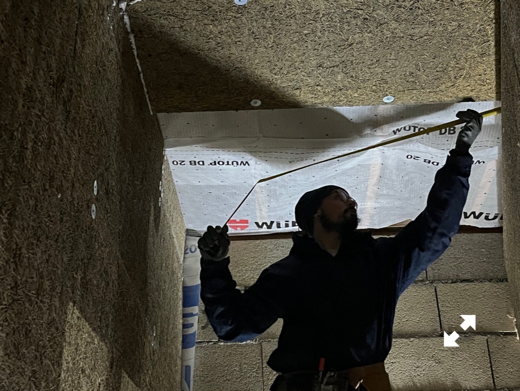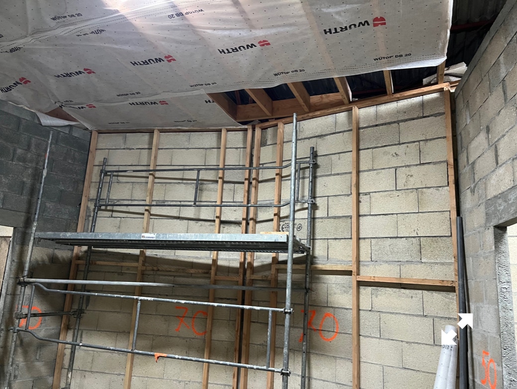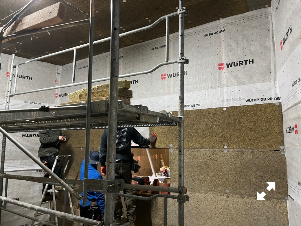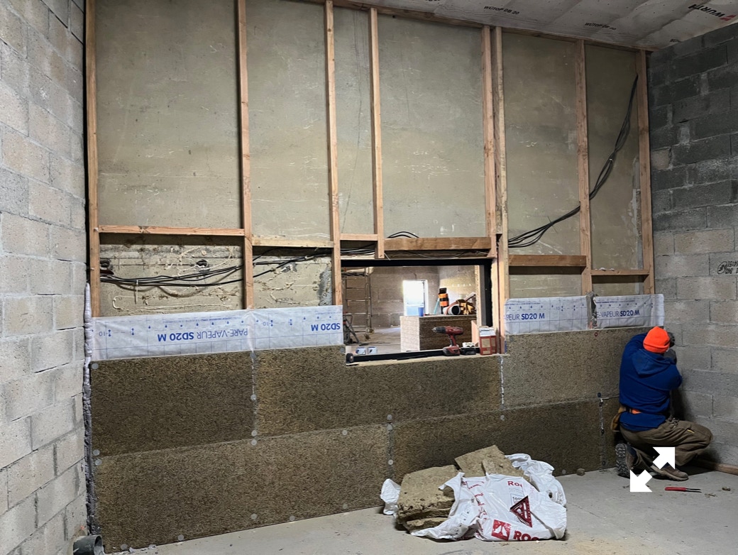 Mise en place de l’isolation en façade de la Control Room (ossature en bois, laine de roche de 10-12 cm d’épaisseur, pare-vapeur). 3 février 2025