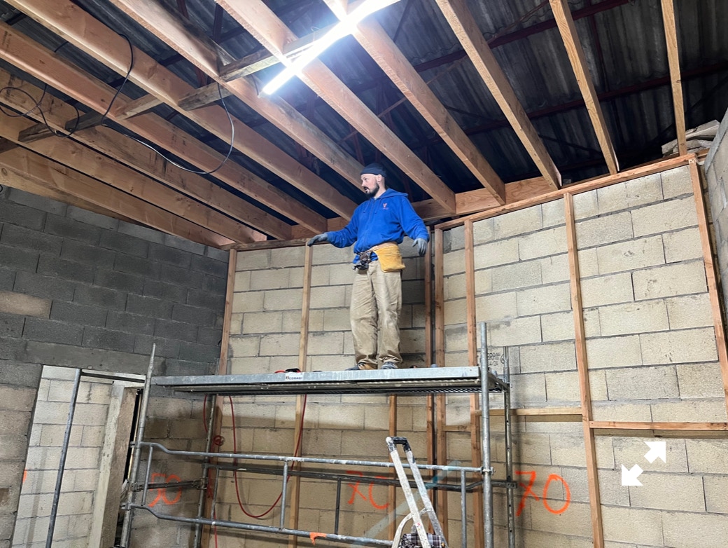 Mise en place de l’ossature secondaire à l’arrière de la régie (épaisseur 10-12 cm par dessous le Fibralith). 27 janvier 2025