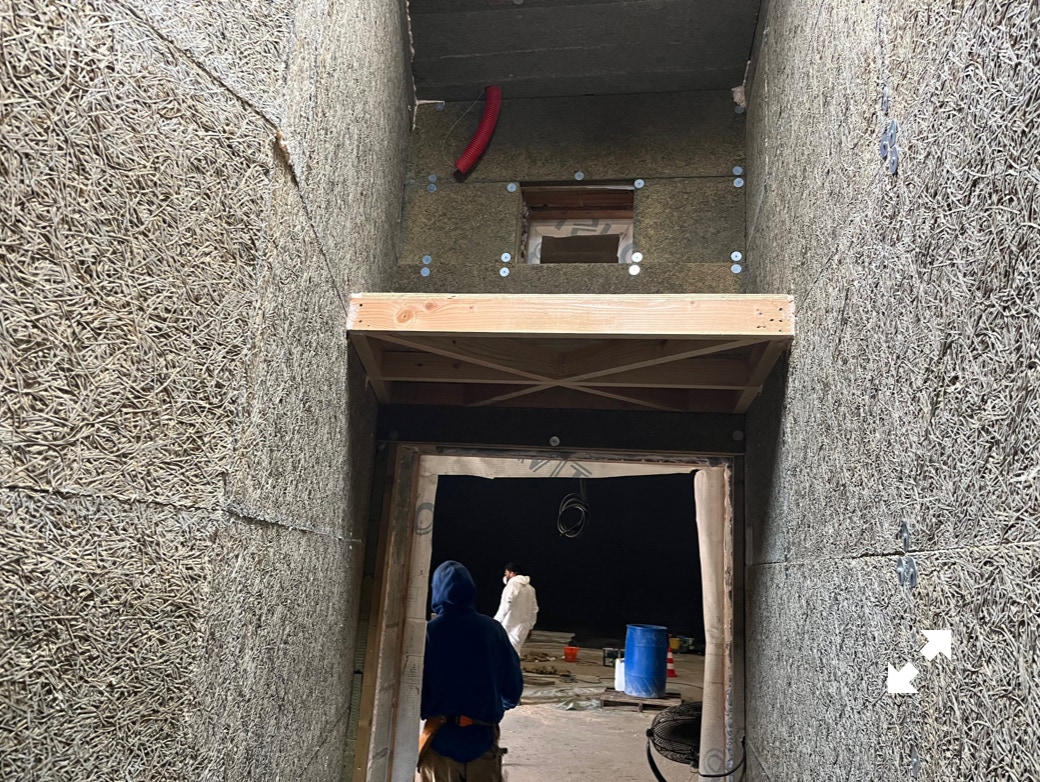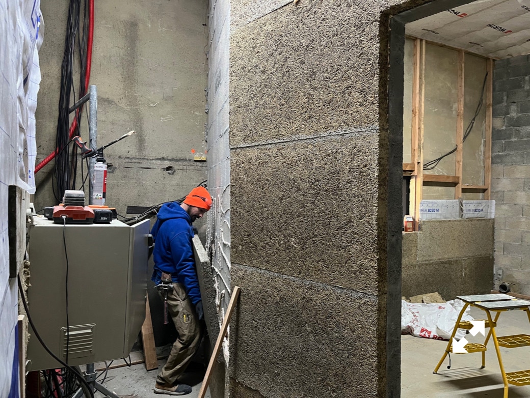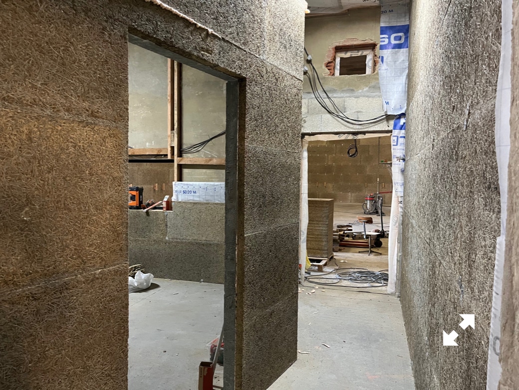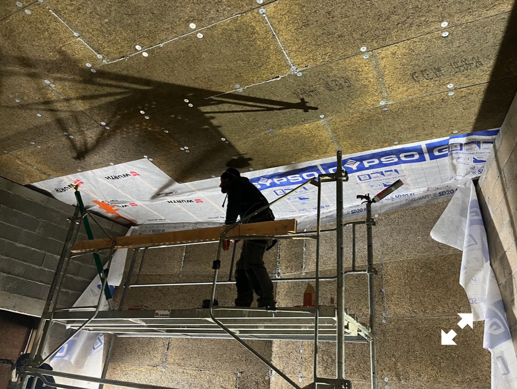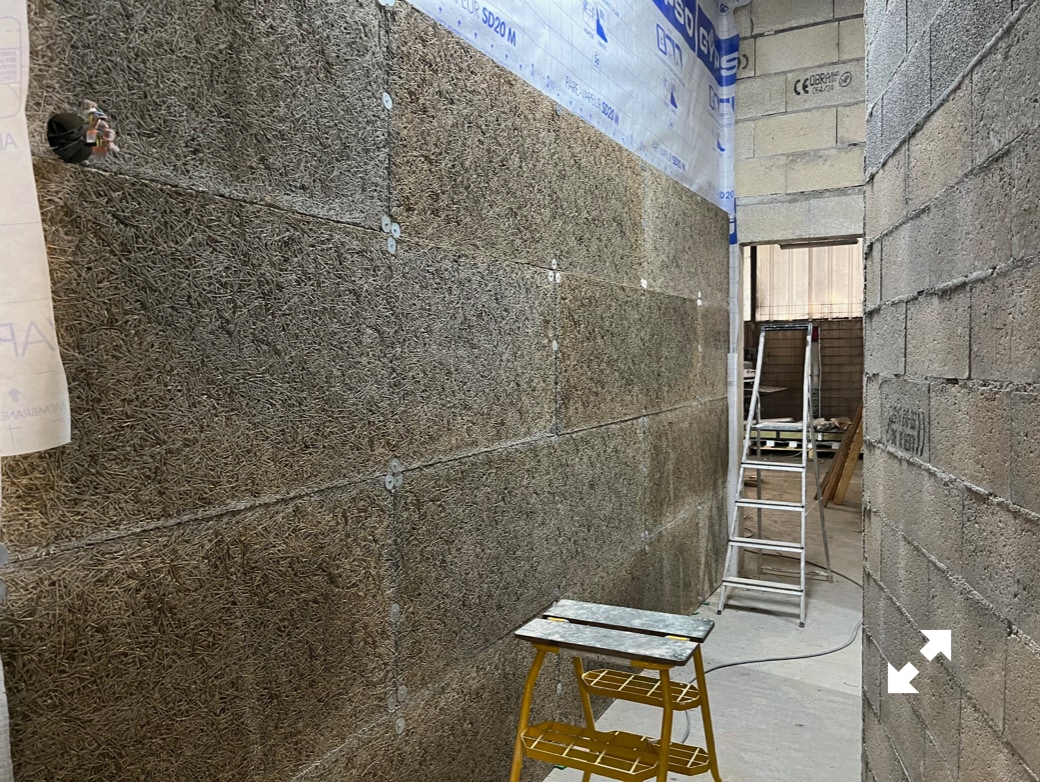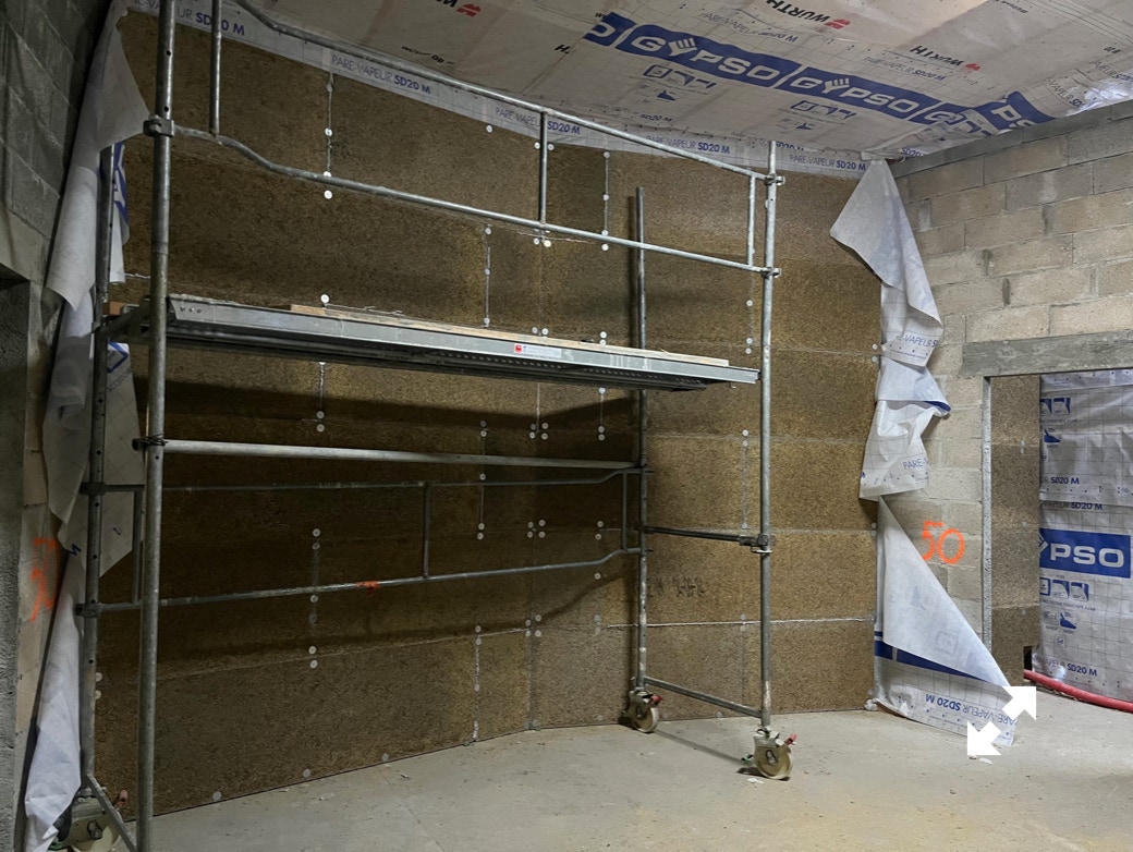 Pose des plaques de Fibralith sur le pare-vapeur et sur 10-12 cm de laine de roche incorporée à l’ossature secondaire, dans le couloir de la régie (mur coté sud). 31 janvier 2025