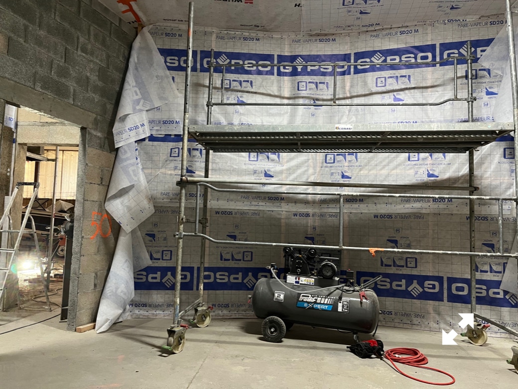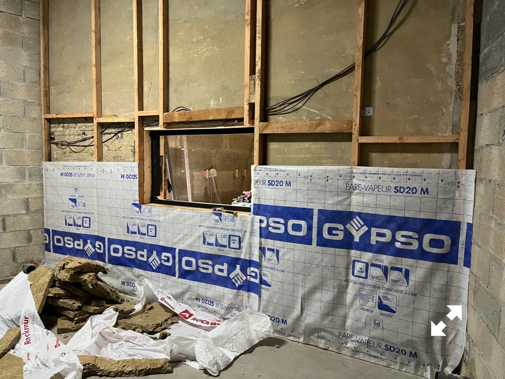 Pose du pare-vapeur sur le mur arrière de la Control Room (côté ouest). Dessous, isolation par 10-15 cm de laine de roche incorporée dans l’ossature secondaire. 31 janvier 2025