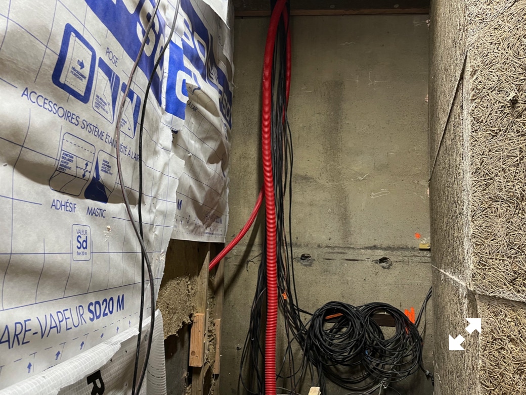 Descentes des gaines et câbles dans le local technique où sera installé le tableau général de distribution électrique. 19 février 2025