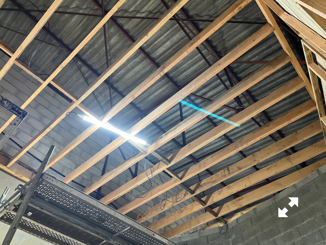 Ossature secondaire sur le devant (ici coté est) de la Control Room. Pose du pare-vapeur au plafond, placé juste au dessus du Fibralith. 30 janvier 2025