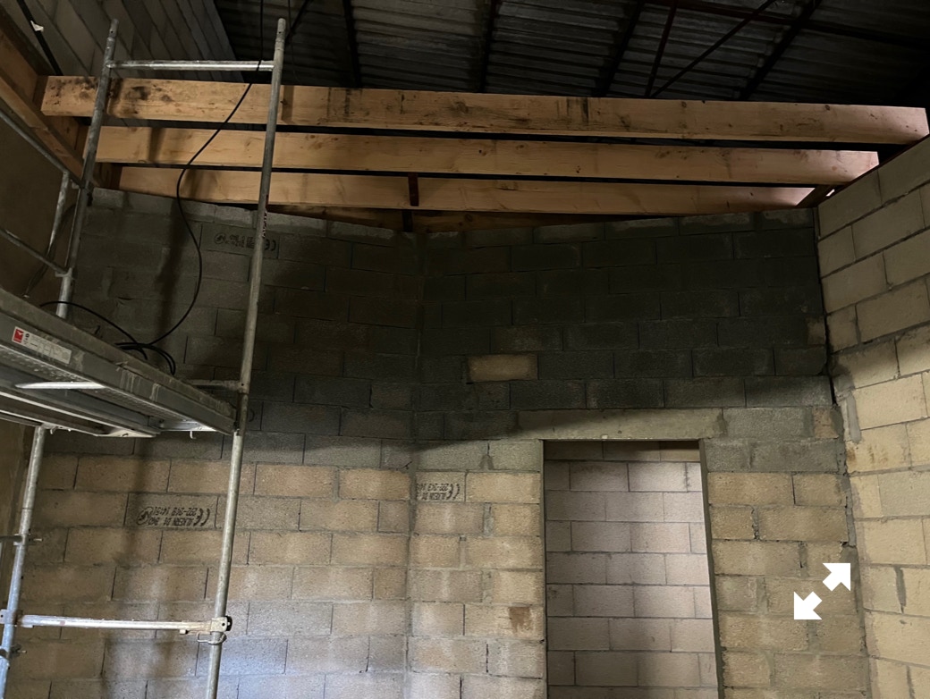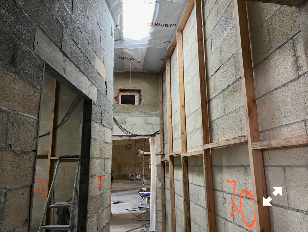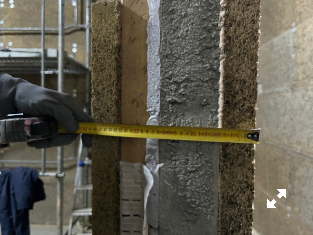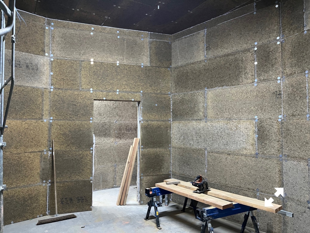 Sandwich d’isolation acoustique composé de : parpaings (25 cm), laine de roche (10-12cm), pare-vapeur, Fibralith (5 cm), façade de la Control Room. 6 février 2025