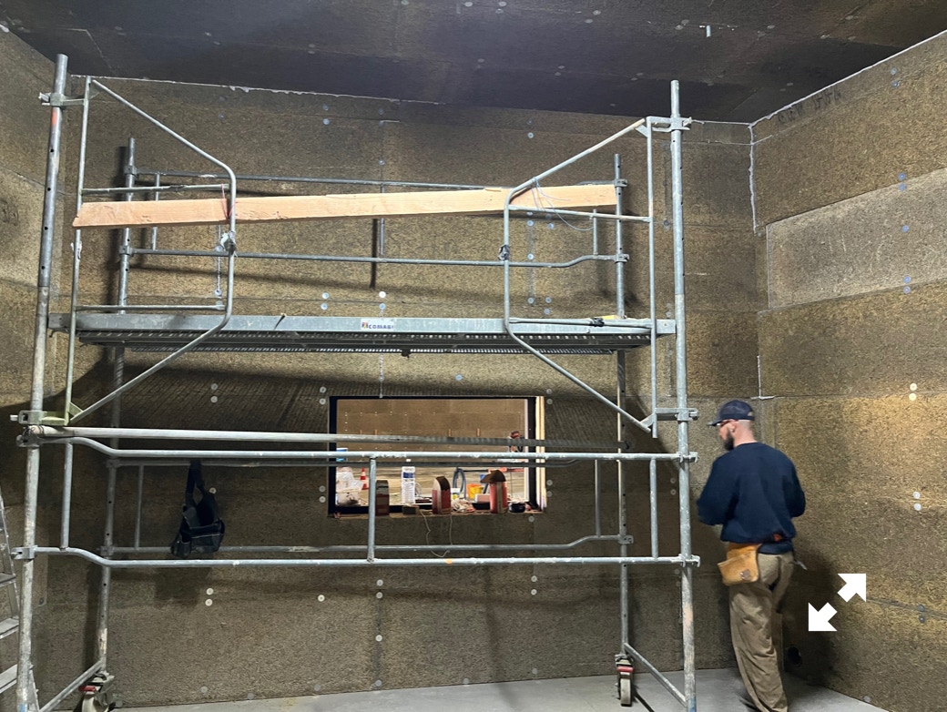Accroissement de l’installation des plaques très compactées de laine de roche sur les cloisons de la Control Room, autour de la fenêtre de communication. 12 février 2025