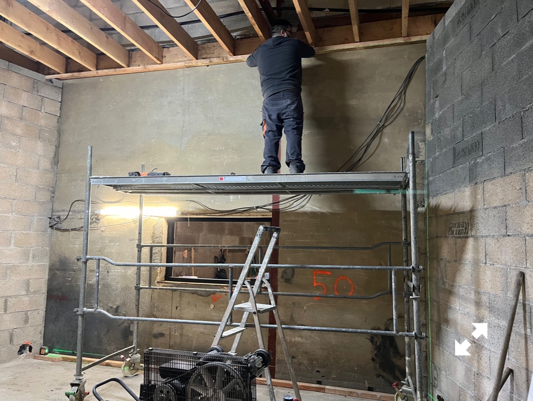 Pose du Fibralith sur la façade de la Control Room, autour de la fenêtre de communication. 14 février 2025