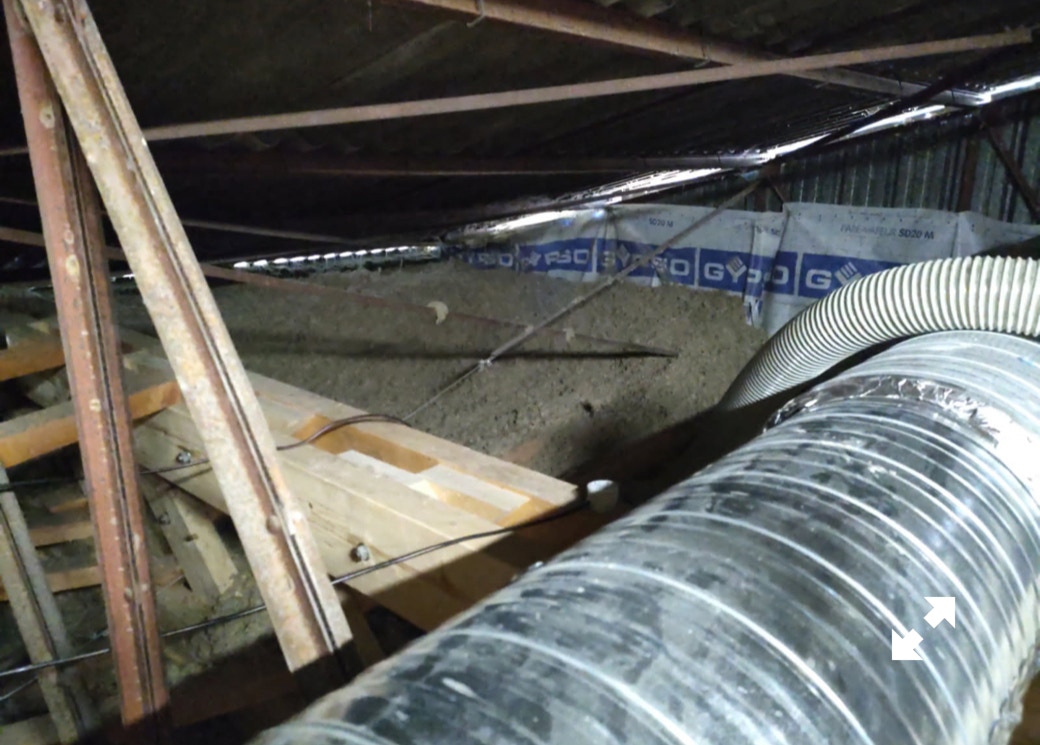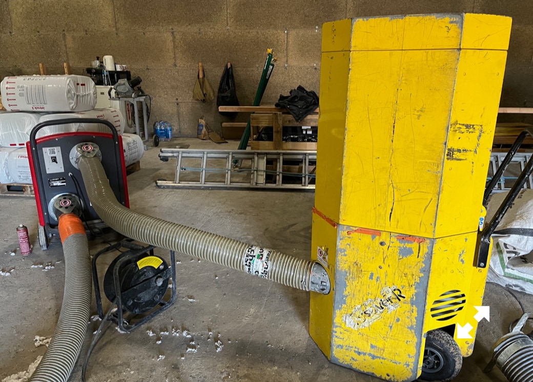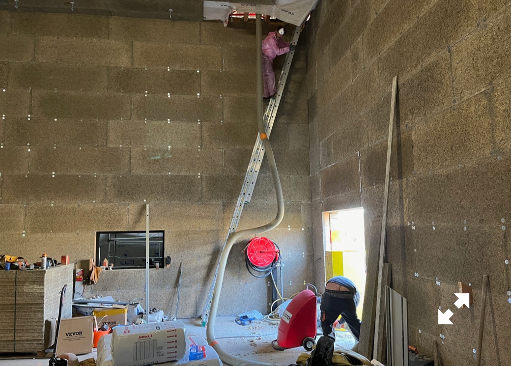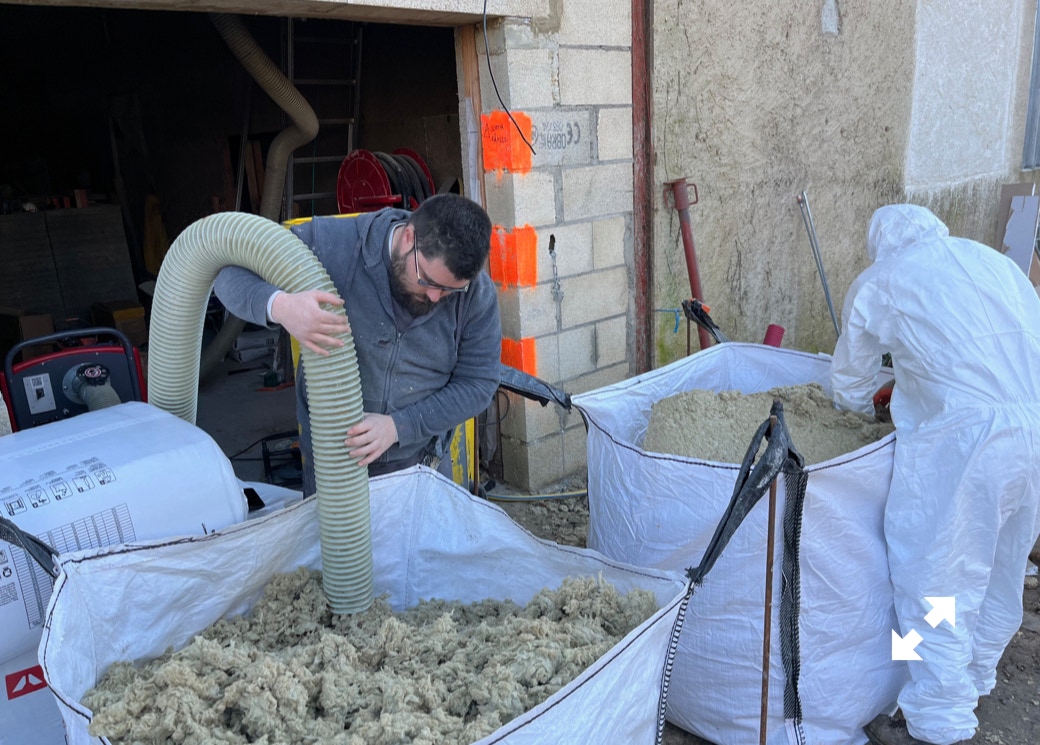 Pulvérisation de la laine de roche à la densité voulue, sur 60 cm d’épaisseur dans un premier temps, puis 80 cm au milieu du bâtiment et 120 cm sur les tuyaux d’évacuation de l’air. 4 février 2025