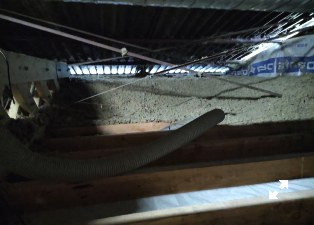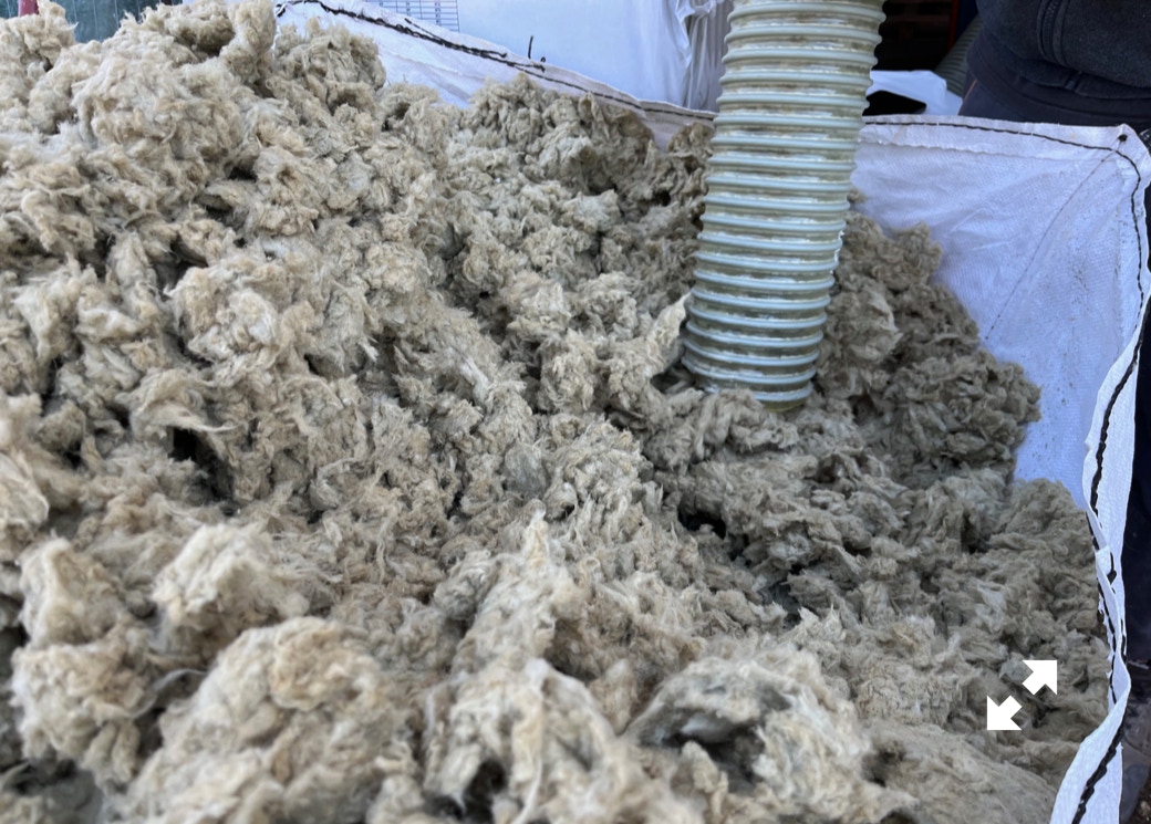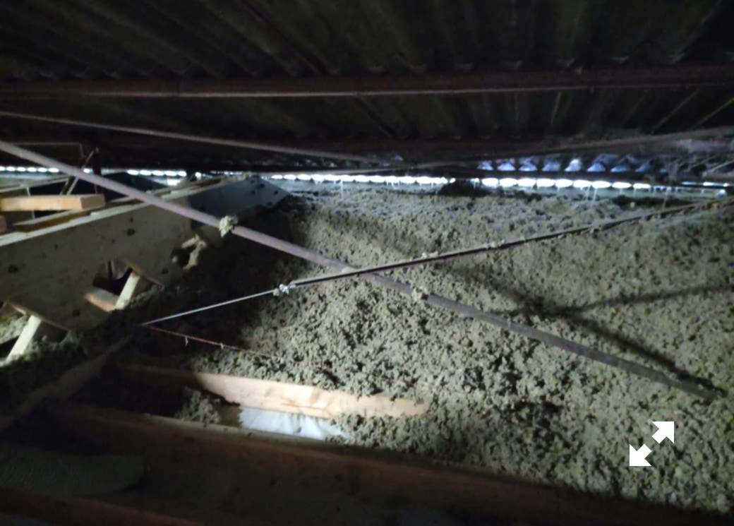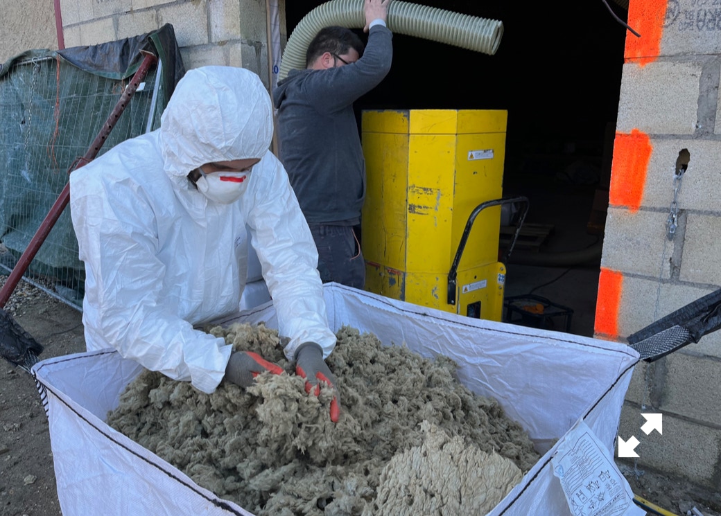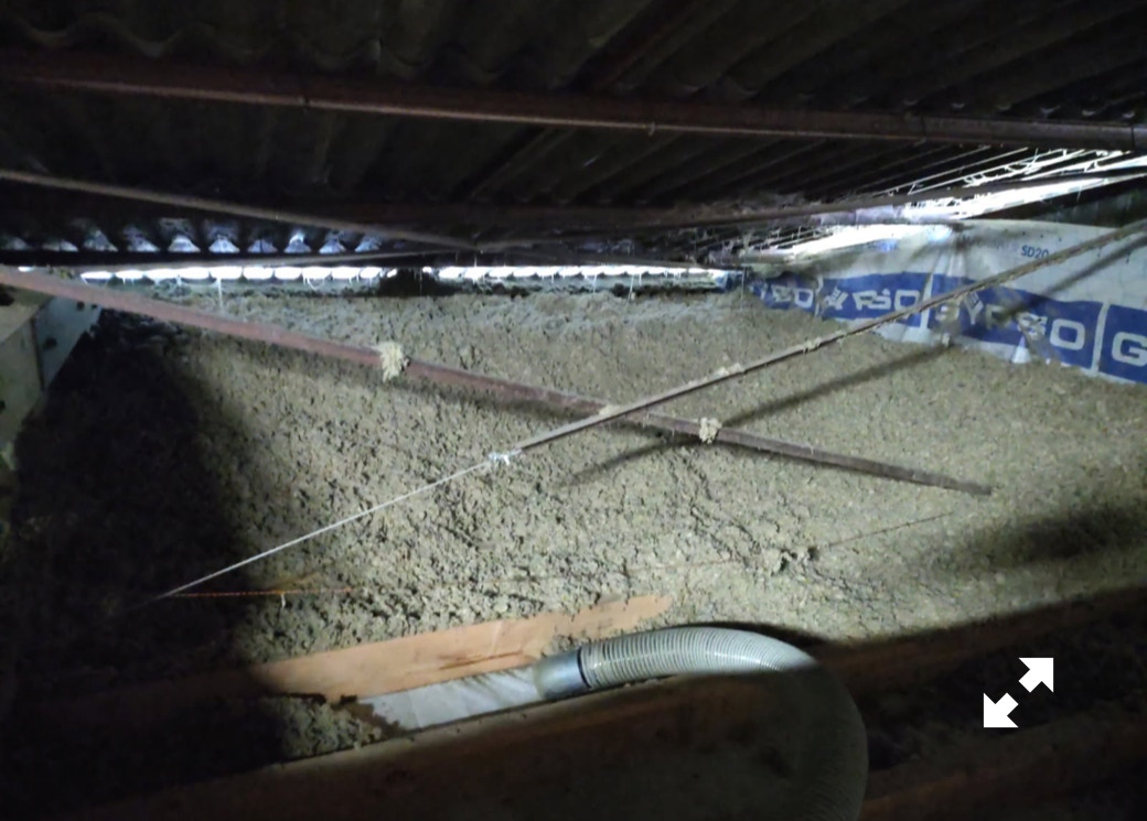 Pulvérisation de la laine de roche à la densité voulue, sur 60 cm d’épaisseur dans un premier temps, puis 80 cm au milieu du bâtiment et 120 cm sur les tuyaux d’évacuation de l’air. 4 février 2025