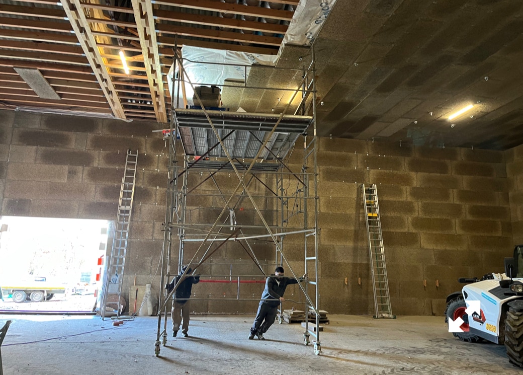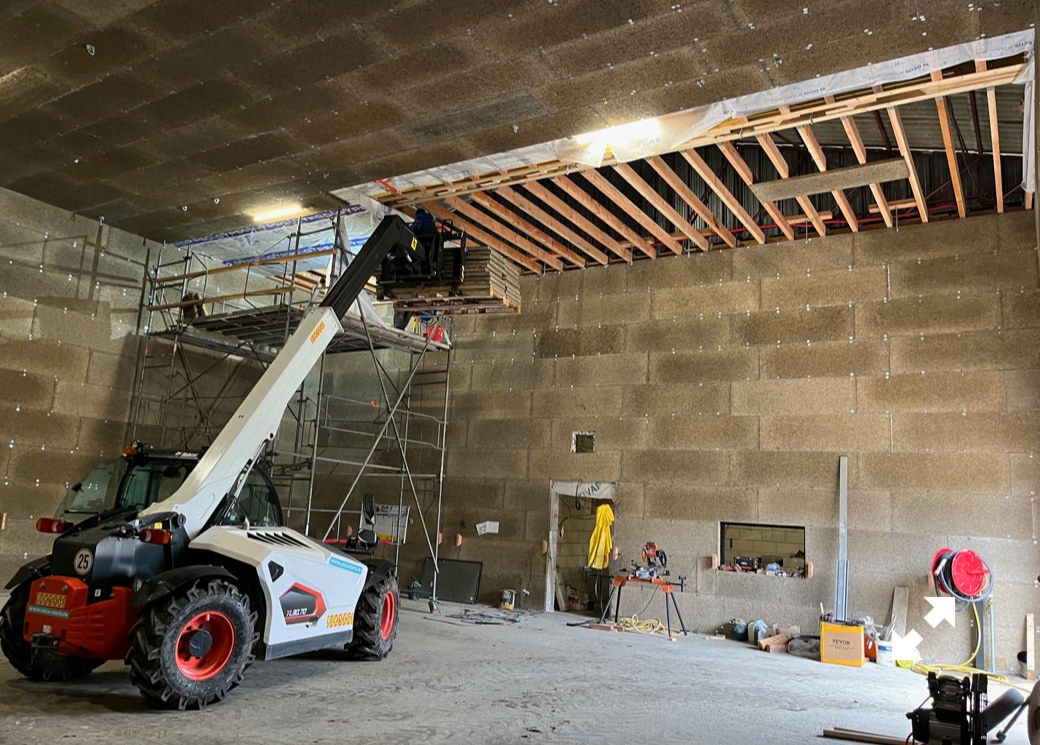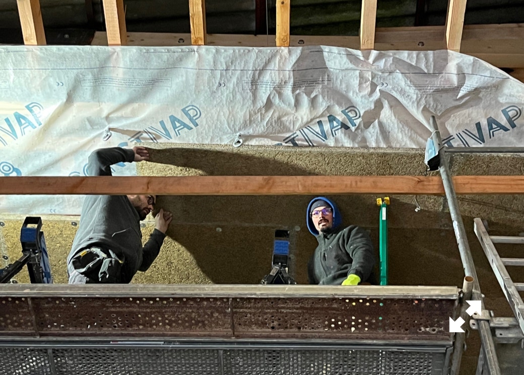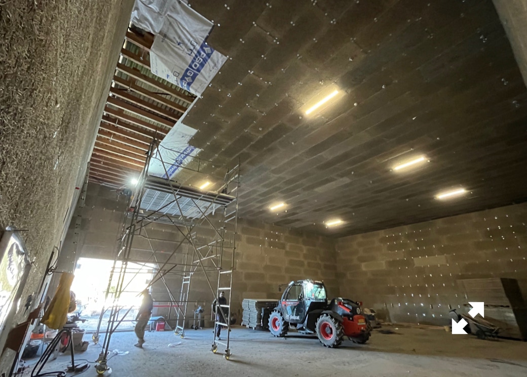 La moitié de la pose des plaques de Fibralith est dépassée à ce jour (couverture de 10 x 15 m sur les 300 m2 total). Préparation à la mise en place de la tuyauterie d’aération. 12 décembre 2024