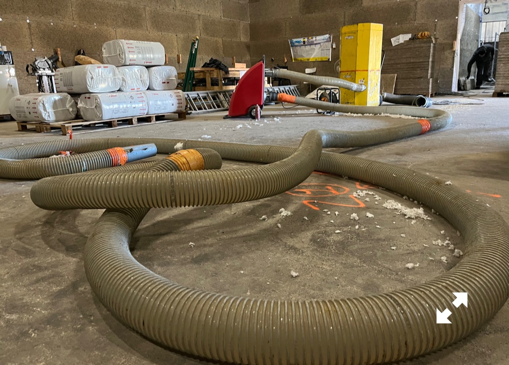30 mètres de tuyau pour garnir de laine de roche pulvérisée tous les combles, sur le plafond de Fibralith et le pare-vapeur. 4 février 2025