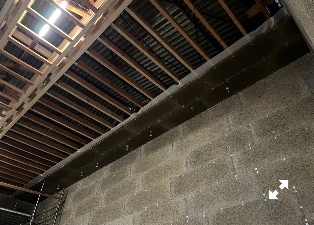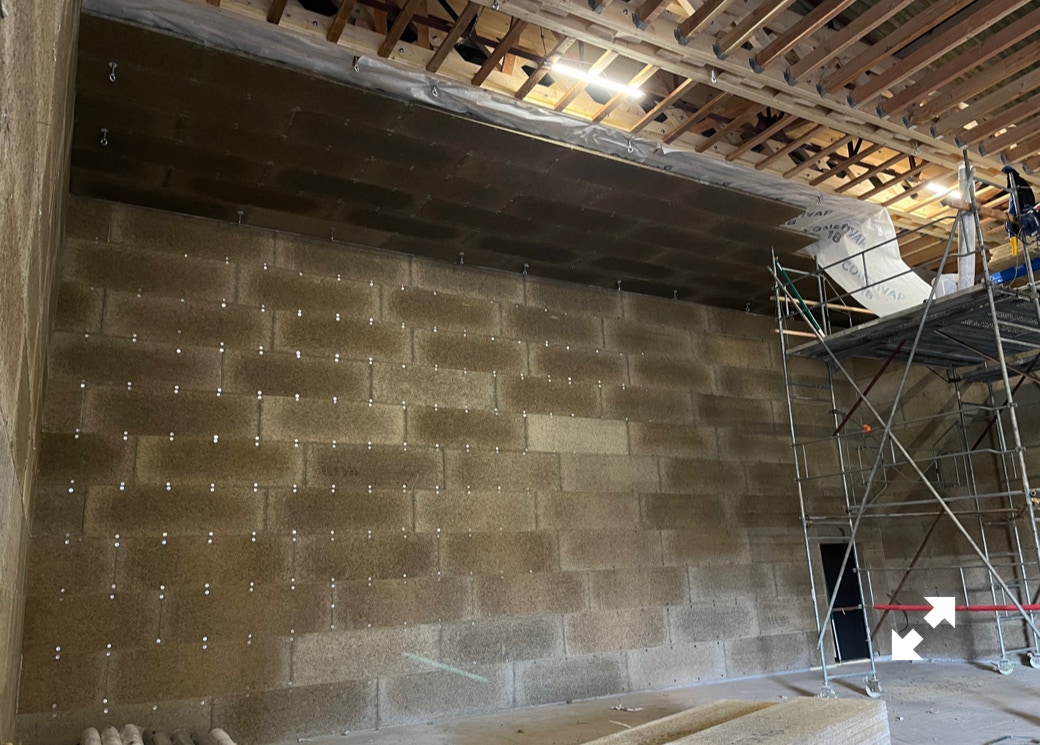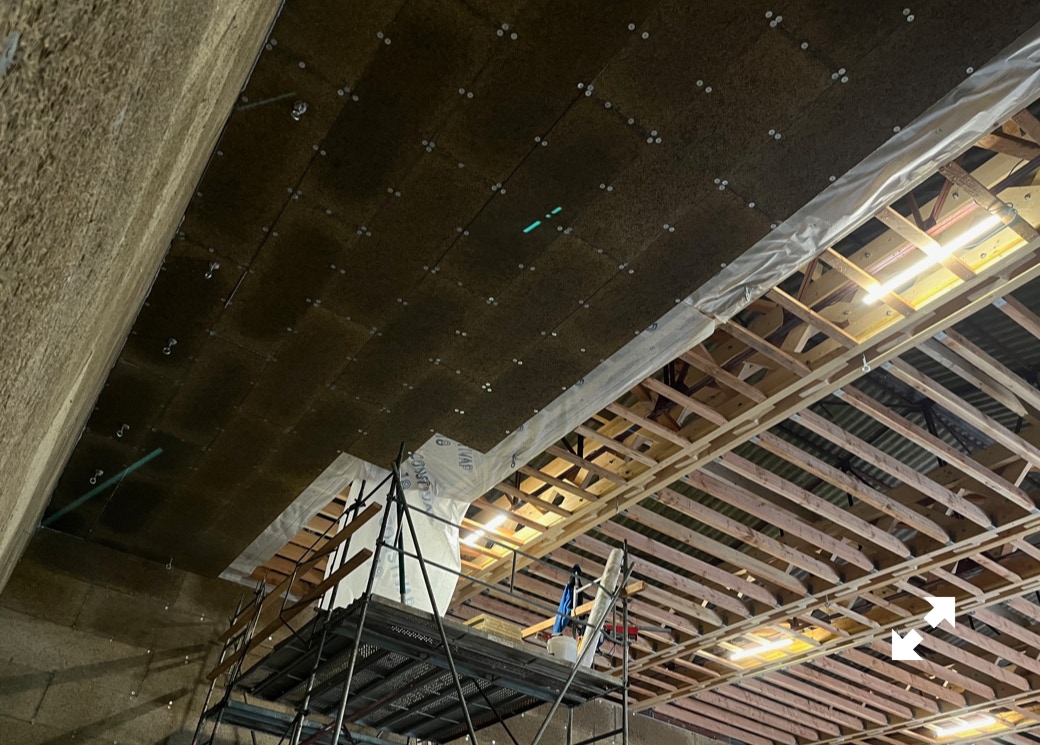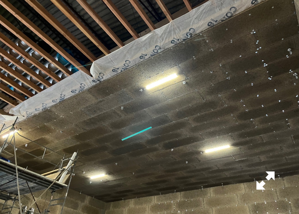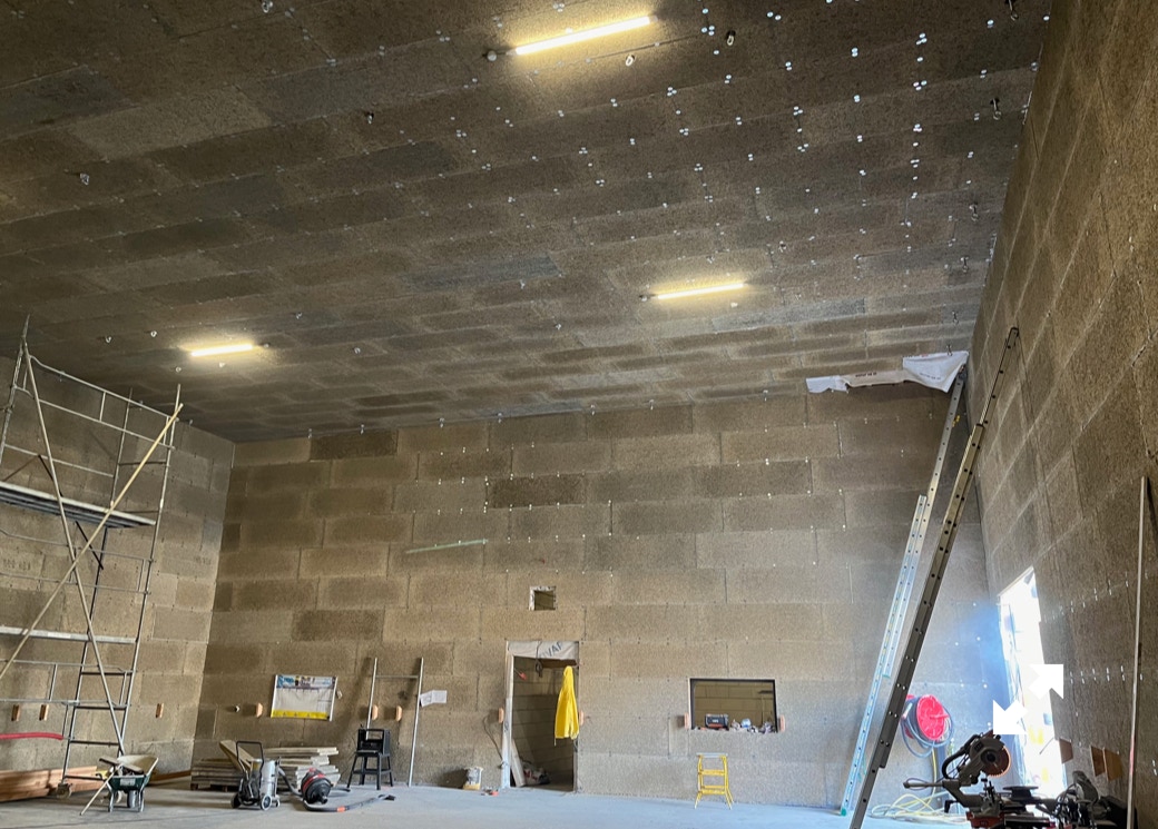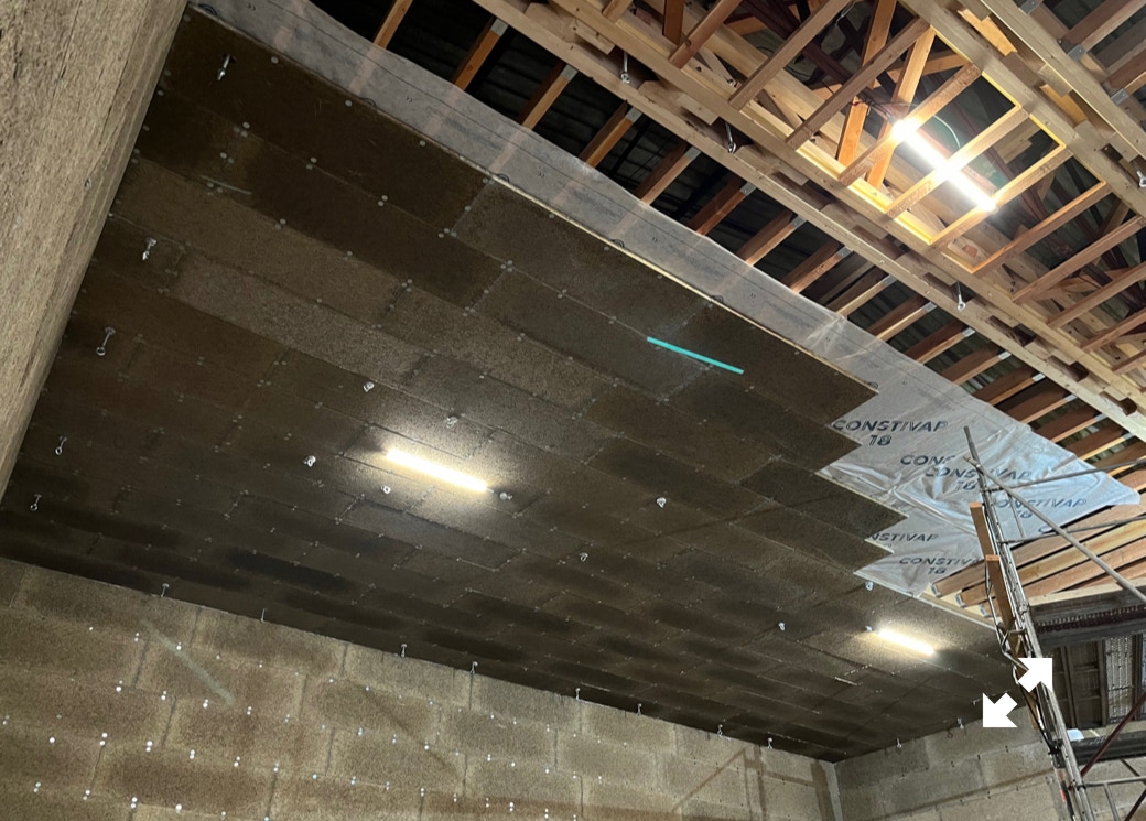 L’isolation acoustique du plafond est constituée de laine de roche compactée, allant de 60 à 80 cm d’épaisseur, installée dans et sur l’ossature secondaire en bois. Le traitement acoustique emploie du Fibralith gris de 50 mm, identique à celui utilisé pour les murs. L’humidité est combattue par l’installation d’un pare-vapeur entre la laine de roche et les plaques de Fibralith. Les fers de la charpente ne toucheront pas l’ossature secondaire qui soutient l’isolation et le traitement acoustique.