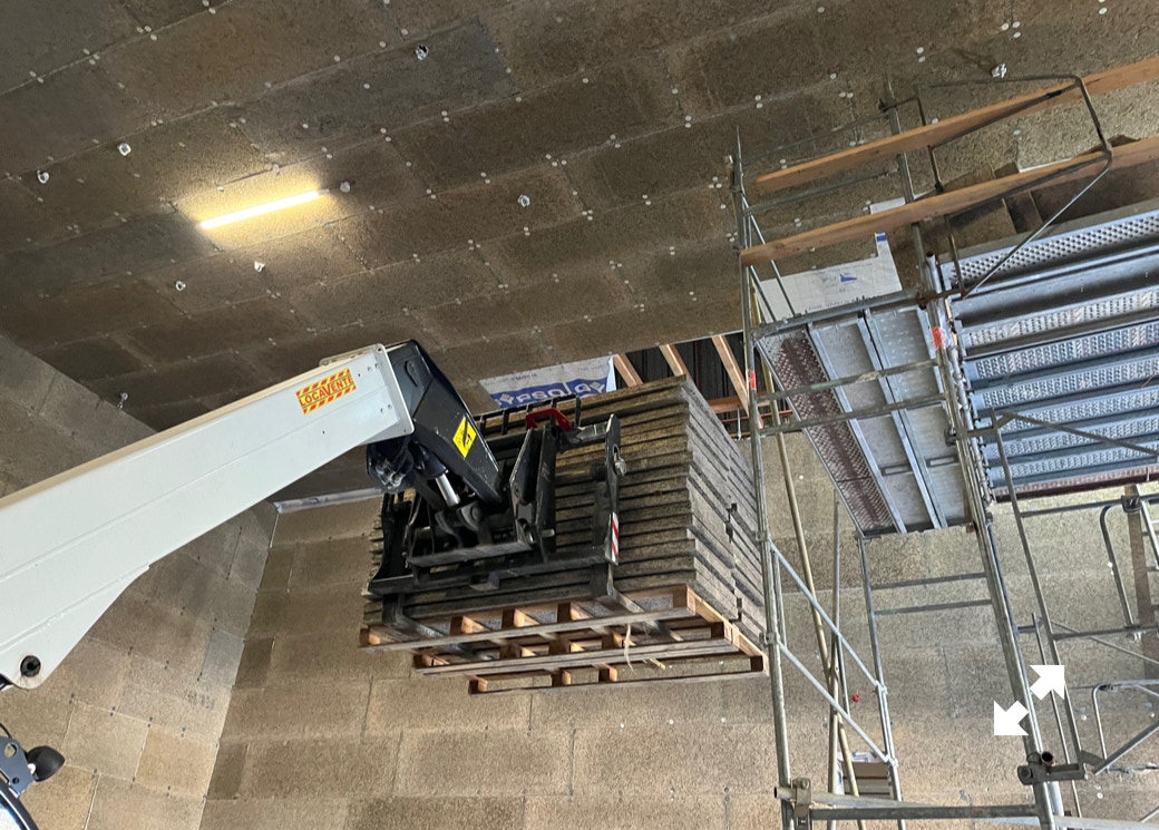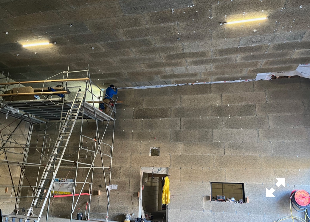 Déplacement de l’échafaudage, avancement vers les deux tiers de la pose du Fibralth au plafond. 19 décembre 2024