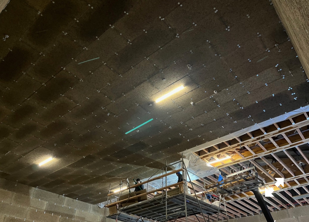 Progression de la pose des plaques de Fibralth au plafond. On sera à la moitié du travail à la fin de cette semaine. 11 décembre 2024