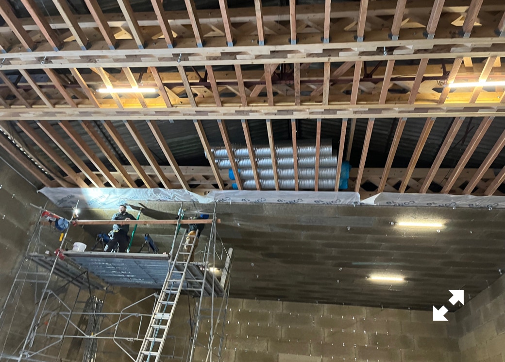 Plafond terminé. On laisse une trappe provisoire d’accès sur le côté nord-ouest. L’échafaudage qui servira à présent pour l’installation de la ventilation, des panneaux acoustique et pour peindre a été raccourcis. 15 janvier 2025