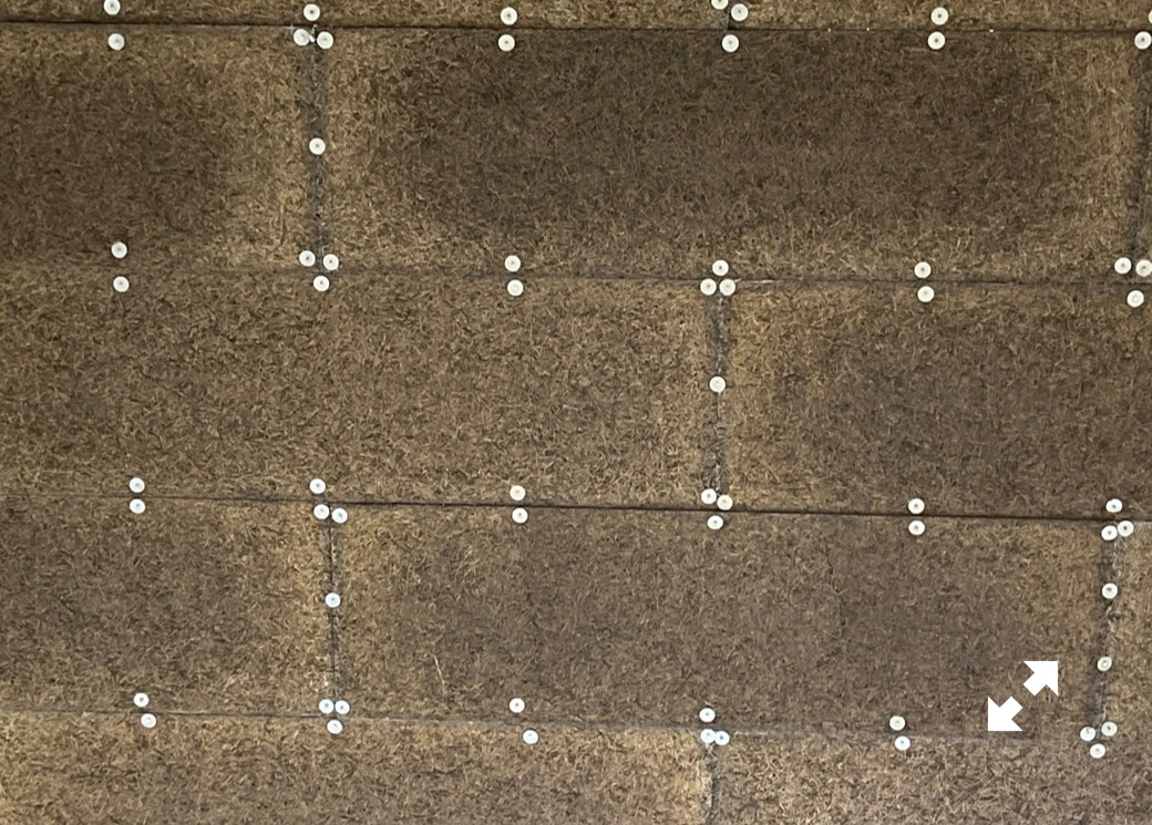 Méthode de suspension des plaques de Fibralith au plafond. Le nombre de vis au m2 est supérieur à celui des murs, pour obtenir plus de solidité. 6 décembre 2024