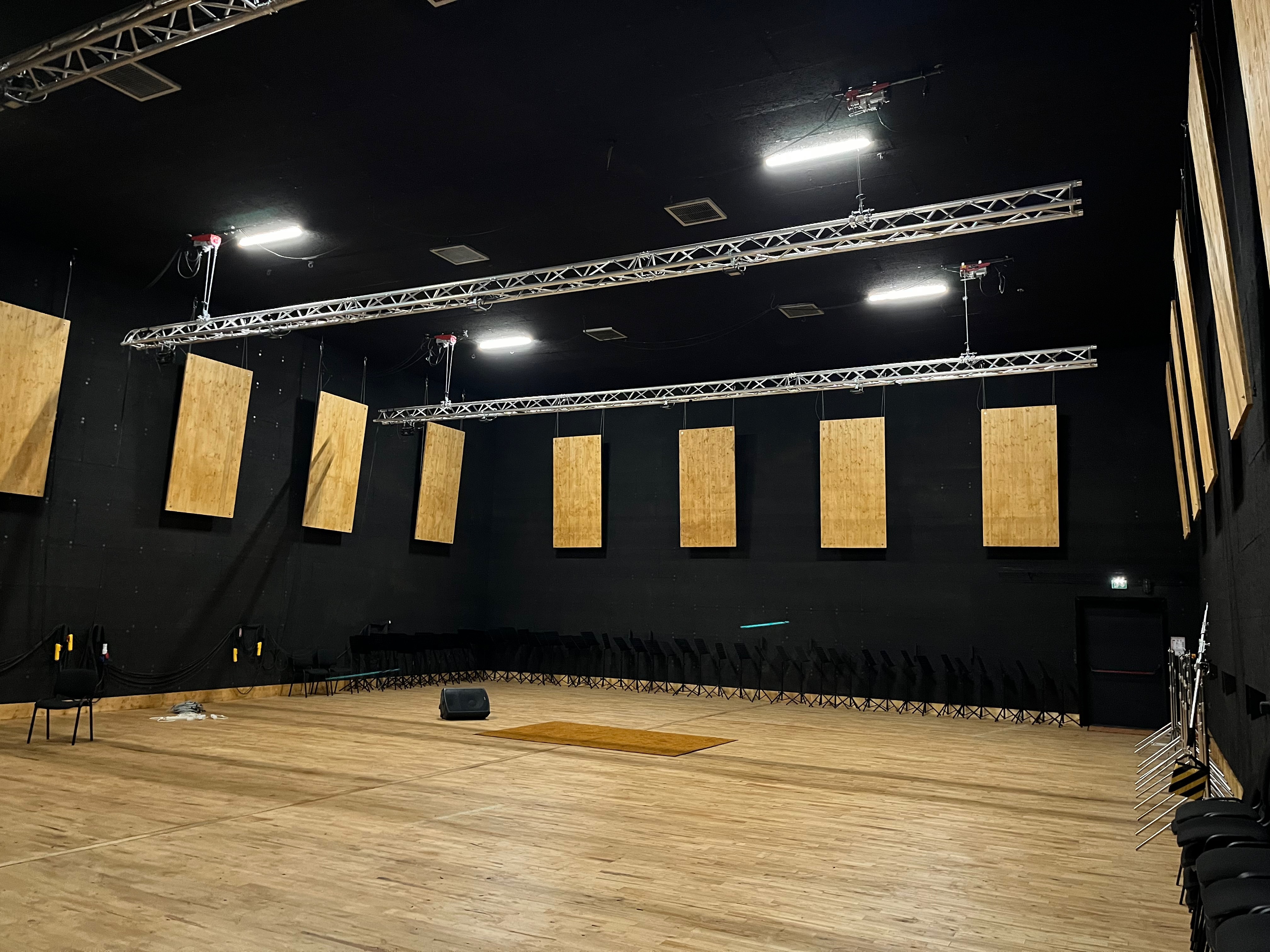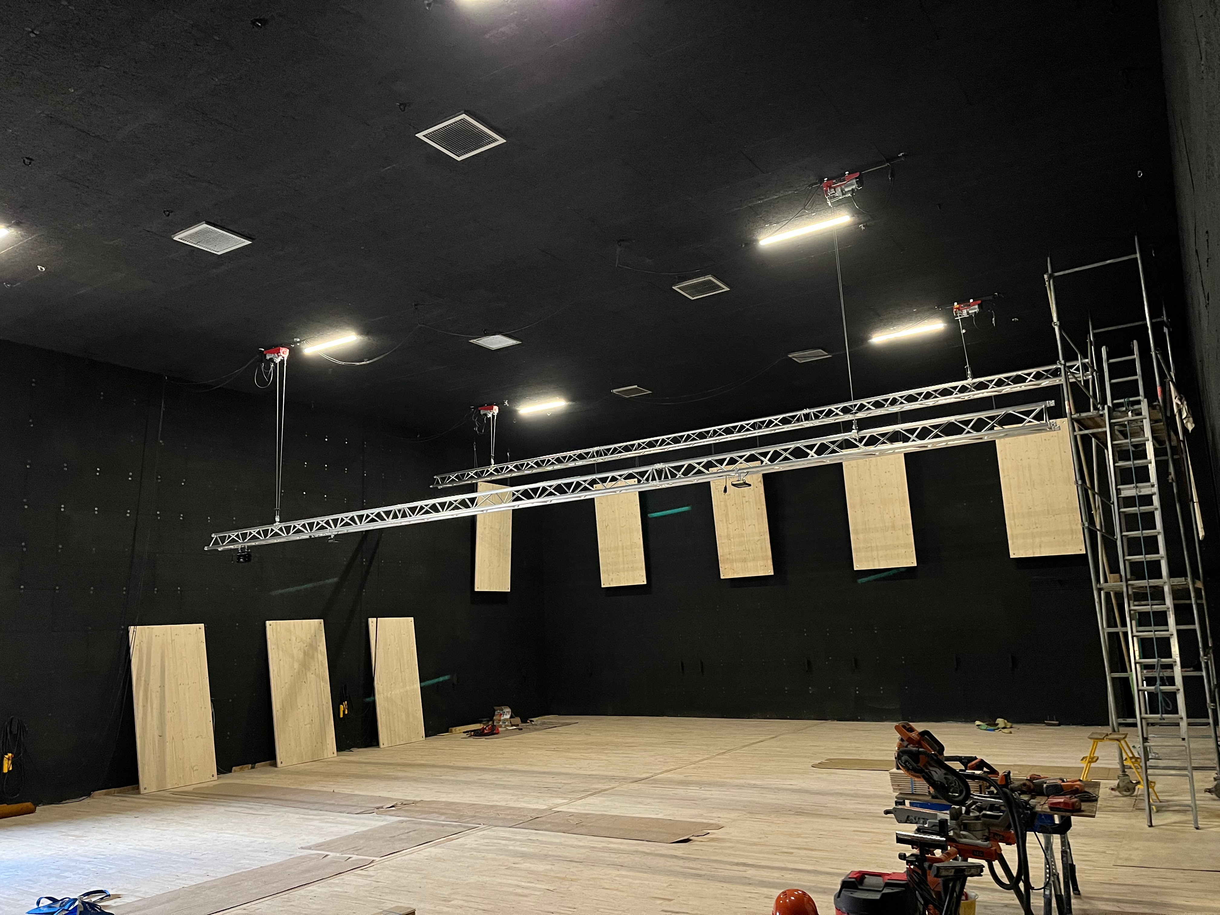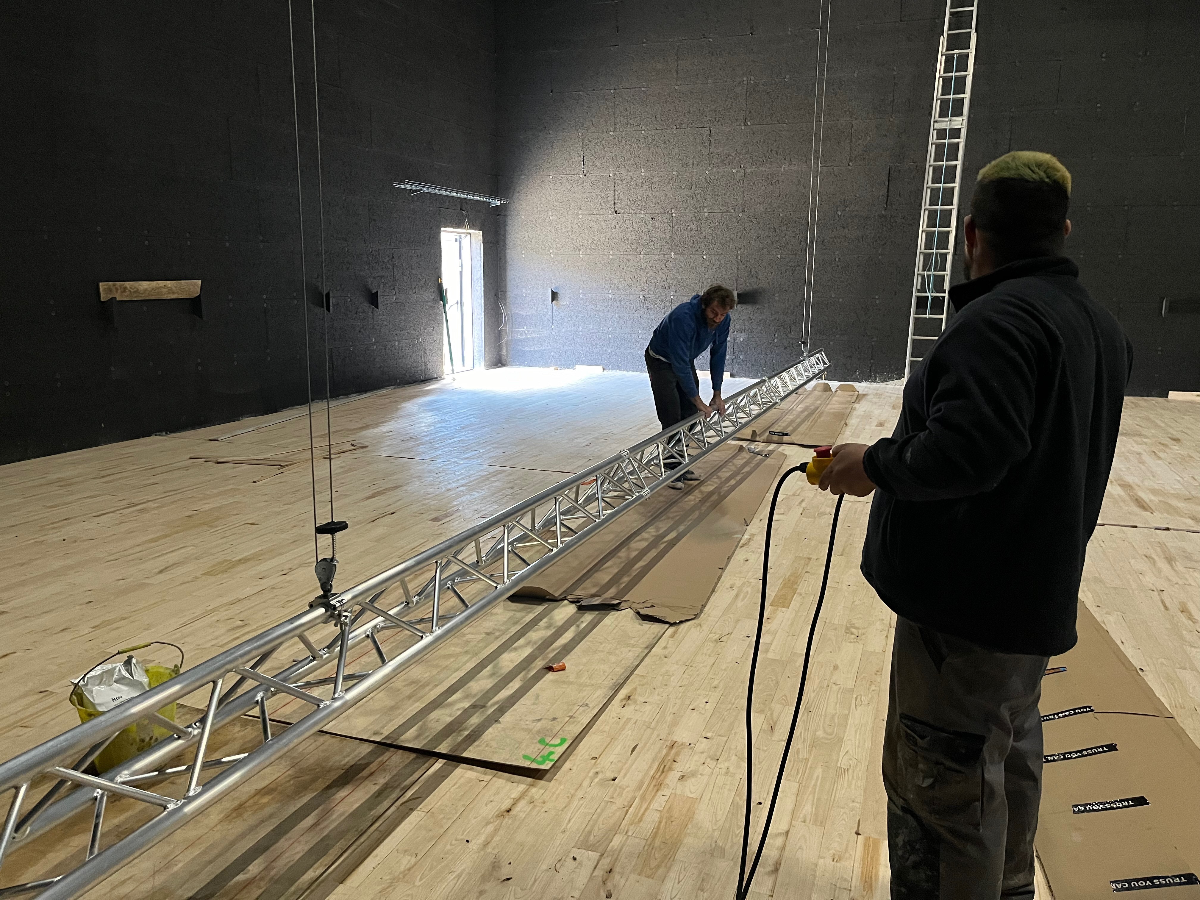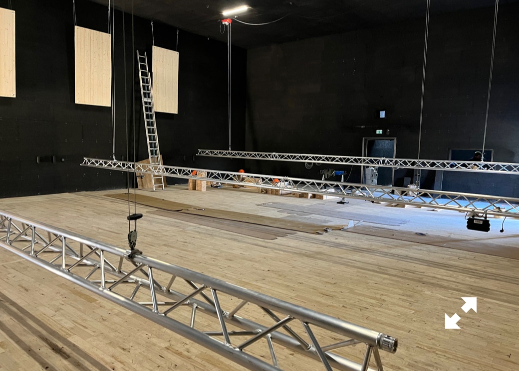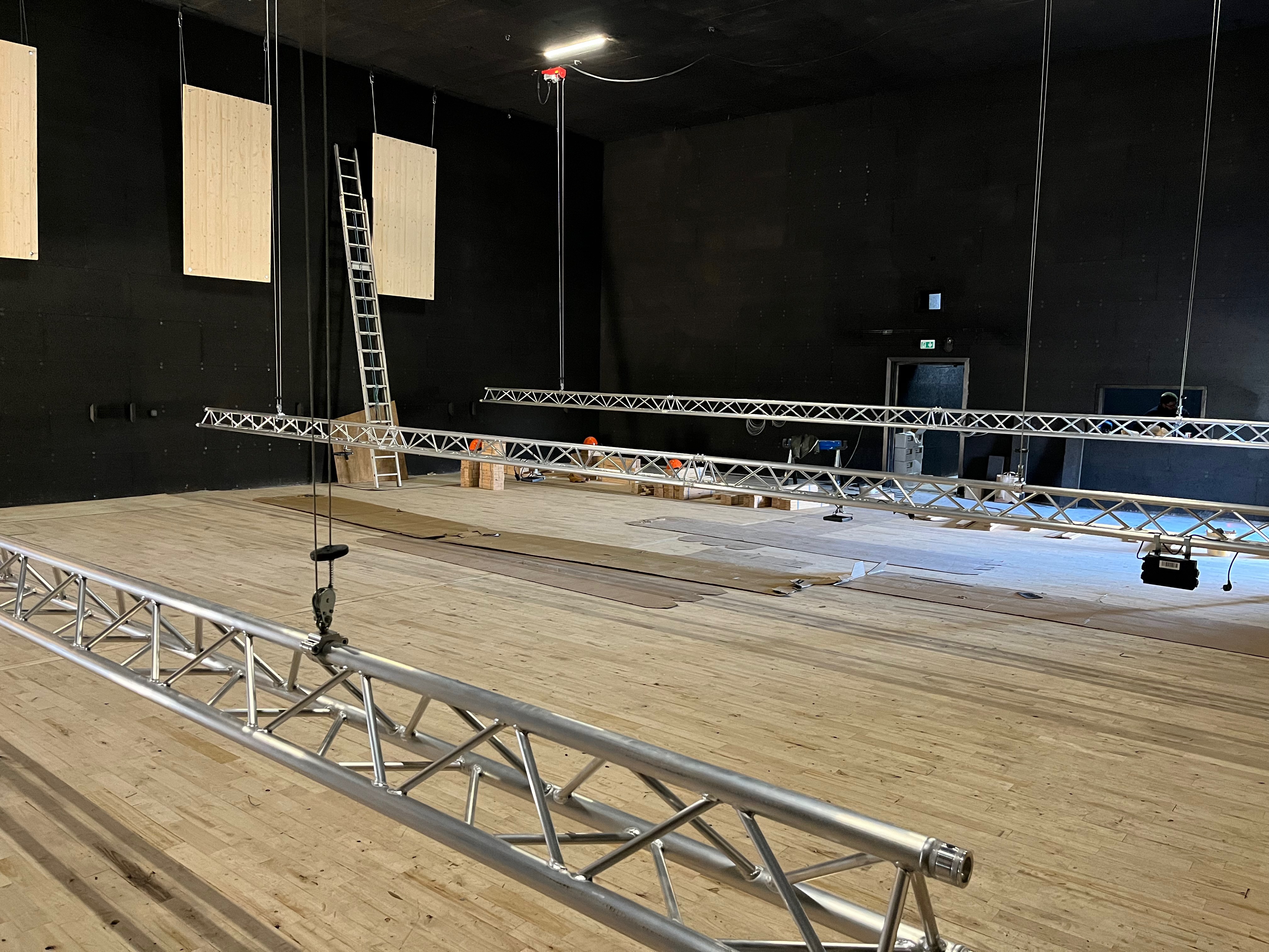 Le plateau sera équipé de 3 poutres métalliques en treillis triangulaire de 30 cm de côté et de 12 mètres de long, afin de suspendre le grill de projecteurs, les gradateurs de lumière et divers accessoires nécessaires aux installations du plateau pour l’enregistrement sonore ou le tournage d’images. Les longues poutres métalliques seront suspendues par des treuils électriques (charge maximale de 800 kg par treuil).