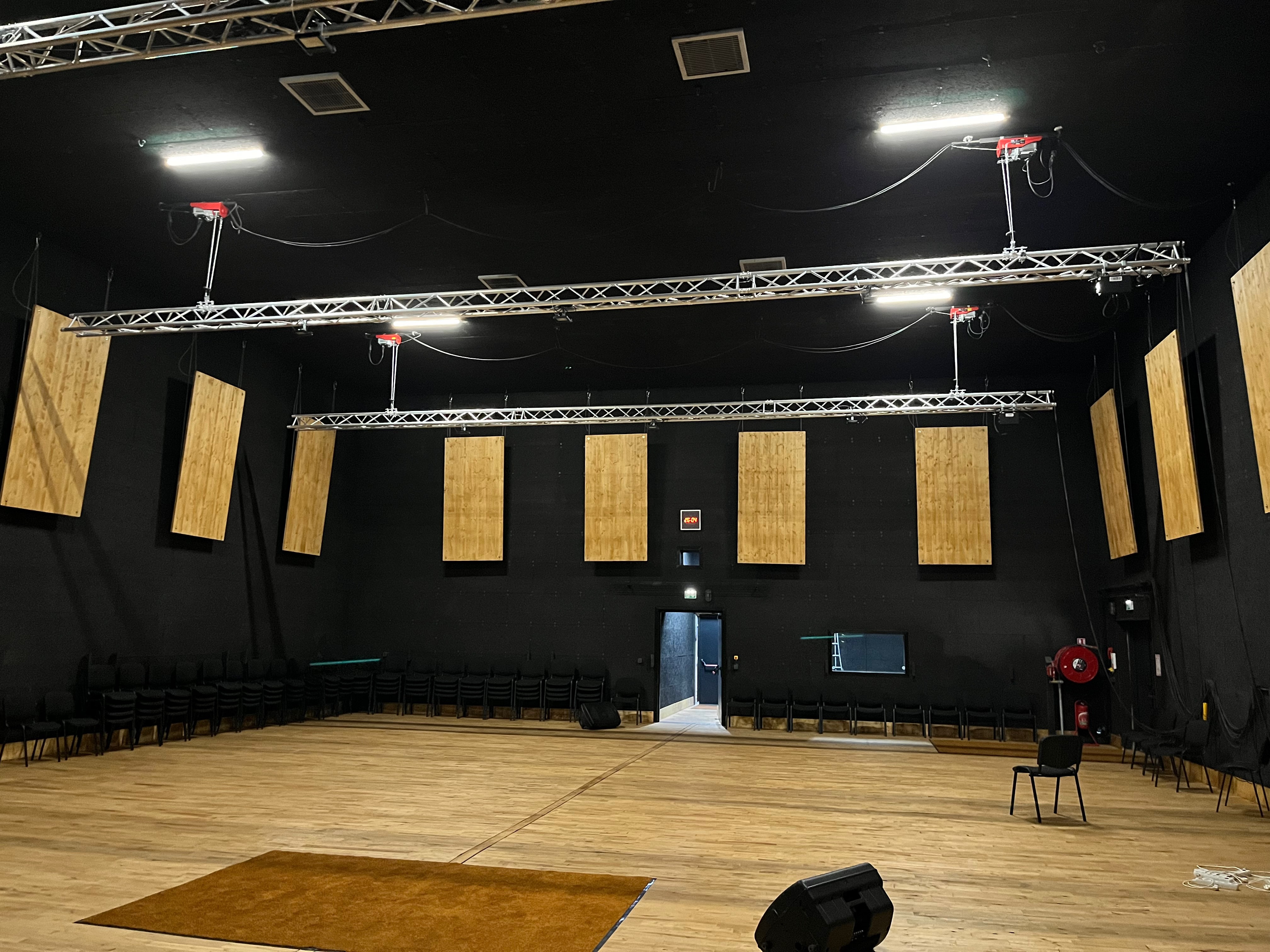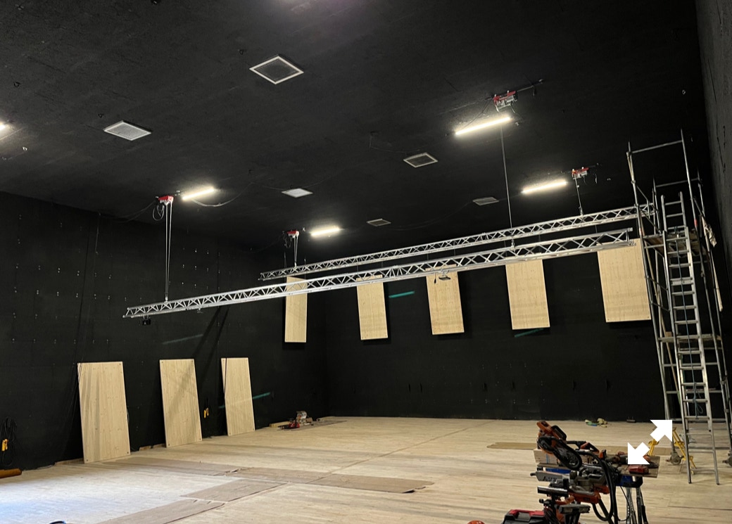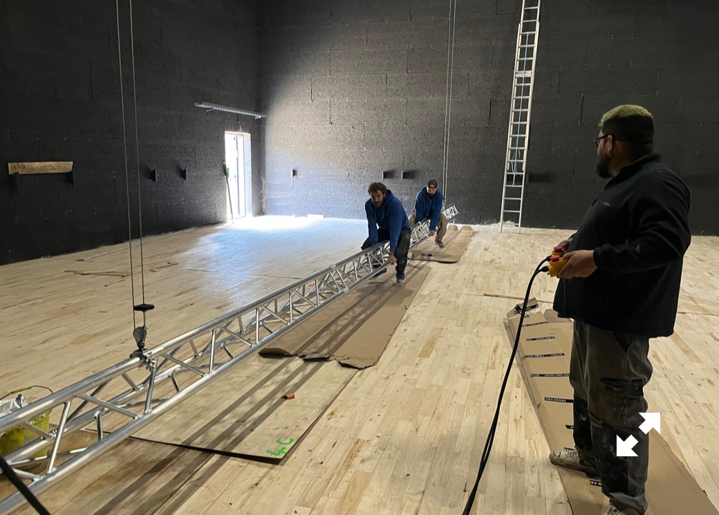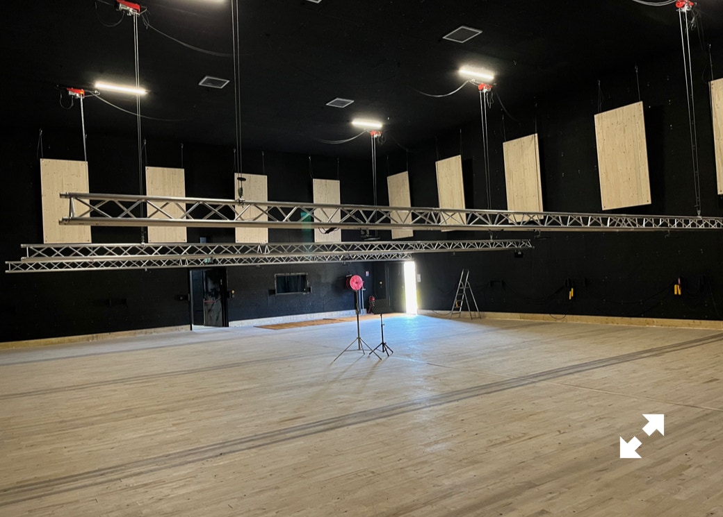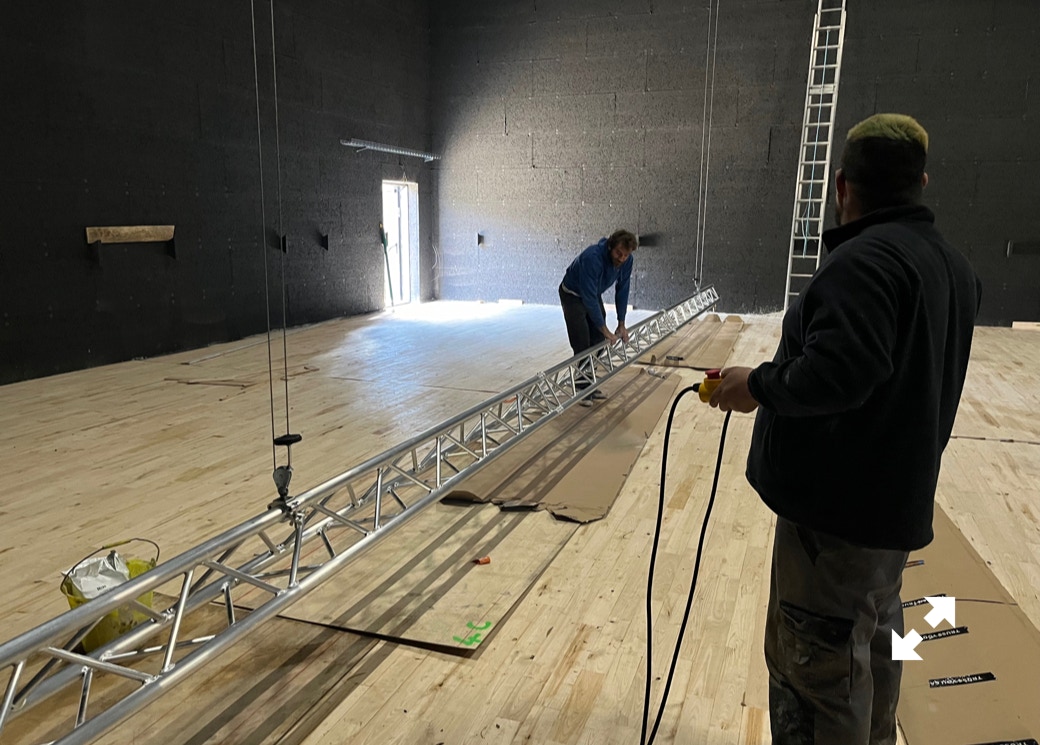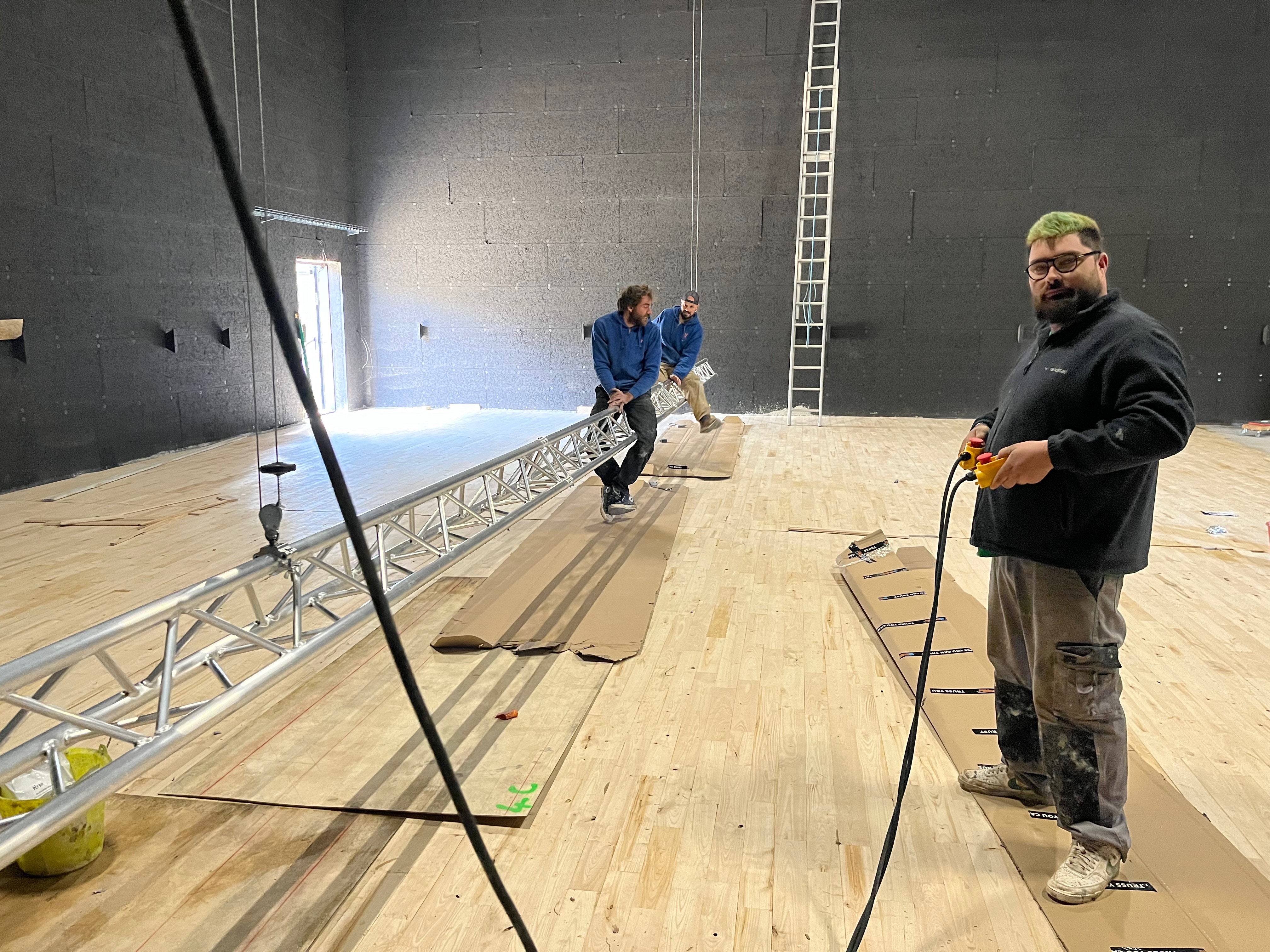 Le plateau sera équipé de 3 poutres métalliques en treillis triangulaire de 30 cm de côté et de 12 mètres de long, afin de suspendre le grill de projecteurs, les gradateurs de lumière et divers accessoires nécessaires aux installations du plateau pour l’enregistrement sonore ou le tournage d’images. Les longues poutres métalliques seront suspendues par des treuils électriques (charge maximale de 800 kg par treuil).
