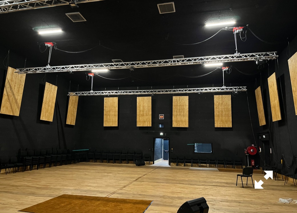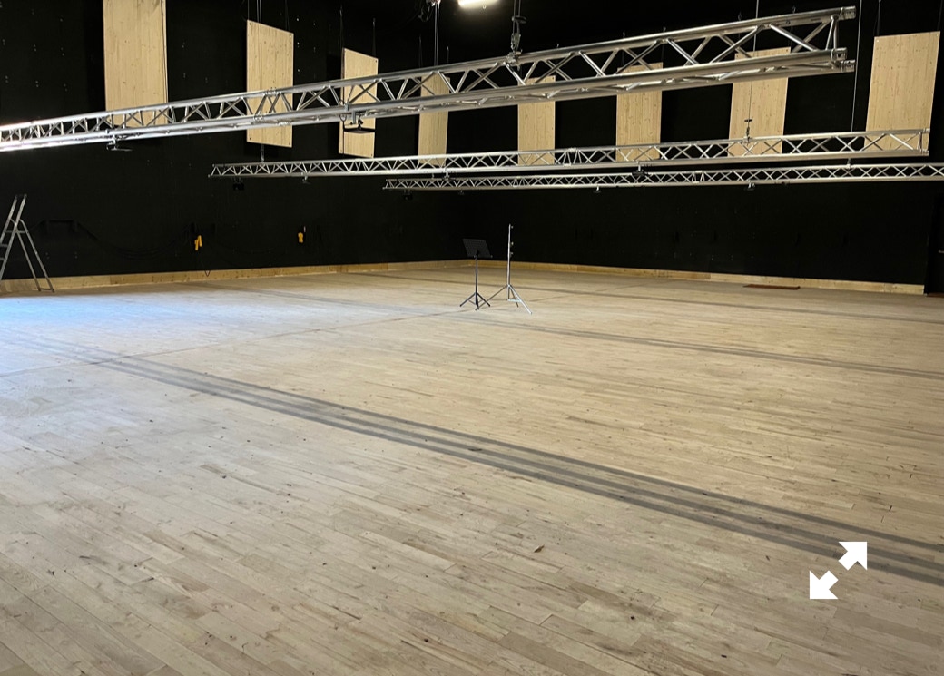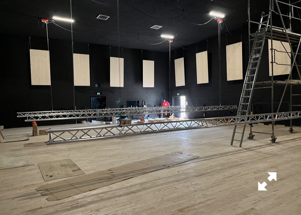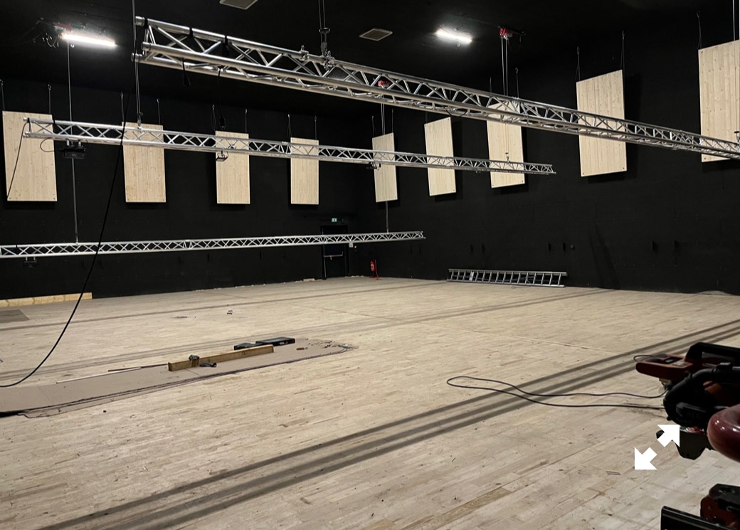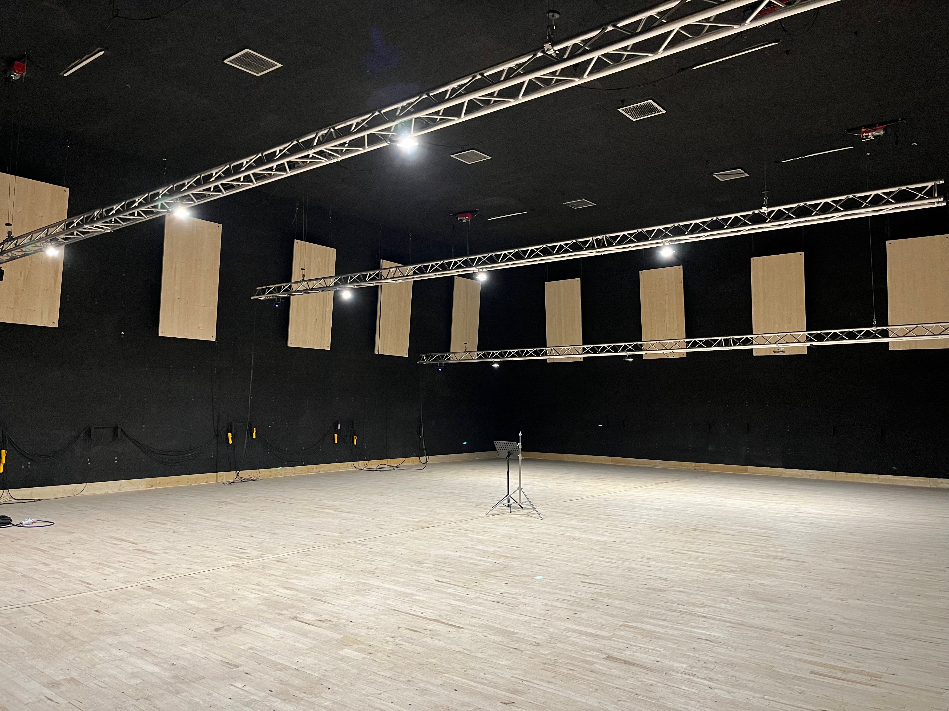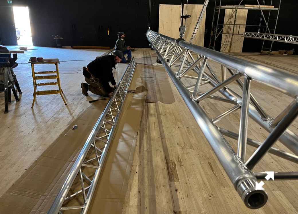 Le plateau sera équipé de 3 poutres métalliques en treillis triangulaire de 30 cm de côté et de 12 mètres de long, afin de suspendre le grill de projecteurs, les gradateurs de lumière et divers accessoires nécessaires aux installations du plateau pour l’enregistrement sonore ou le tournage d’images. Les longues poutres métalliques seront suspendues par des treuils électriques (charge maximale de 800 kg par treuil).