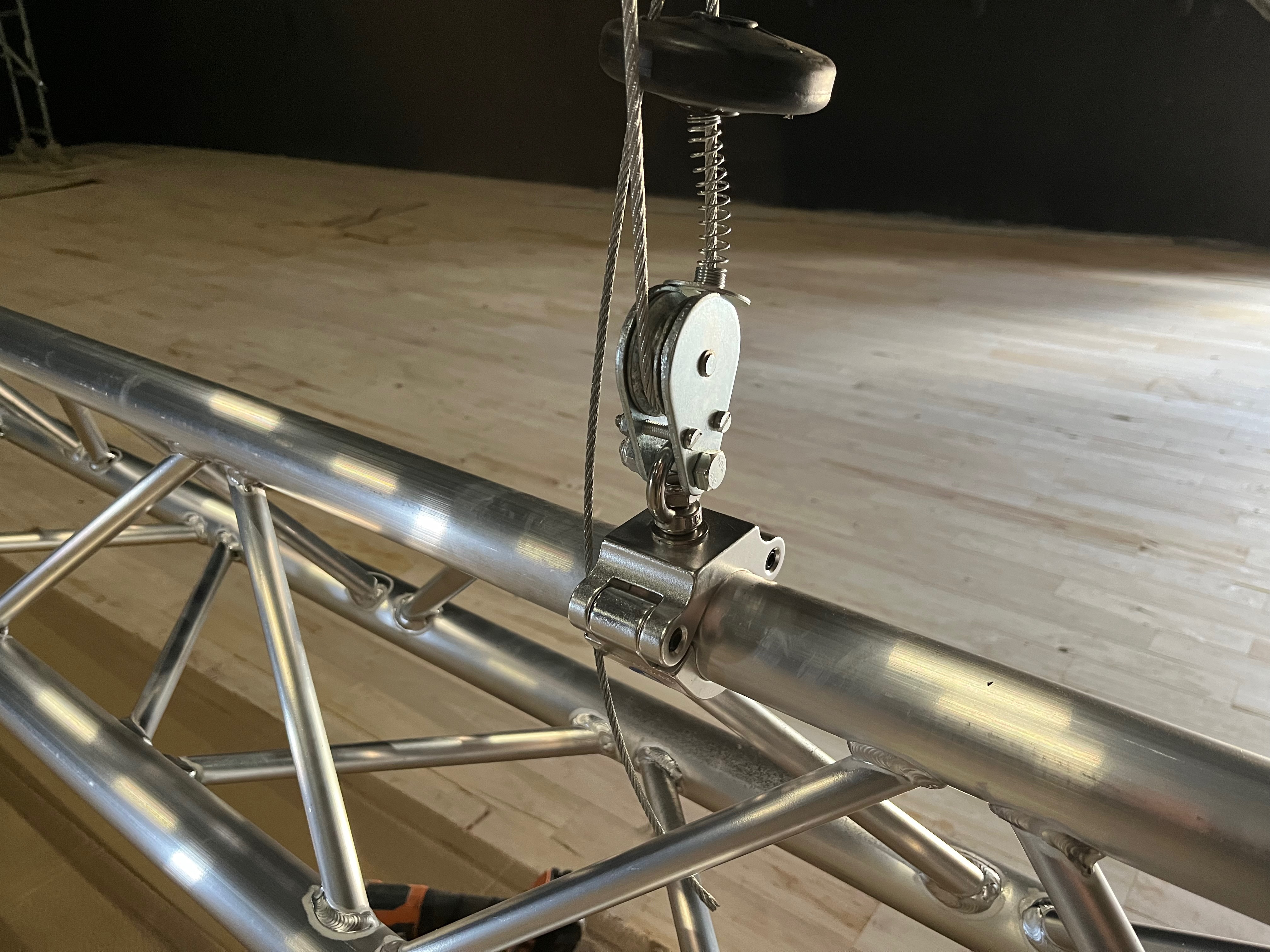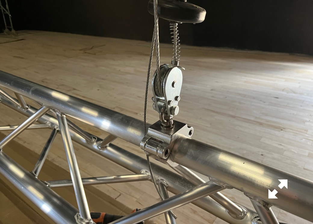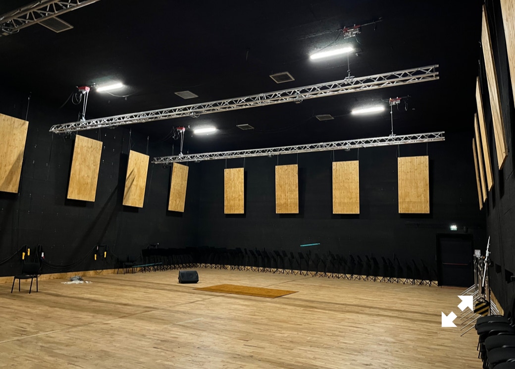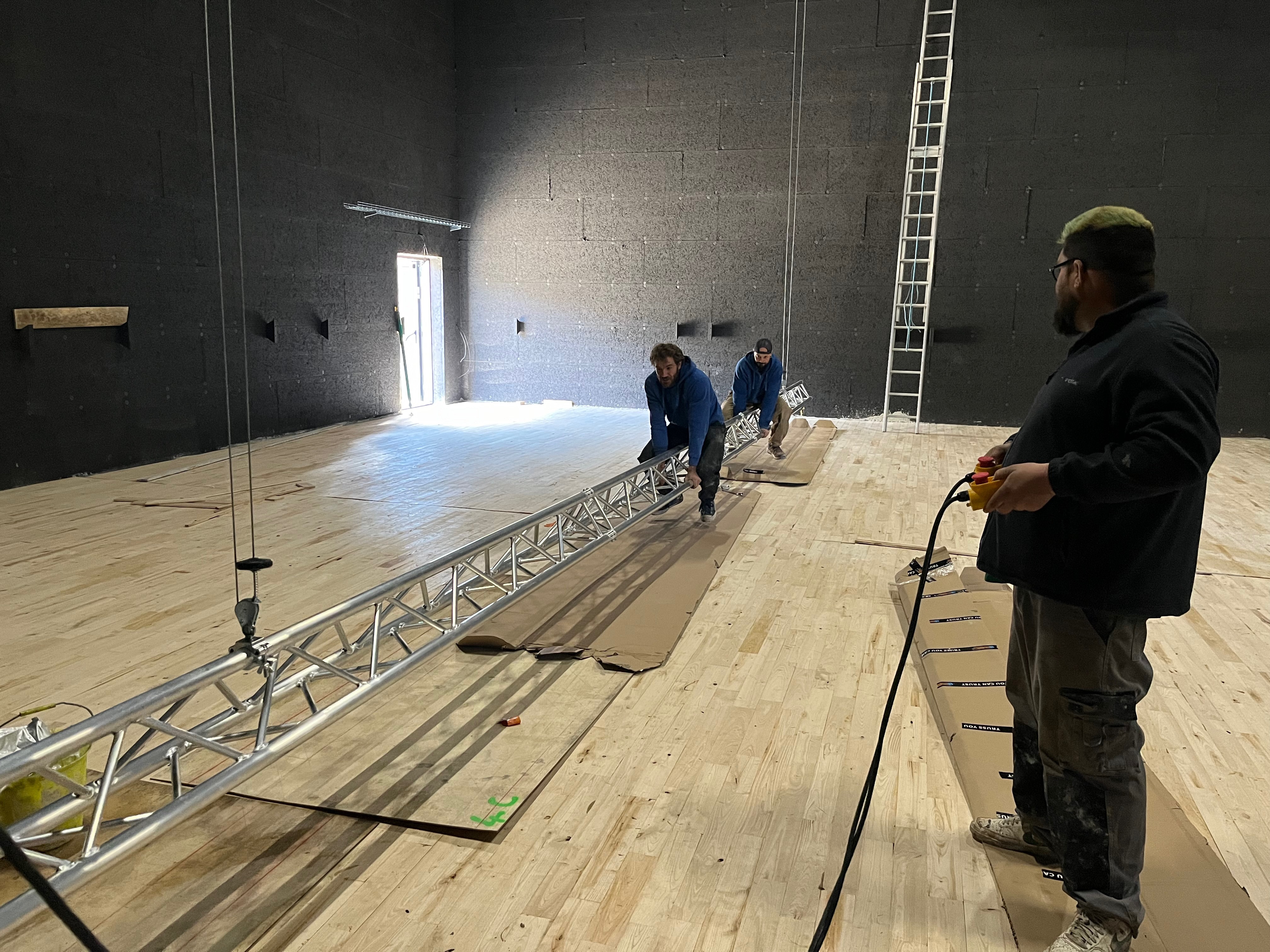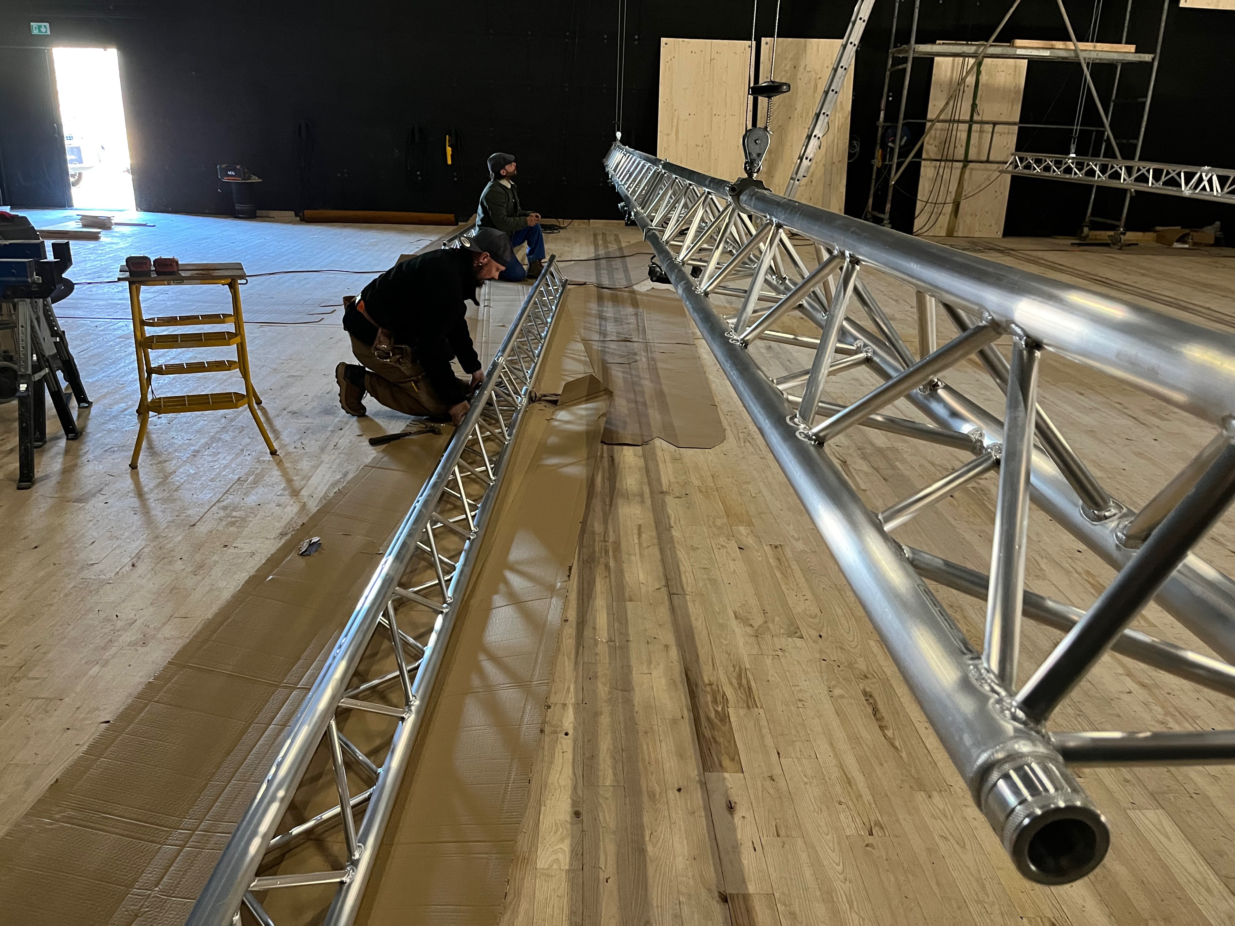 Le plateau sera équipé de 3 poutres métalliques en treillis triangulaire de 30 cm de côté et de 12 mètres de long, afin de suspendre le grill de projecteurs, les gradateurs de lumière et divers accessoires nécessaires aux installations du plateau pour l’enregistrement sonore ou le tournage d’images. Les longues poutres métalliques seront suspendues par des treuils électriques (charge maximale de 800 kg par treuil).