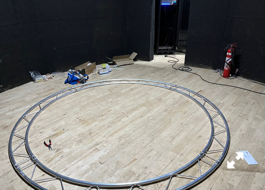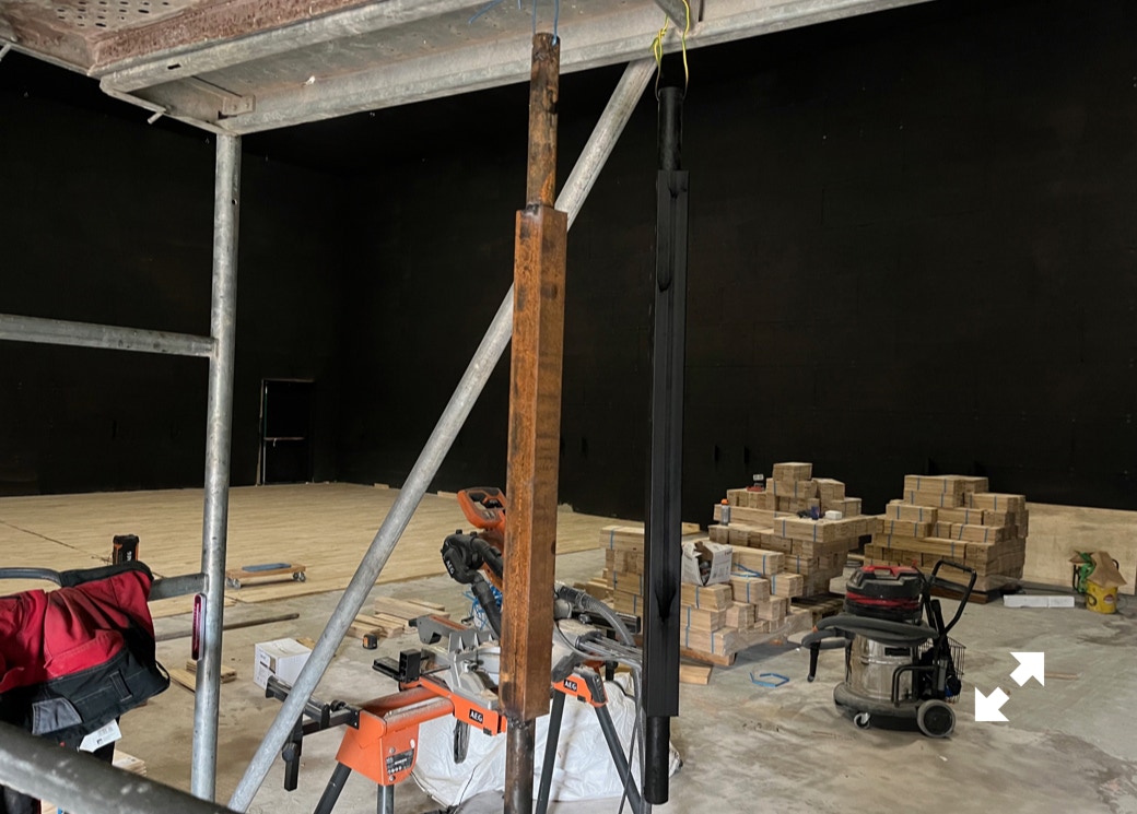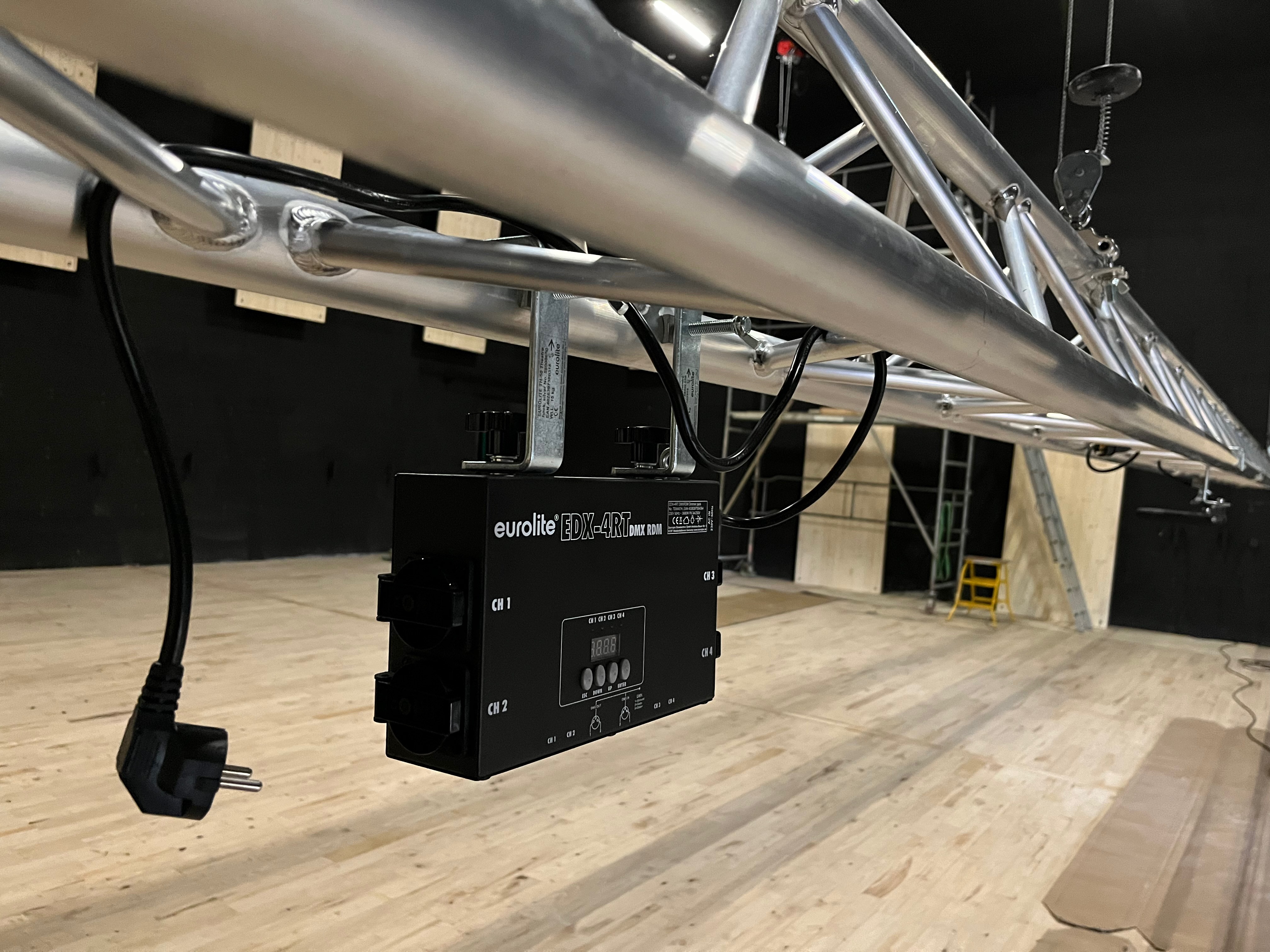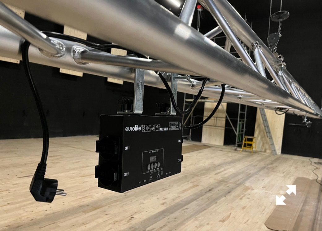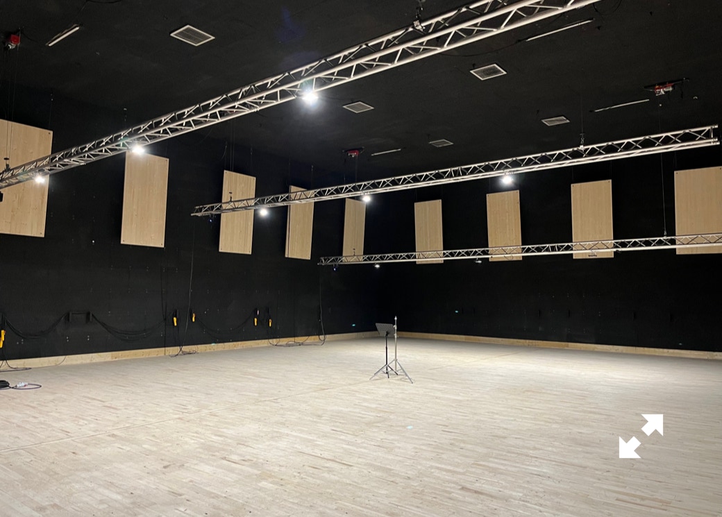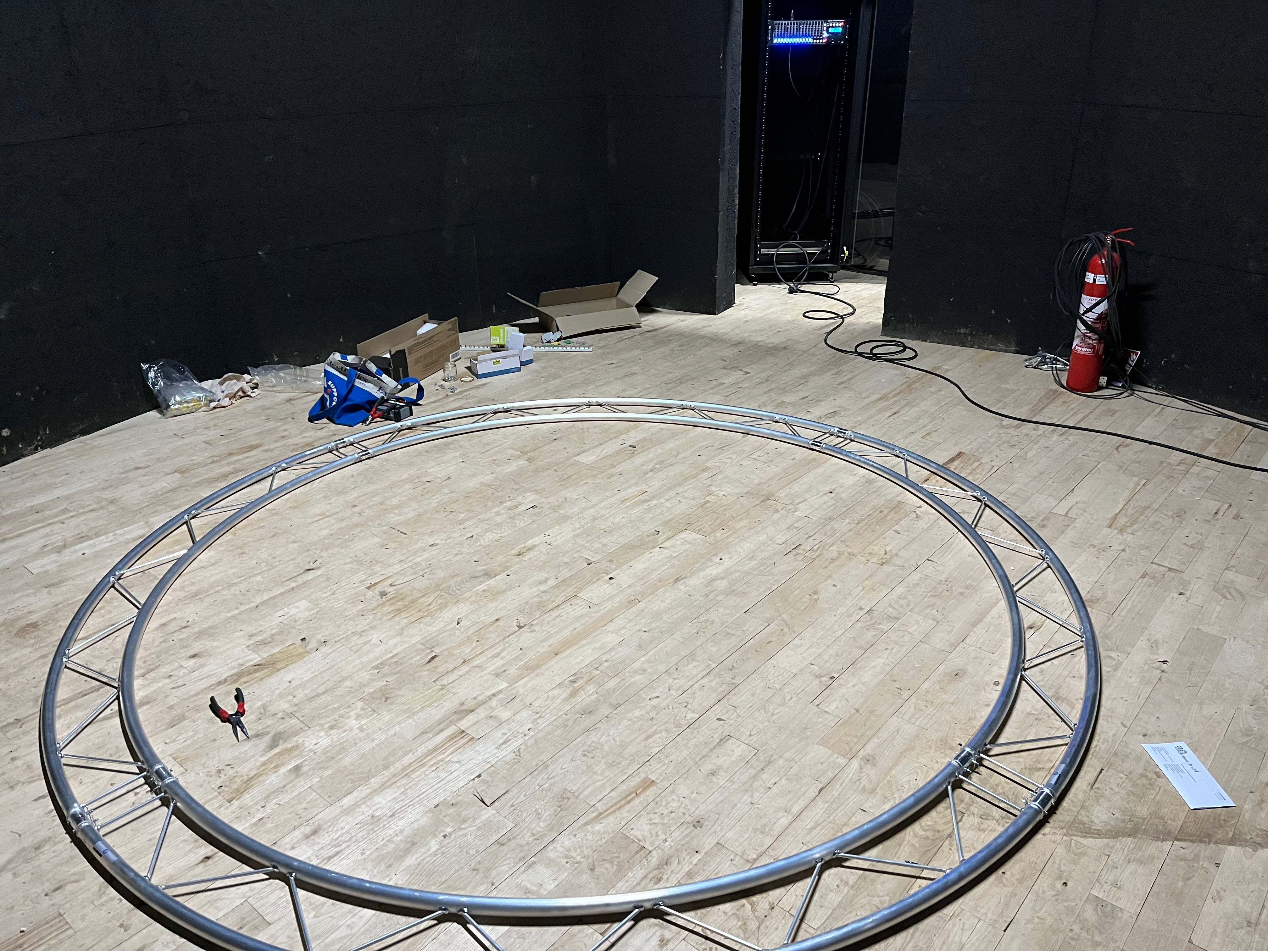 Le plateau sera équipé de 3 poutres métalliques en treillis triangulaire de 30 cm de côté et de 12 mètres de long, afin de suspendre le grill de projecteurs, les gradateurs de lumière et divers accessoires nécessaires aux installations du plateau pour l’enregistrement sonore ou le tournage d’images. Les longues poutres métalliques seront suspendues par des treuils électriques (charge maximale de 800 kg par treuil).