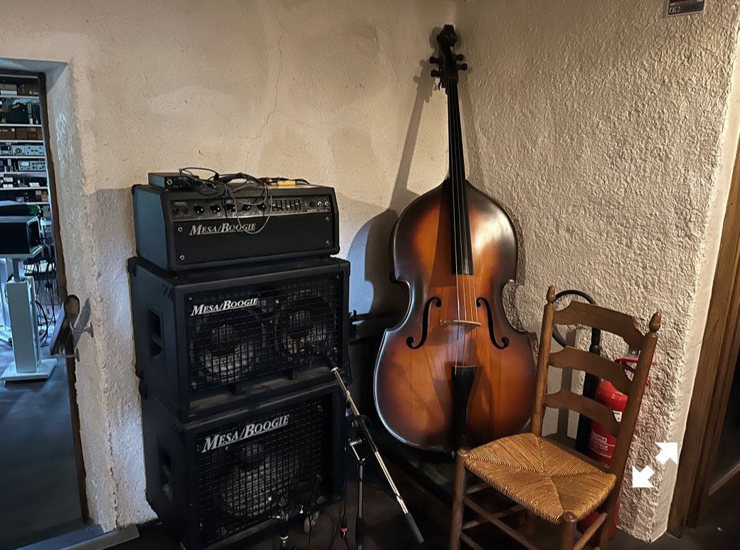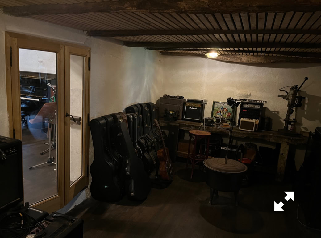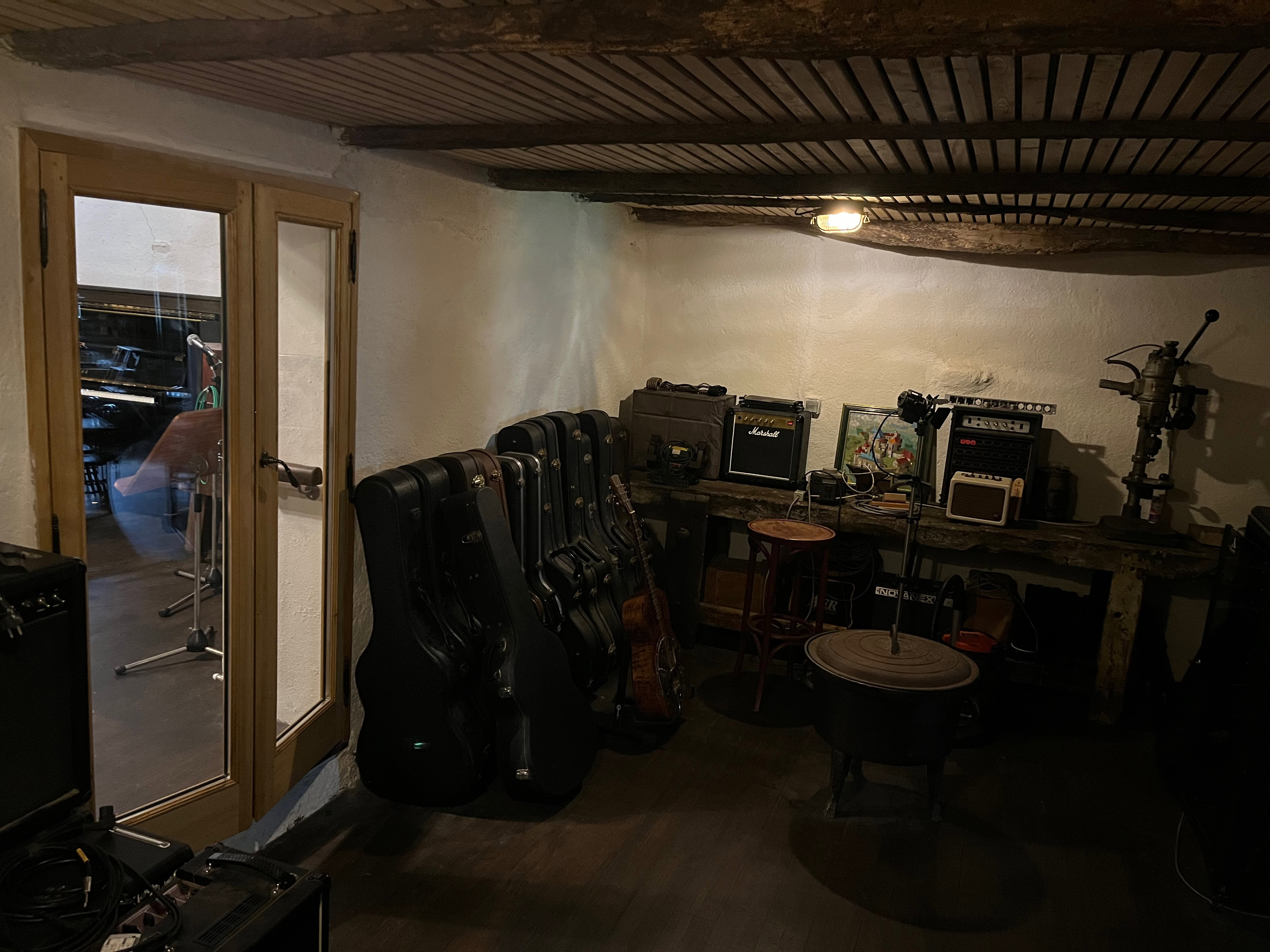 Une petite pièce de 15 m2 sur 2,25 m de hauteur, traitée en acoustique, abrite essentiellement des guitares acoustiques et électriques, des amplificateurs de guitares et de basse, une contrebasse.